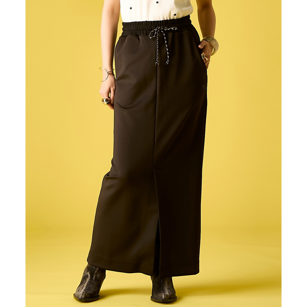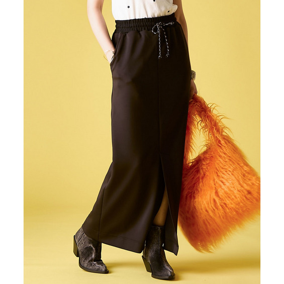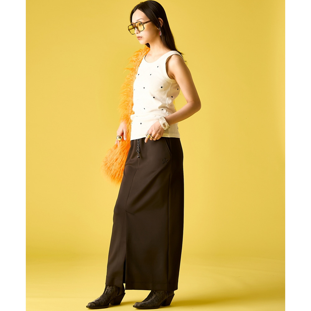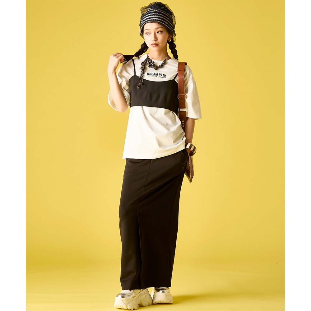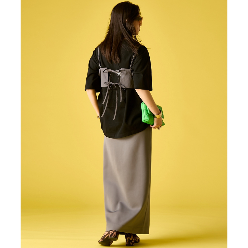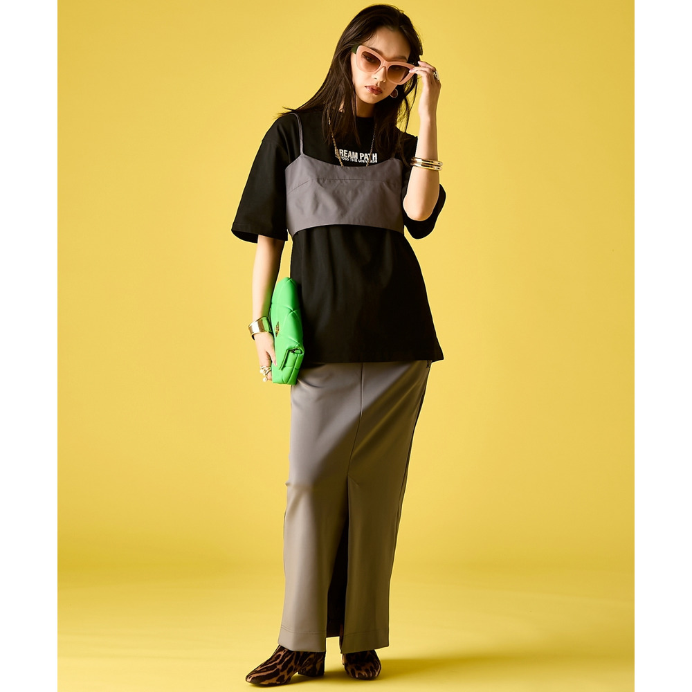 Street Mode Layered:ロゴTシャツの上にビスチェを重ね、このスカートで下半身をシャープに引き締めて。