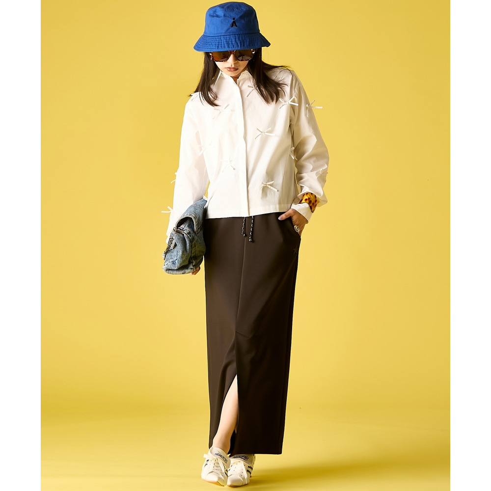 ウエストのドロストをリンクさせ、足元にボリュームスニーカーを投入すれば、都会的で洗練されたストリートモードが完成します。