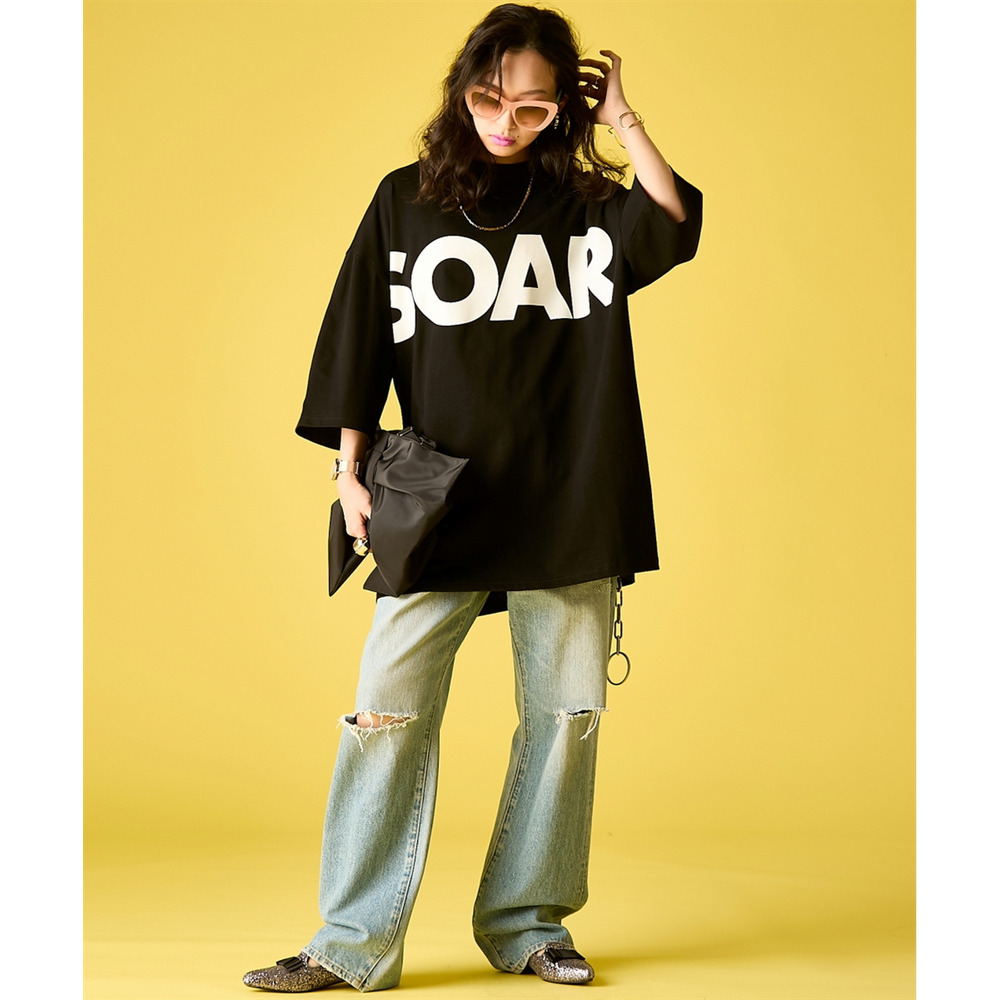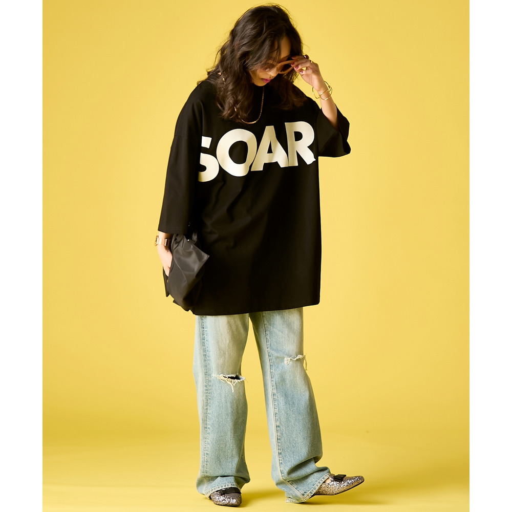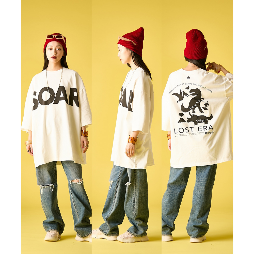 90's Grunge Vibe:バックプリントを主役にして、ルーズなダメージデニムをコーディネート。