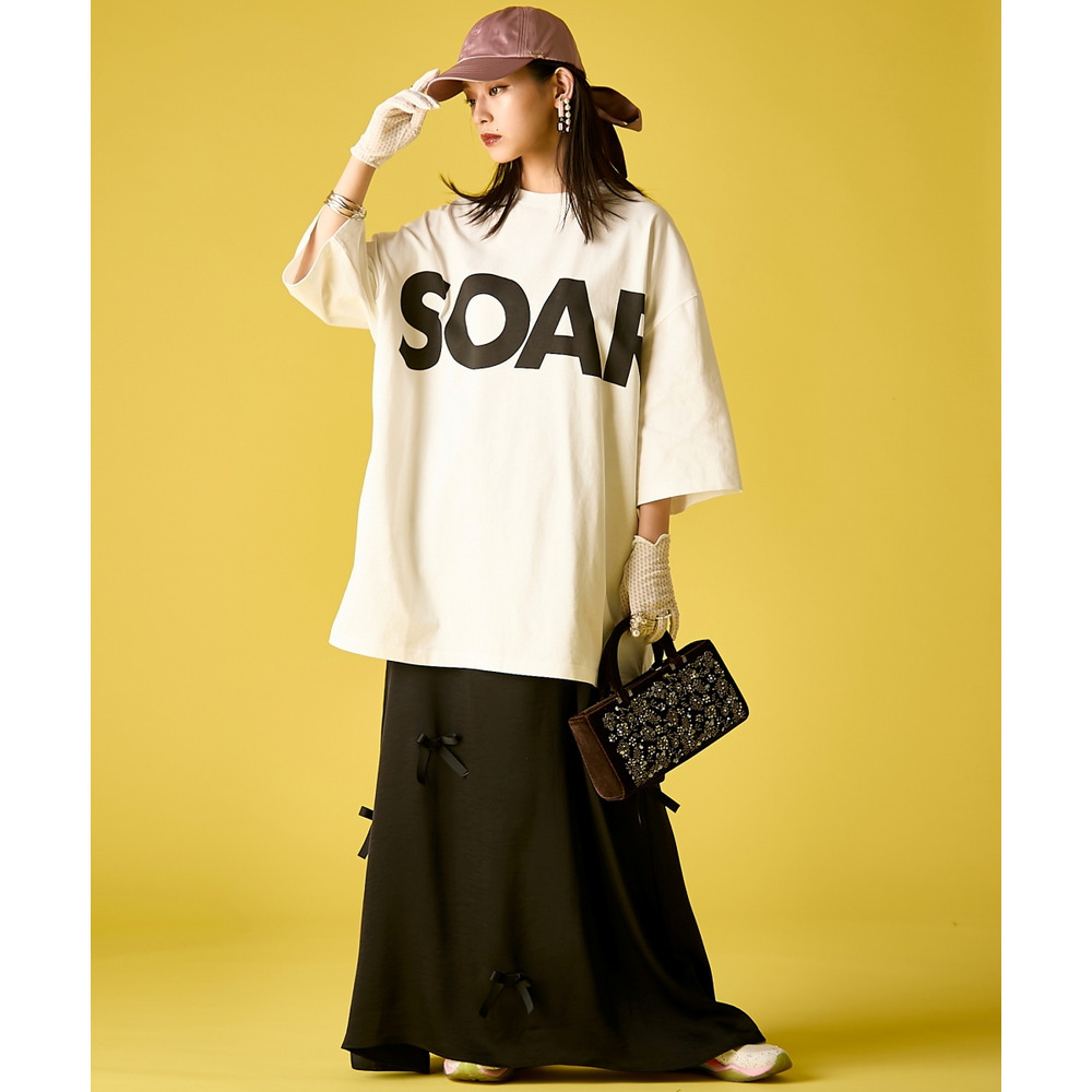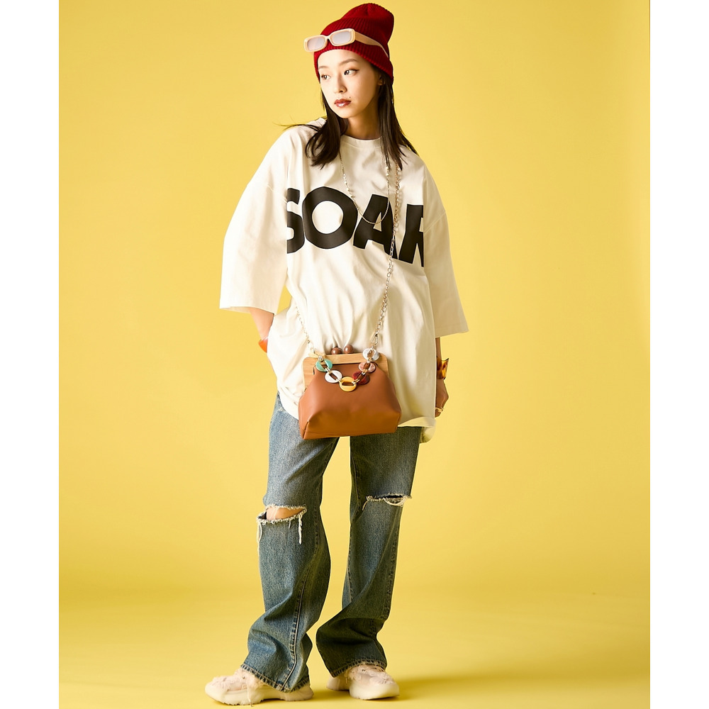 首元にシルクスカーフを巻いたり、クリアバッグを添えたりすることで、無骨なビッグTシャツを女性らしく昇華させた都会的なミックススタイルが完成します。