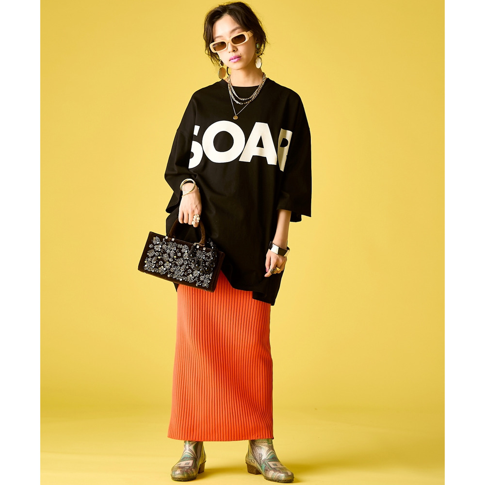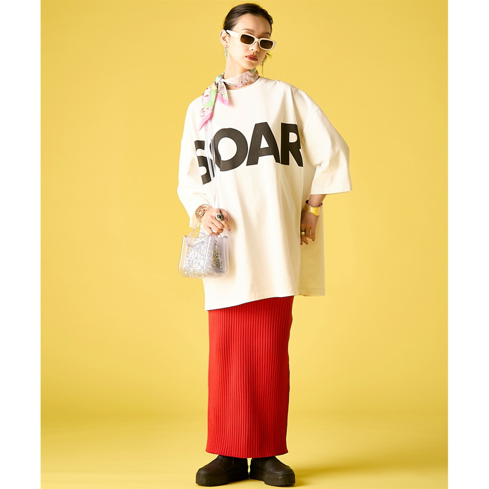 Vivid Feminine Mix:ロゴTを鮮やかなレッドやピンクのリブマキシスカートにオン。