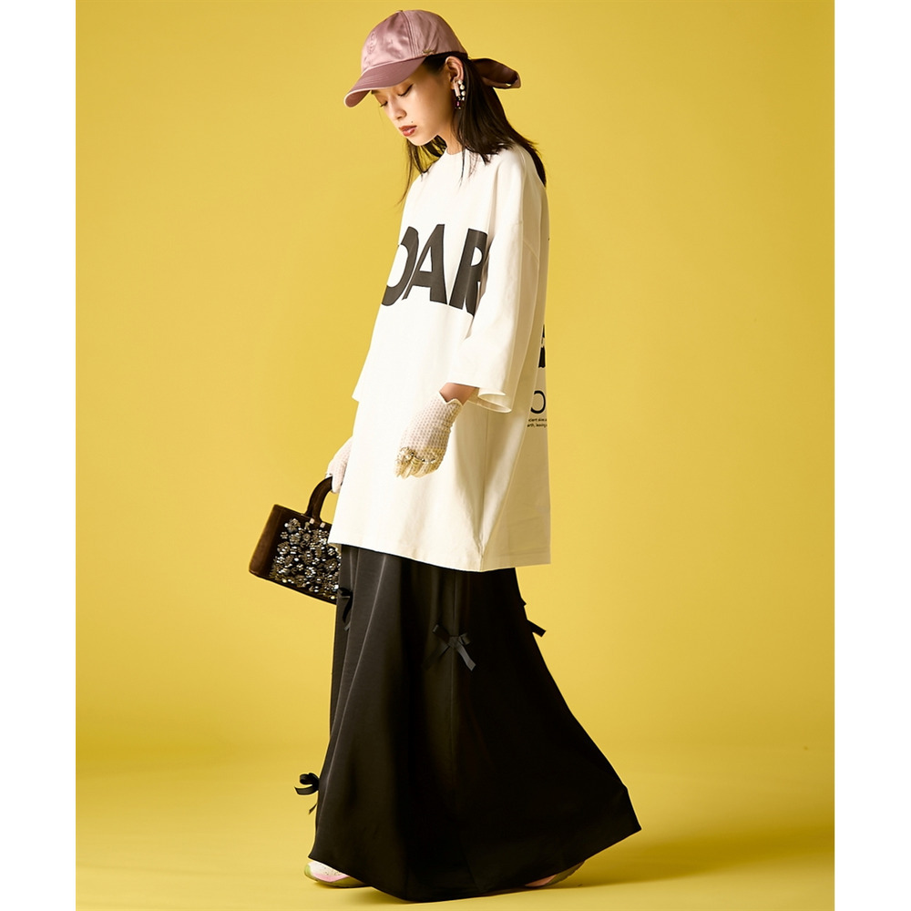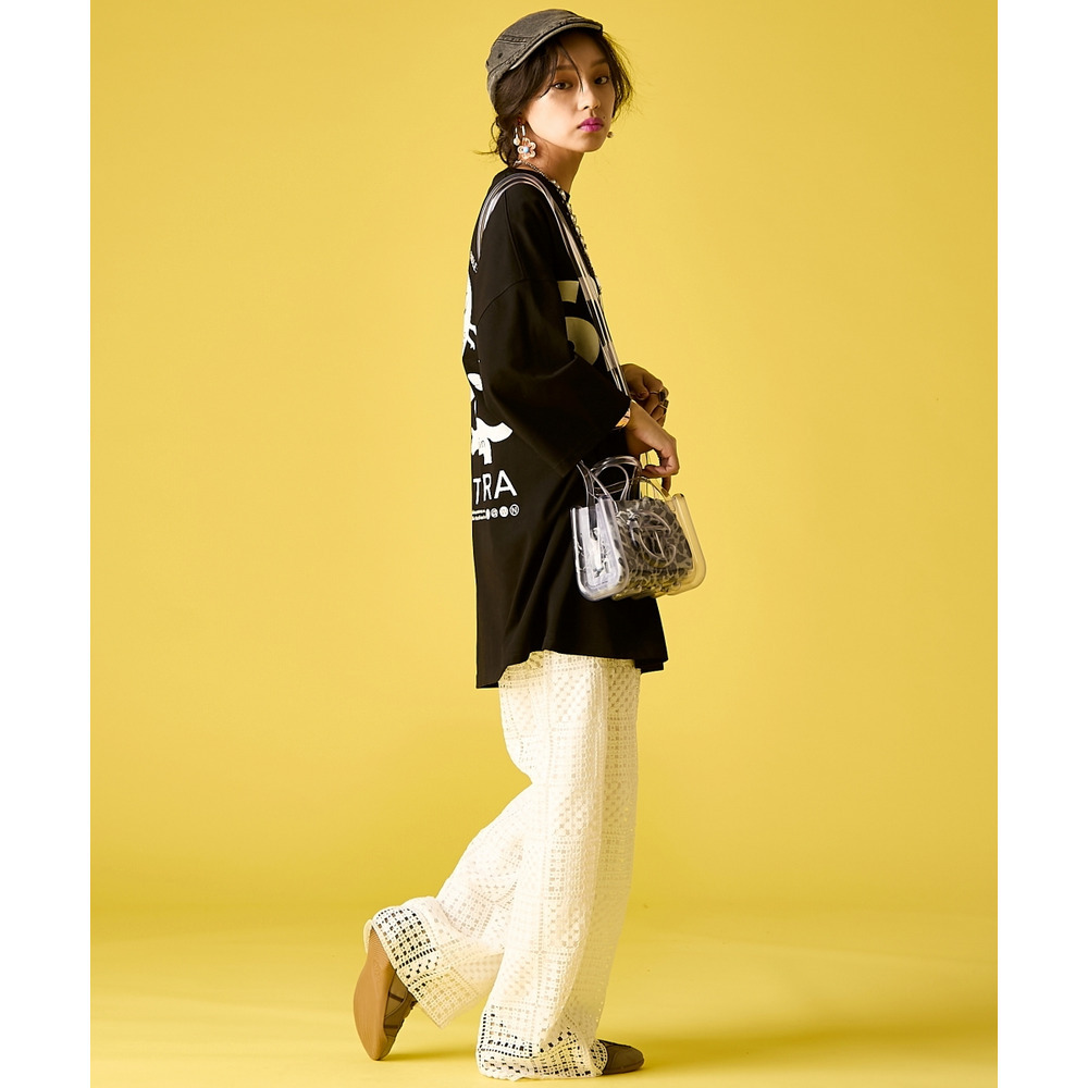 Edgy Lace Layered:ブラックのロゴTを主役に、白のレースパンツをレイヤード。