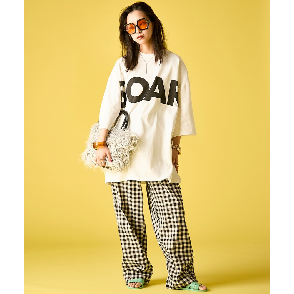Street Monochrome Pattern:ホワイトのビッグロゴTに、モノトーンのギンガムチェックワイドパンツを合わせて。