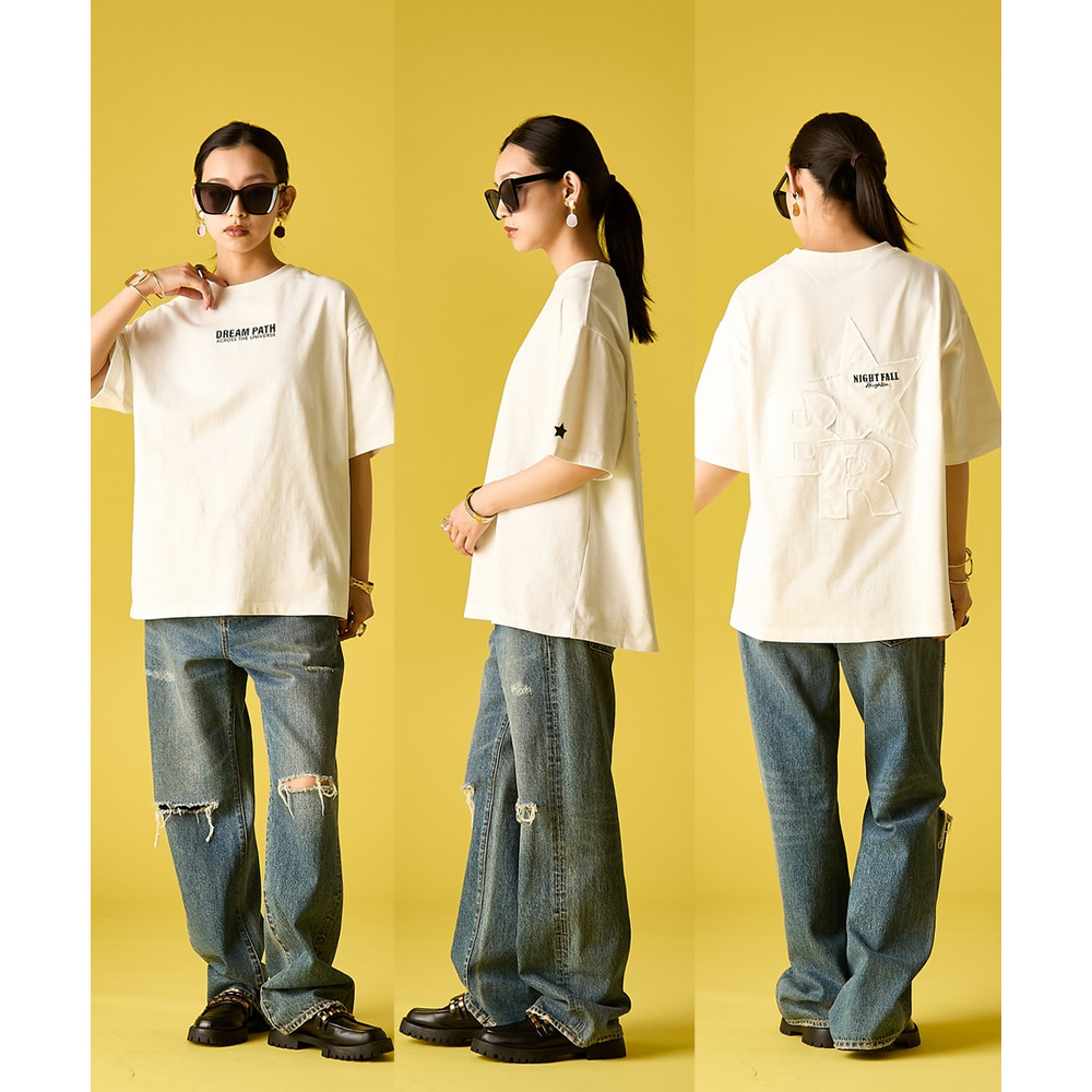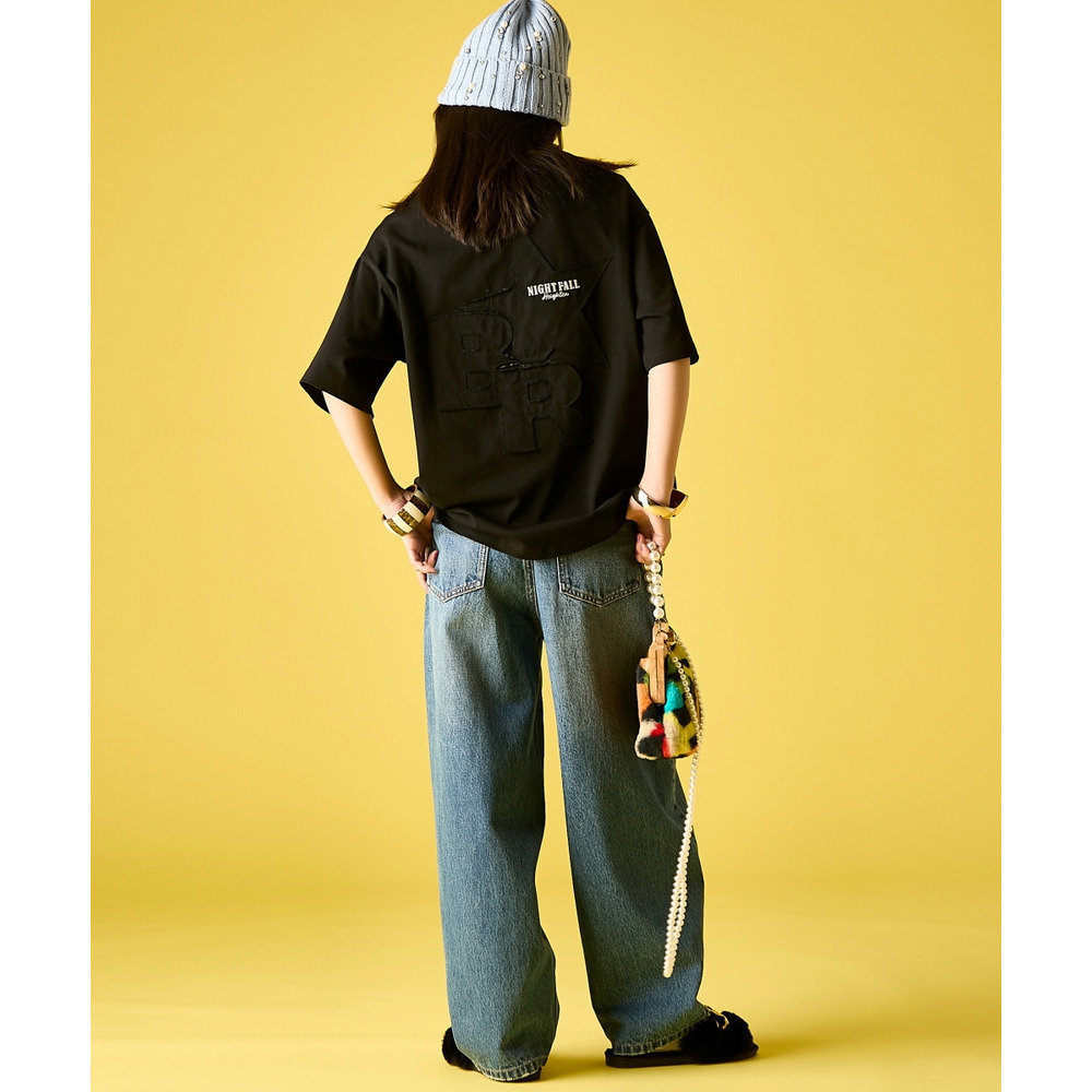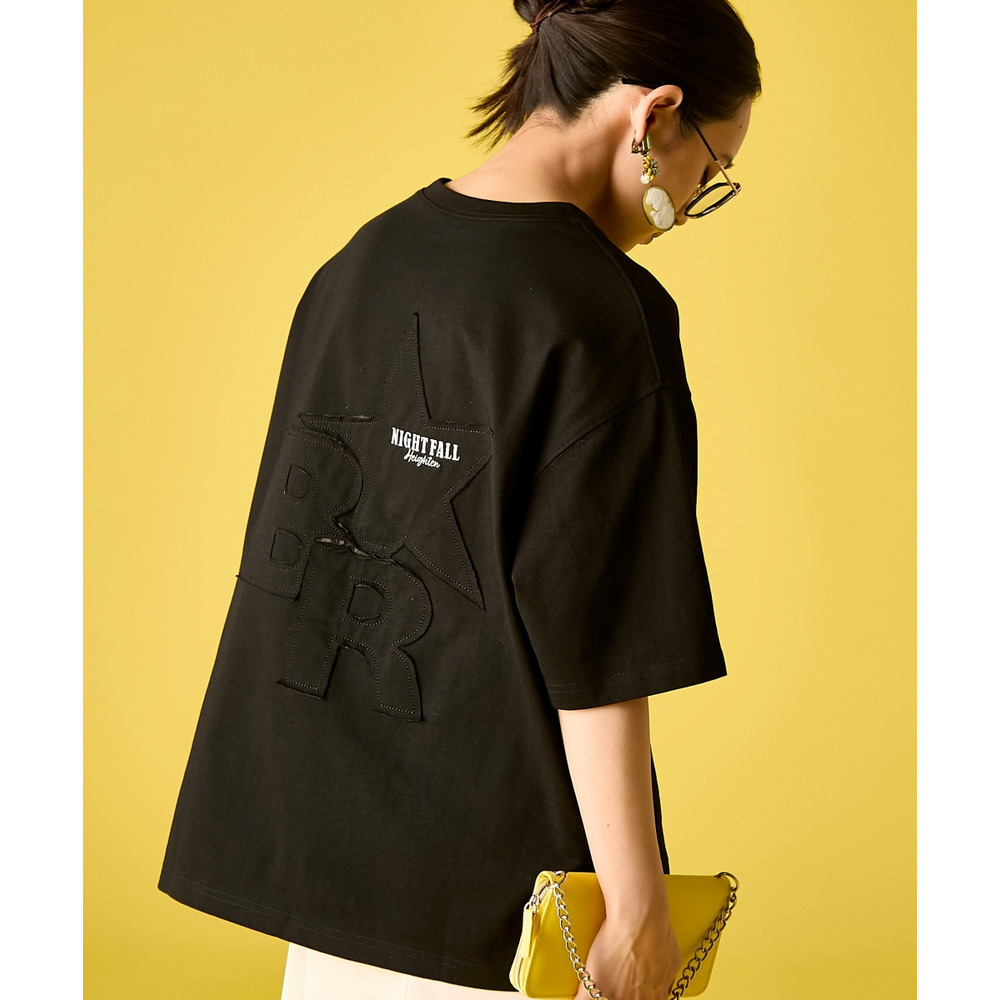背面には、ブランドの象徴である大きな星と、切りっぱなしのラフな質感が魅力の文字をパッチワークで配置。
