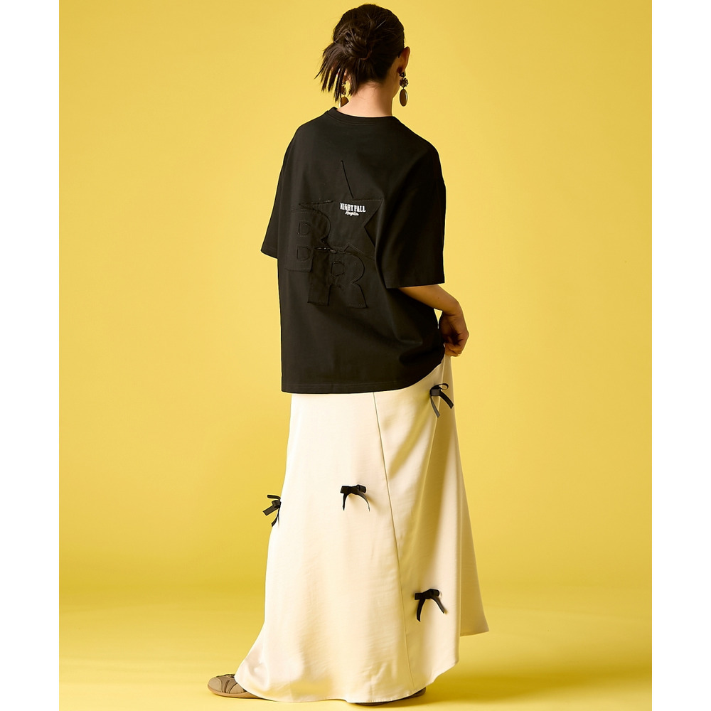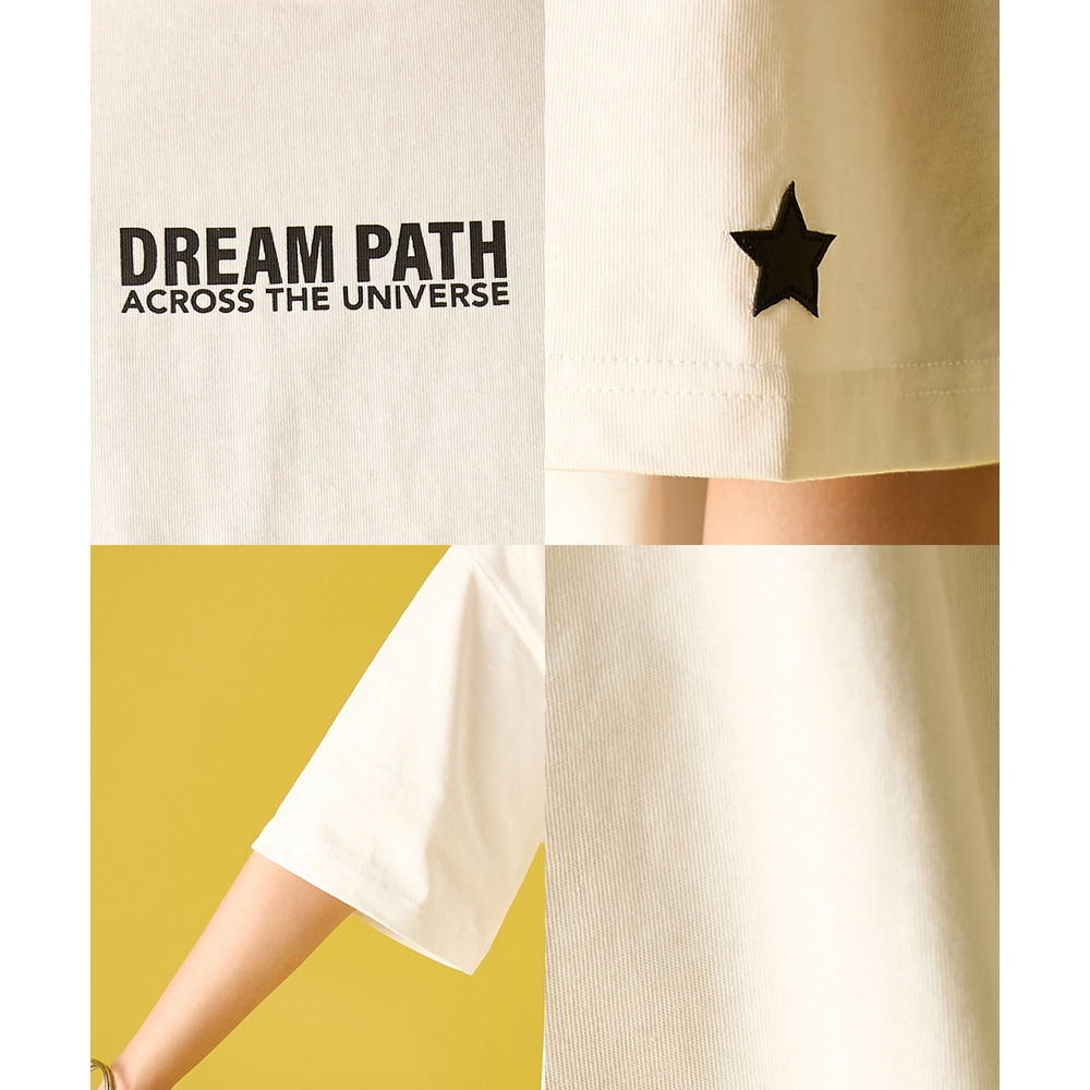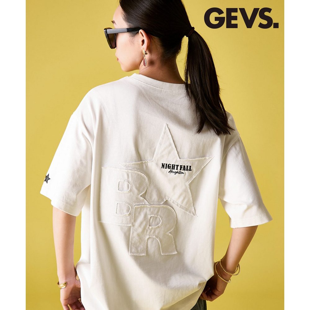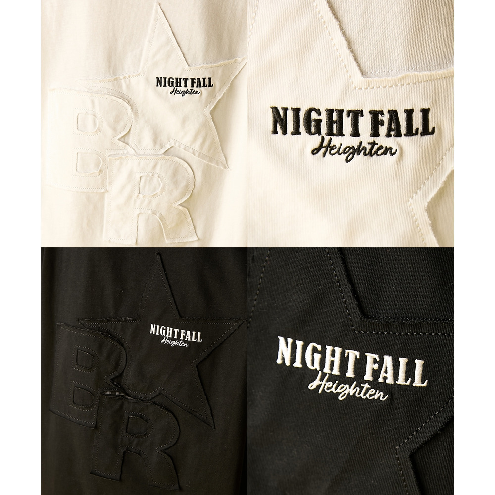 背面には、ブランドの象徴である大きな星と、切りっぱなしのラフな質感が魅力の文字をパッチワークで配置。
