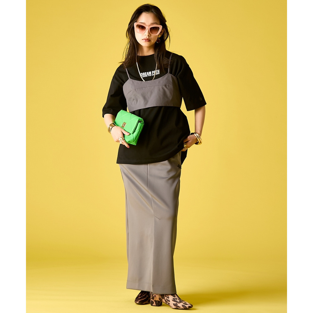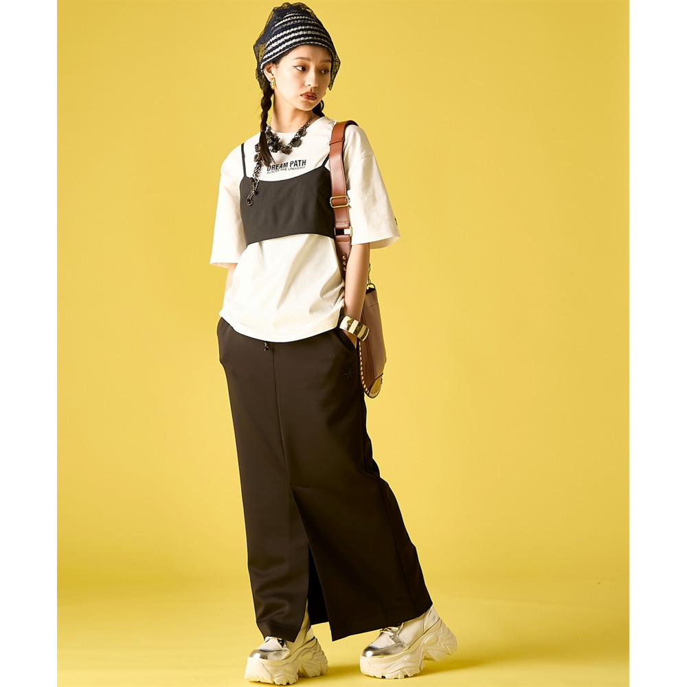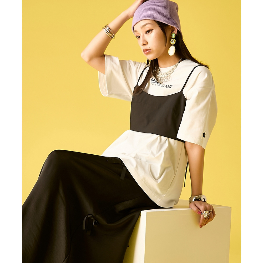 無骨なTシャツと甘いボトムスのコントラストが、大人の遊び心溢れるストリートモードを演出します。