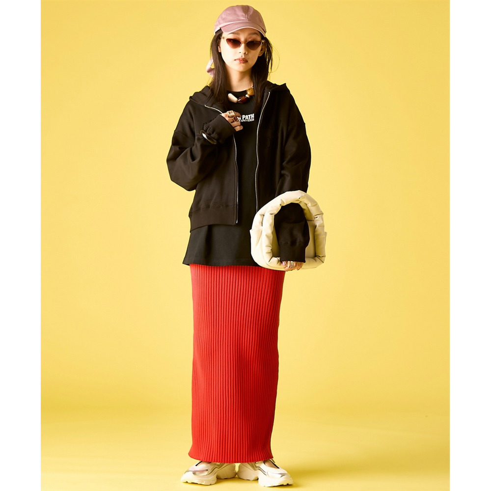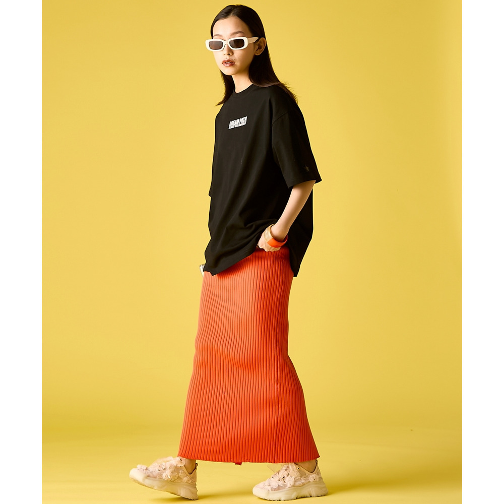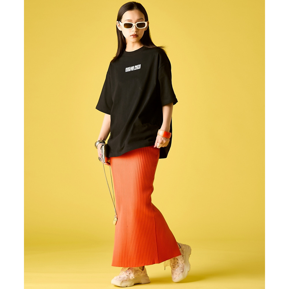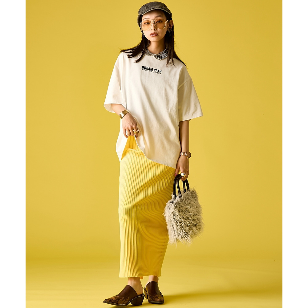 Iconic Pop Street:ホワイトのTシャツに、鮮やかなイエローのリブマキシスカートを合わせたカラーコーディネート。