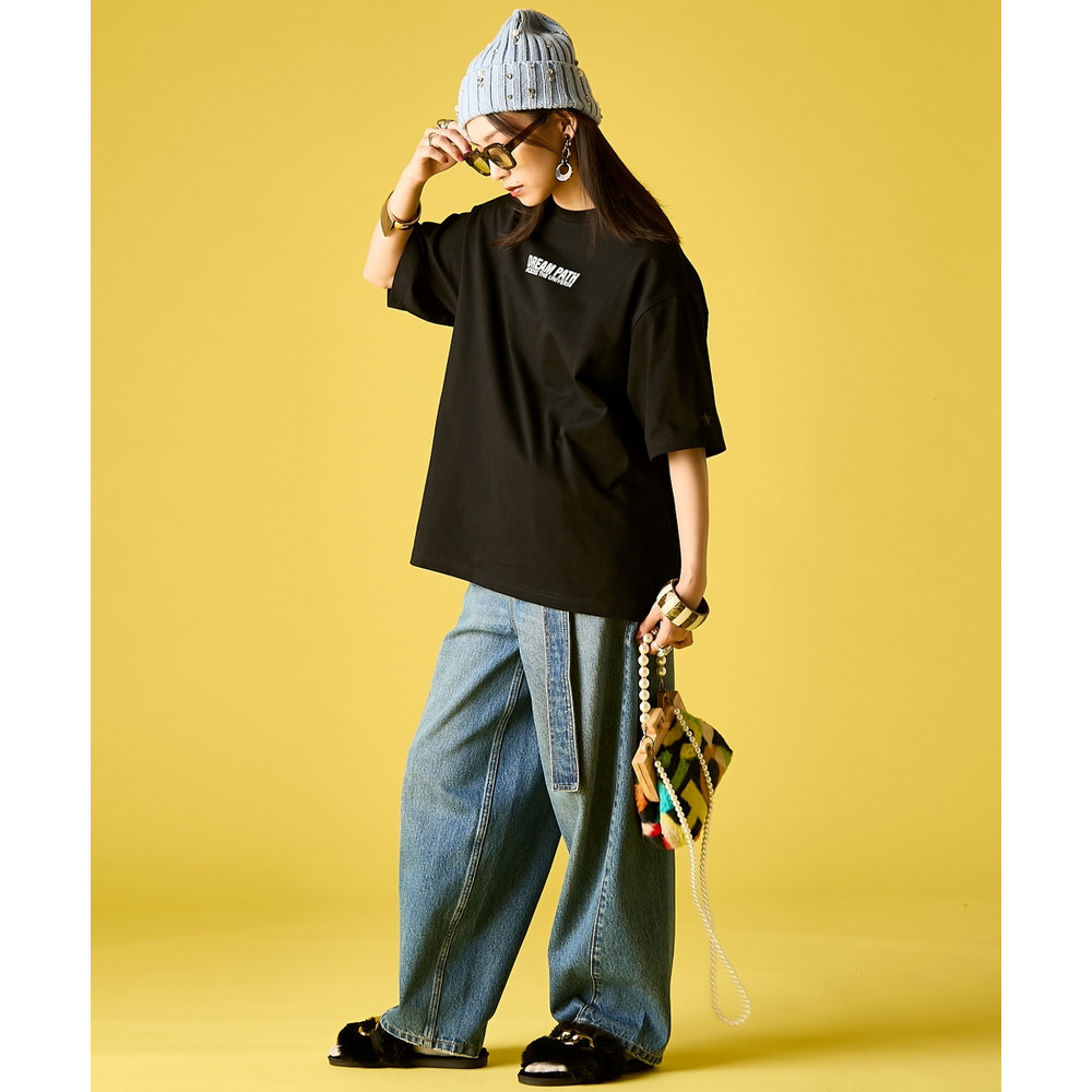 90's Grunge Mood:ブラックのTシャツを主役に、ルーズなワイドデニムをコーディネート。