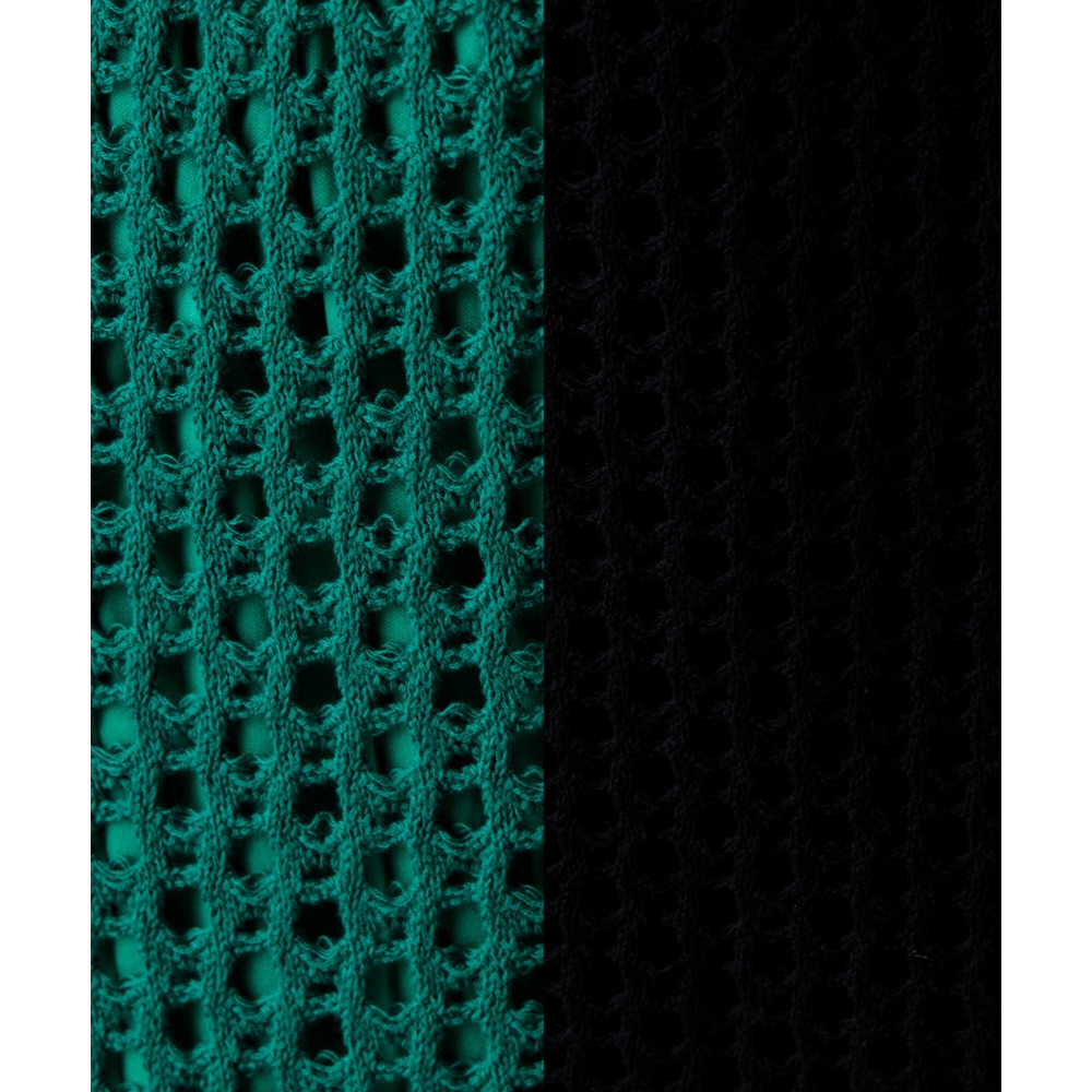 幾何学的な編み模様が、肌やボトムレイヤードを美しく透かし、コーディネートに奥行きを与えます。