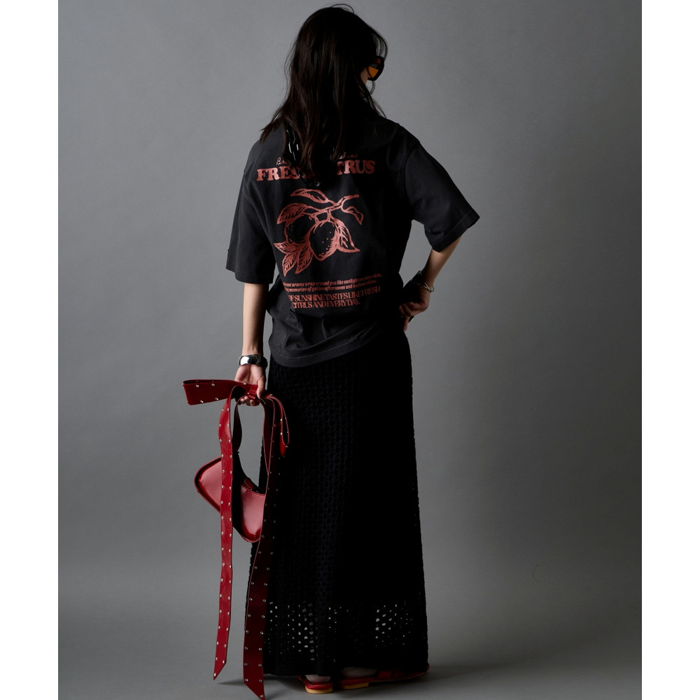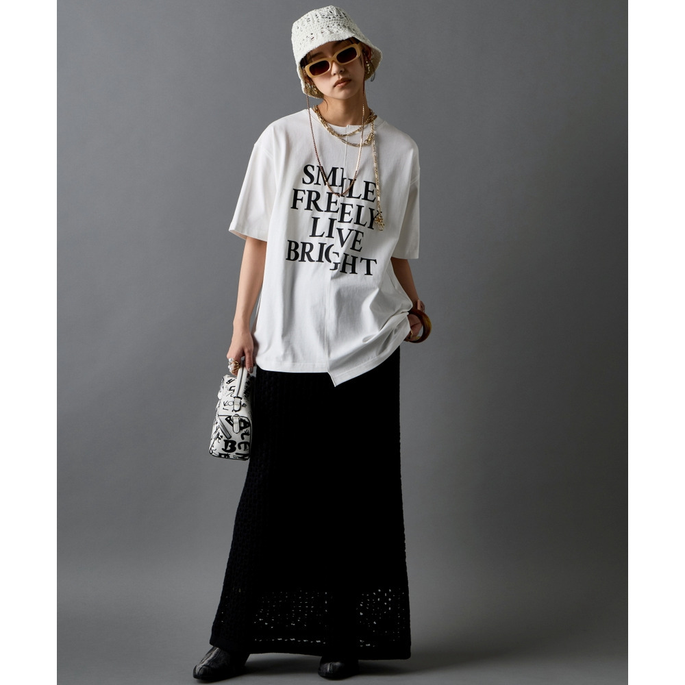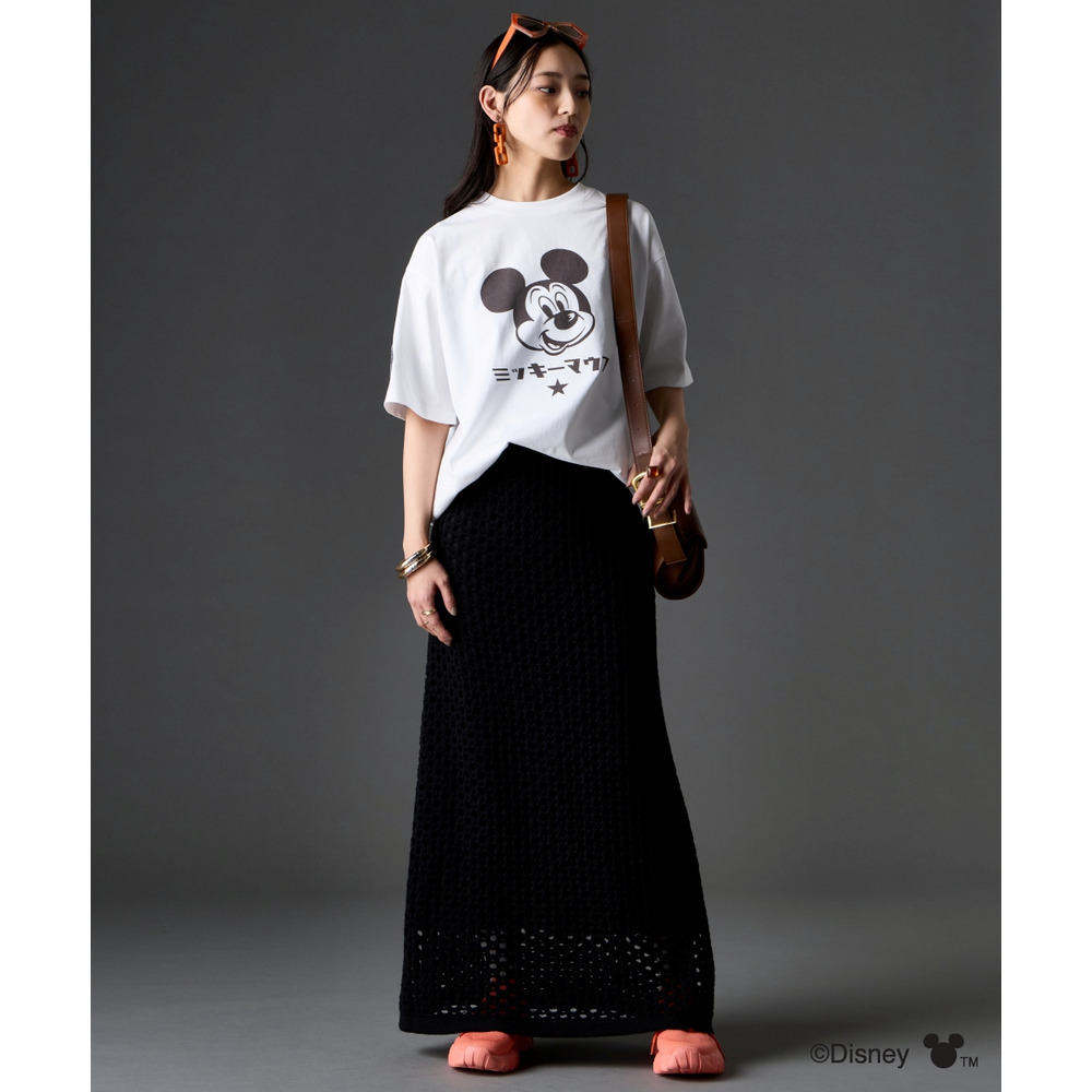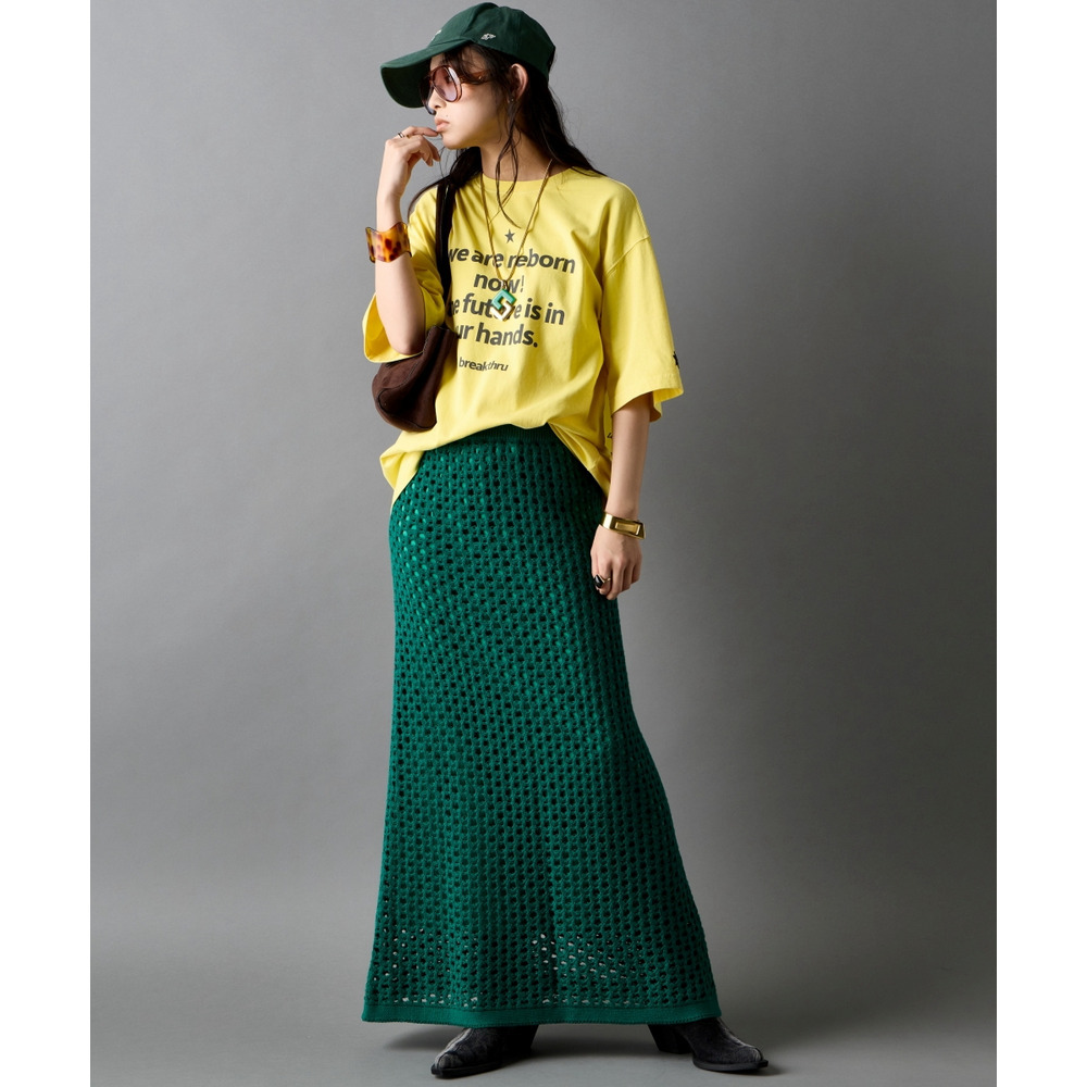 Tシャツをフロントインして、スカートのシルエットを際立たせるのがコツ。