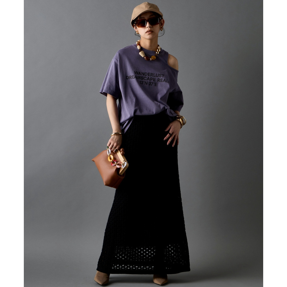 Shoulder-Cut Nuance:肩開きのカットオフTシャツを合わせた、さりげない肌見せが光るモードスタイル。