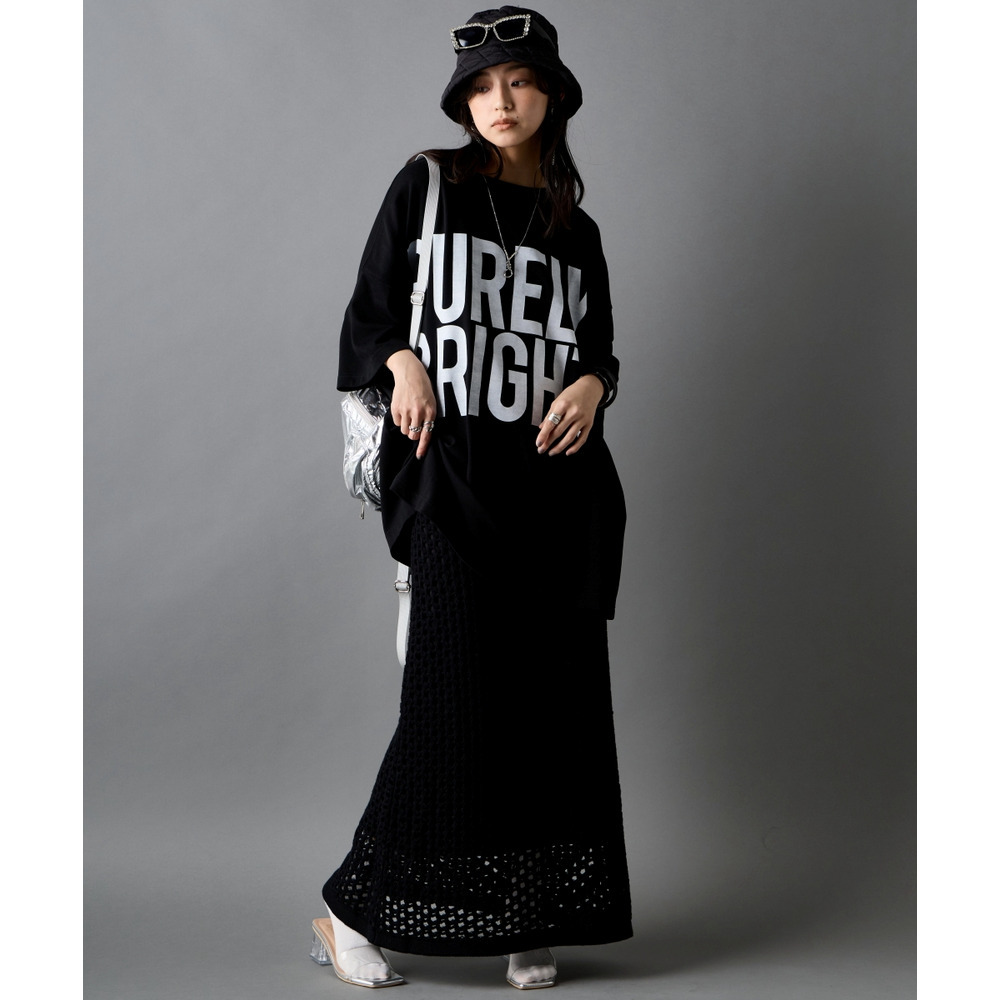 トップスの圧倒的なボリュームを、スカートのナローラインがスマートに引き締めます。