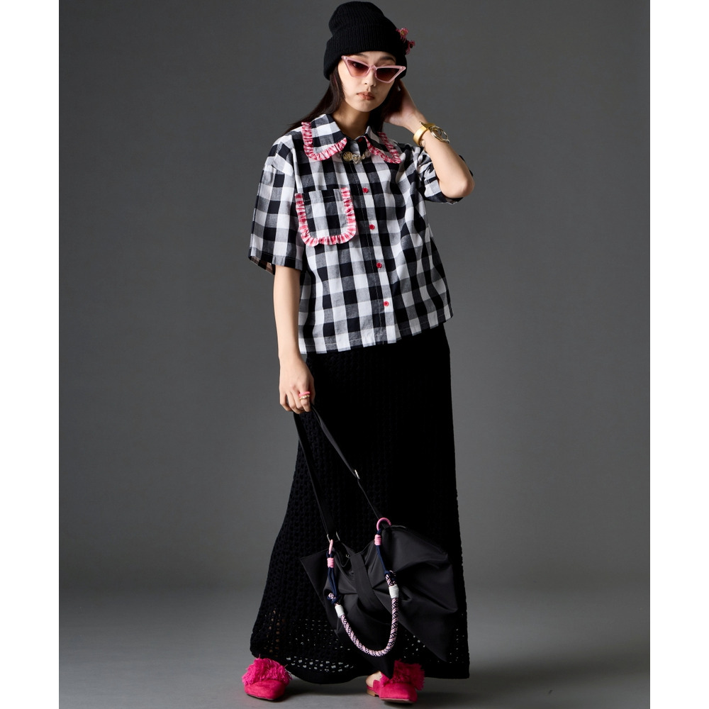 High-Street Gingham Pop:フリル使いのギンガムチェックシャツを合わせた、ガーリー×ストリートのミックスコーデ。