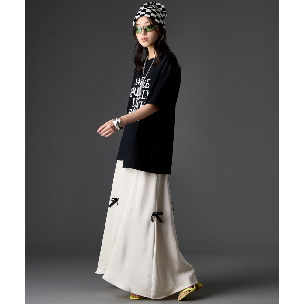 ナロースカートやフレアスカートなど、女性らしいボトムスを合わせた甘辛ミックスなスタイルがおすすめです。