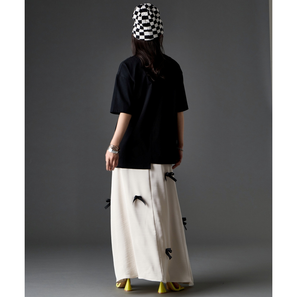左右で着丈を変えたアシンメトリーなヘムラインが、歩くたびにリズムのあるシルエットを演出。