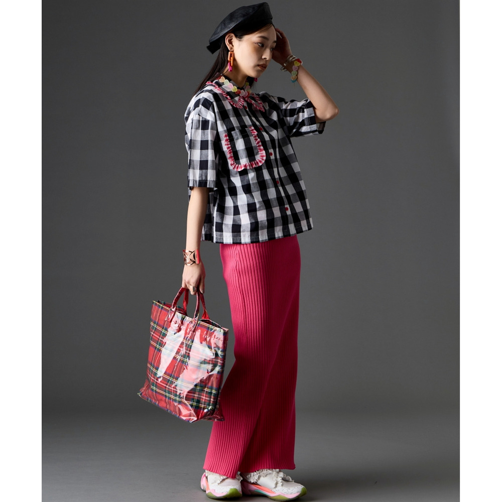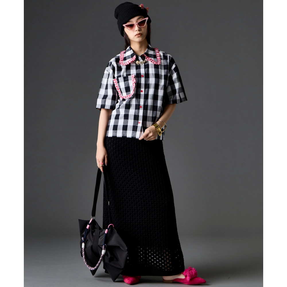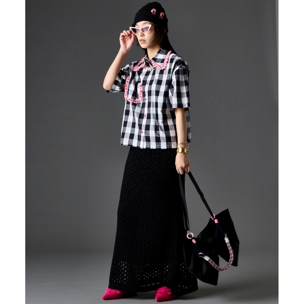 チェック柄とクロシェ風の編み地という「柄×素材」の衝突が、唯一無二の存在感を放ちます。