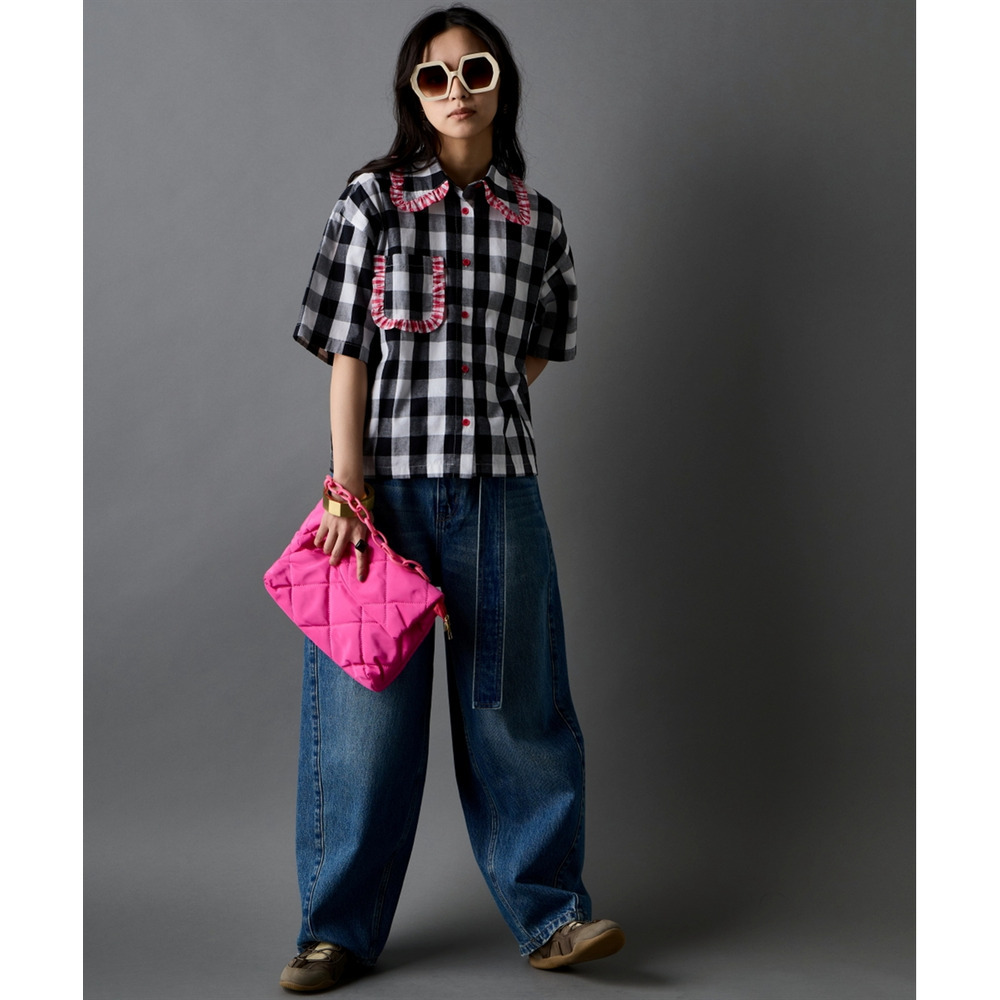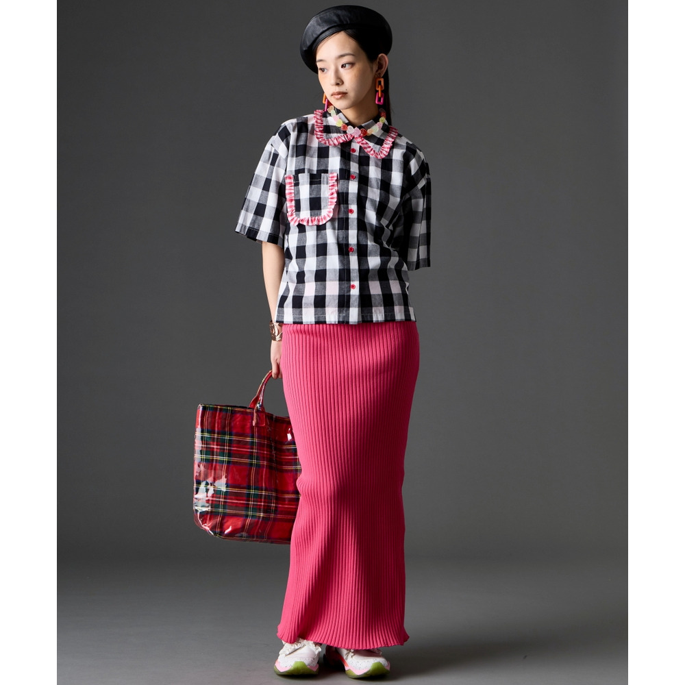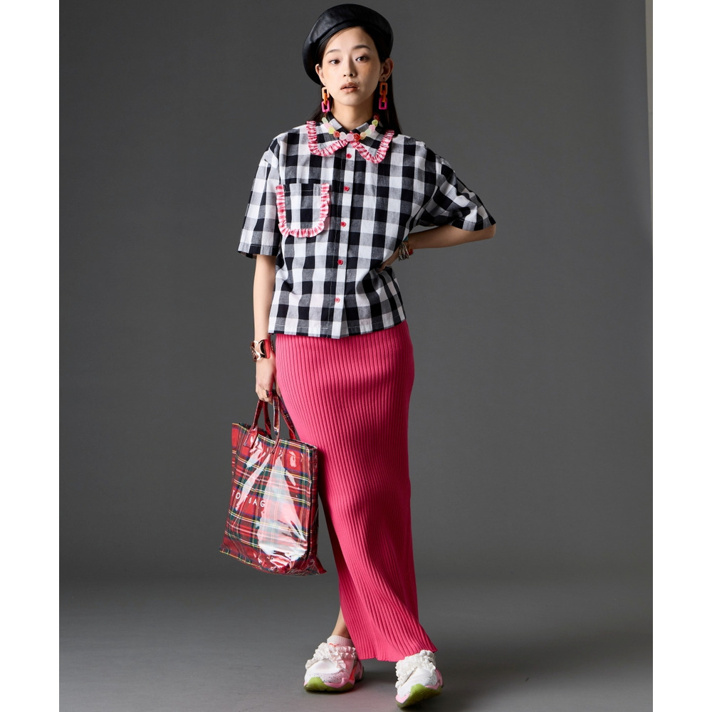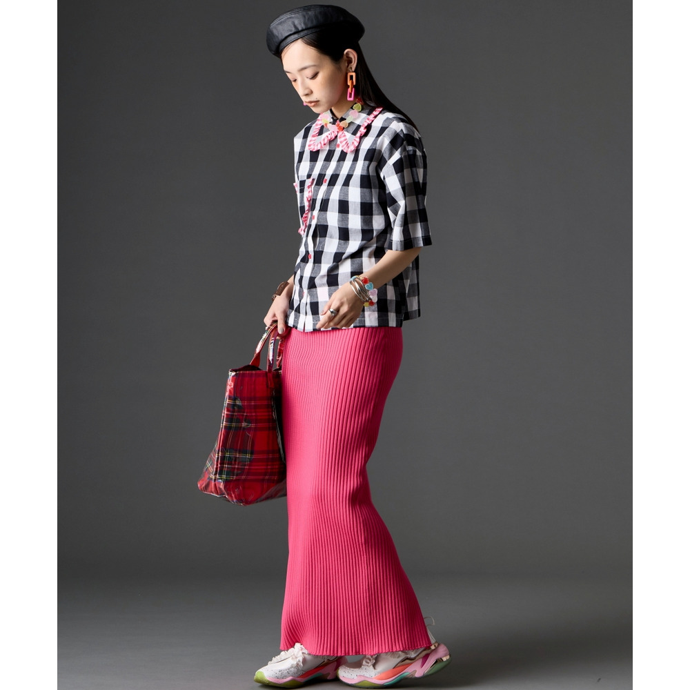 チェック柄とクロシェ風の編み地という「柄×素材」の衝突が、唯一無二の存在感を放ちます。