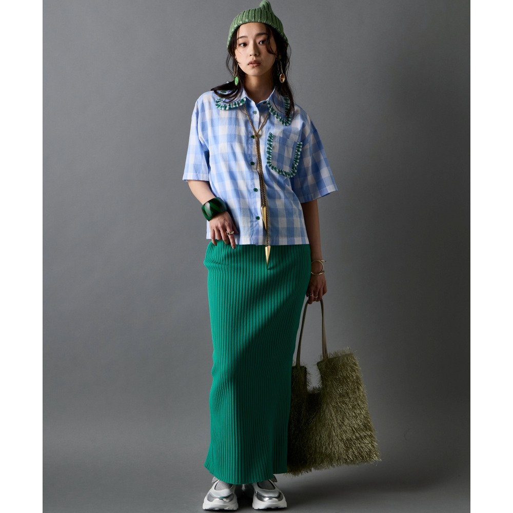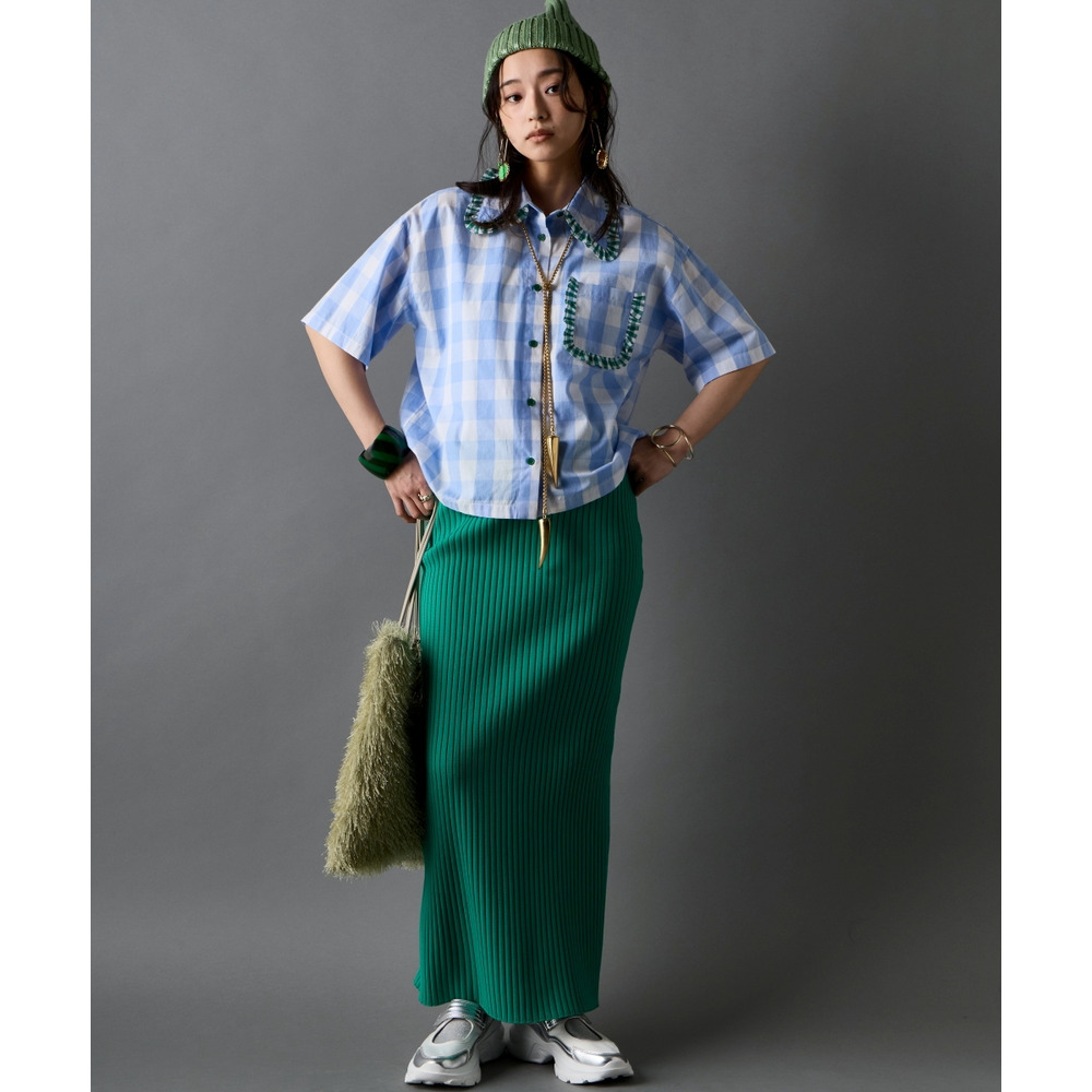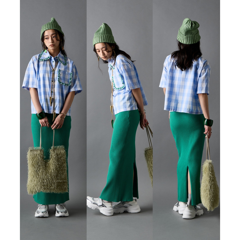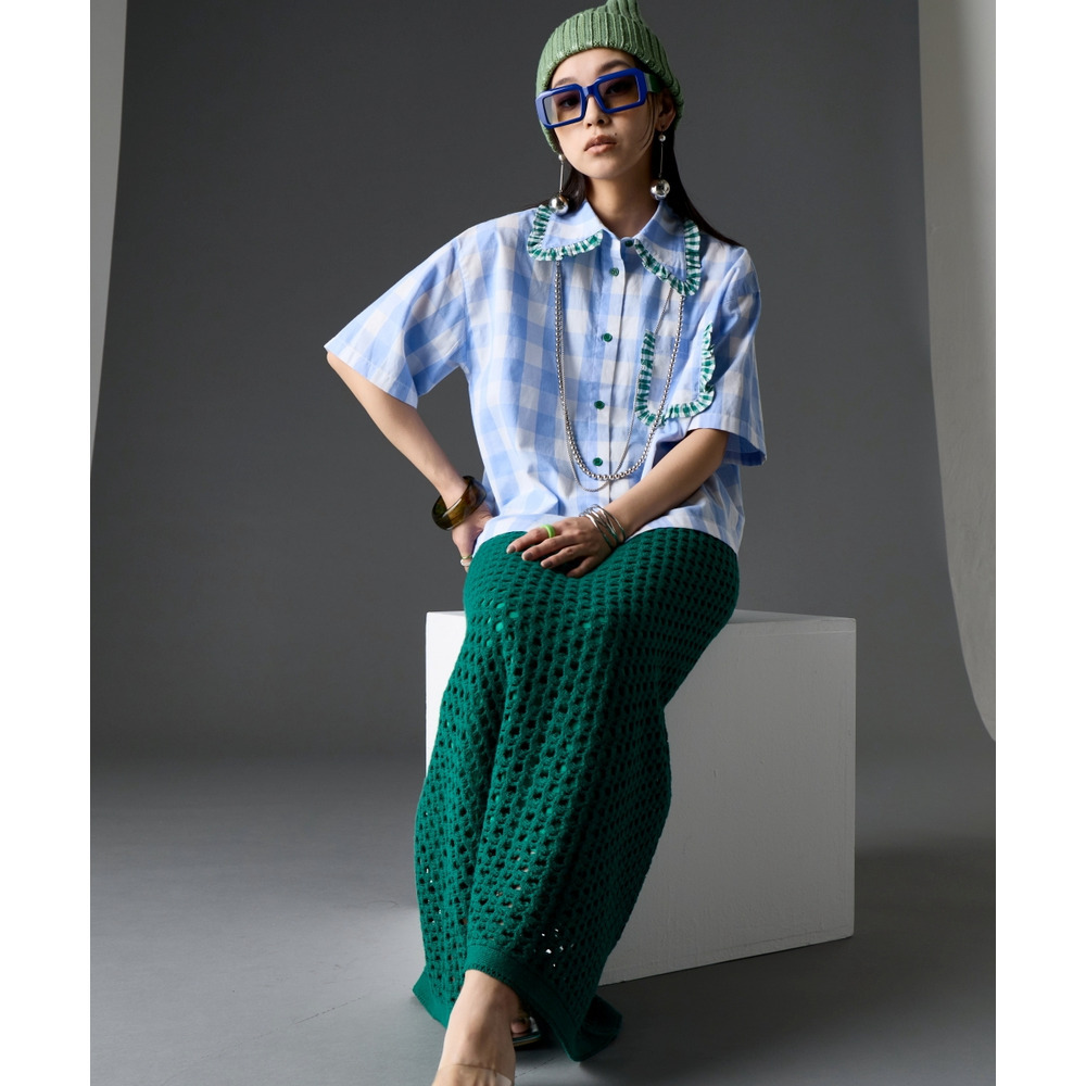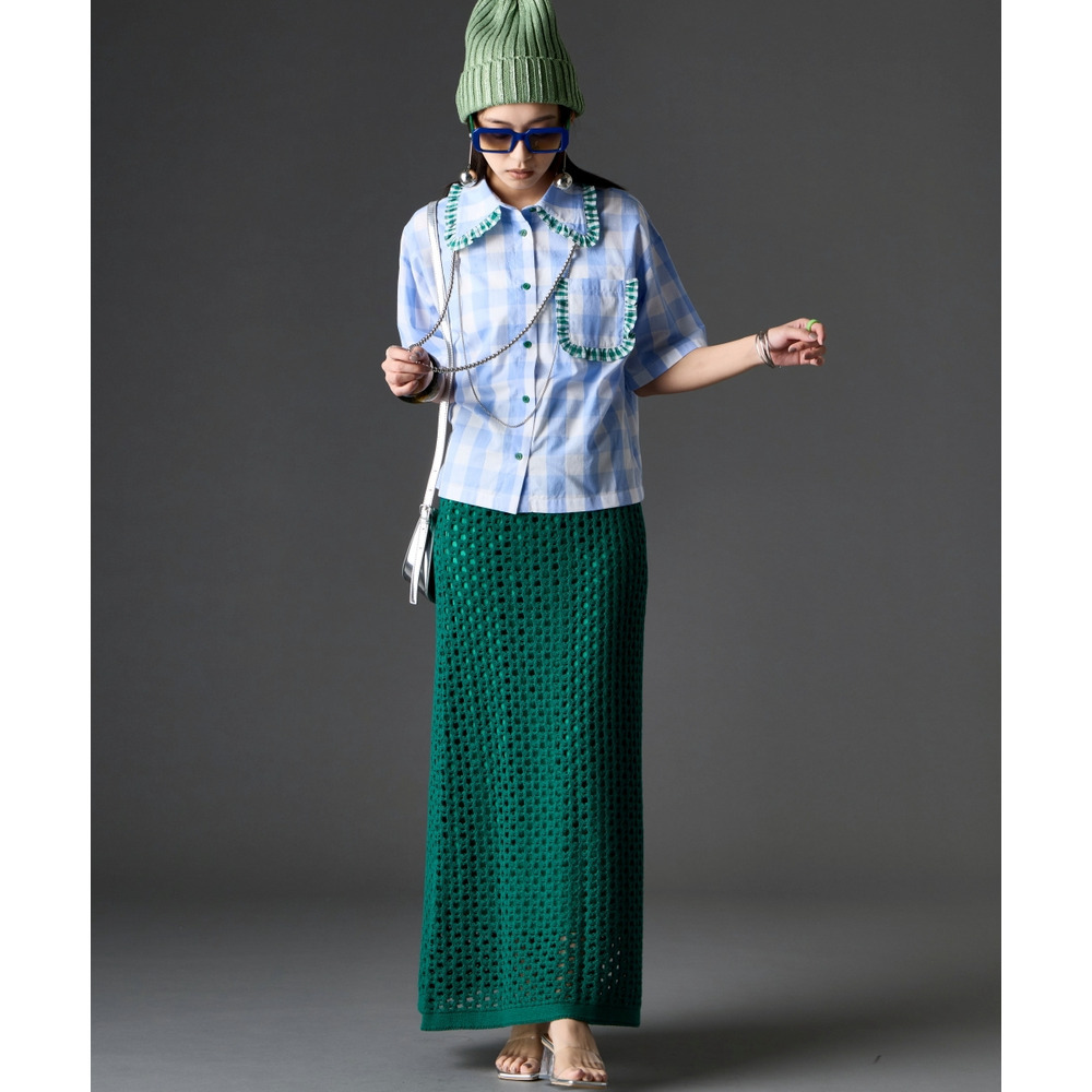 Crochet Clash Mode:ブルー×ホワイトのシャツを、鮮やかなグリーンの透かし編みスカートでハズした上級者スタイル。
