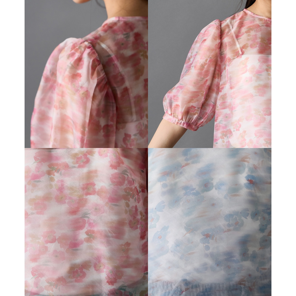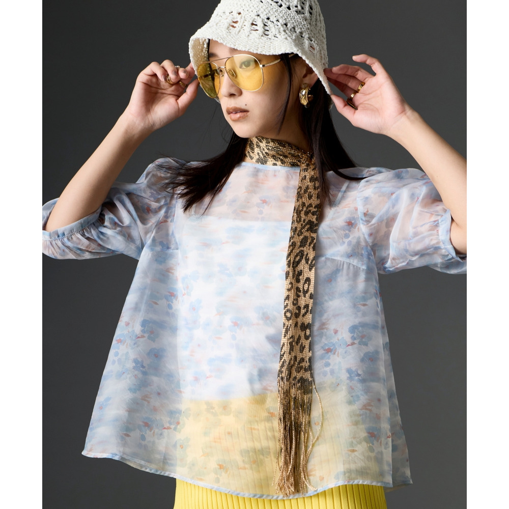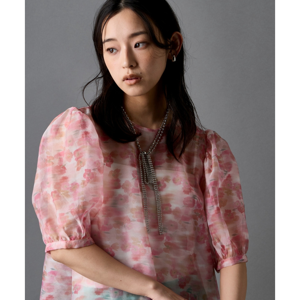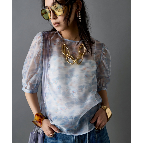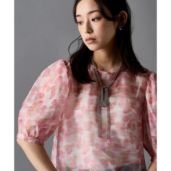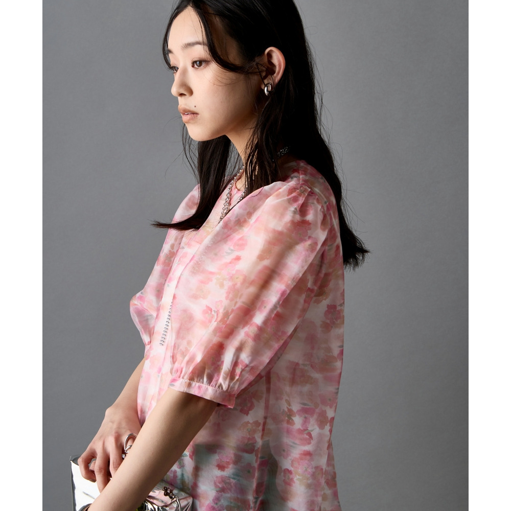 "繊細なシアー素材に、滲むようなフラワープリントを乗せたブラウス。