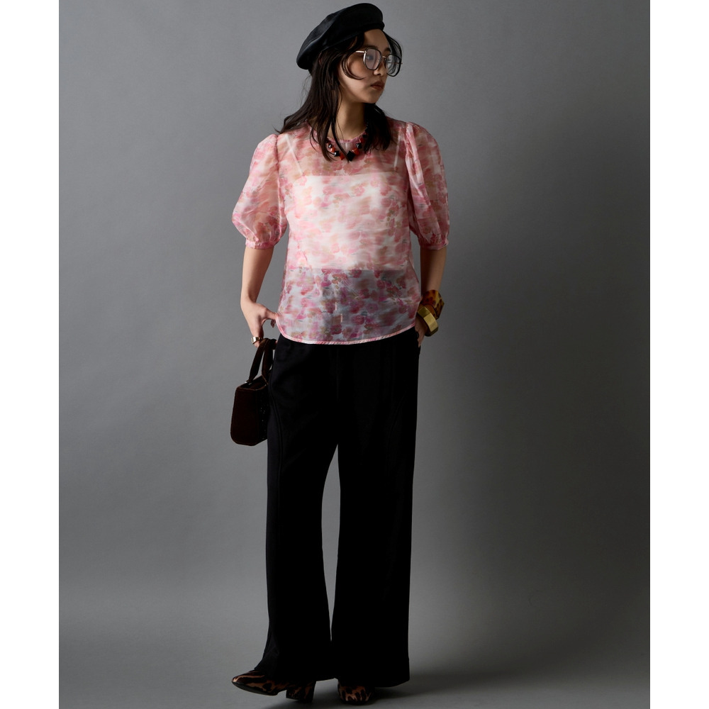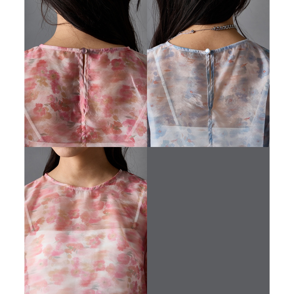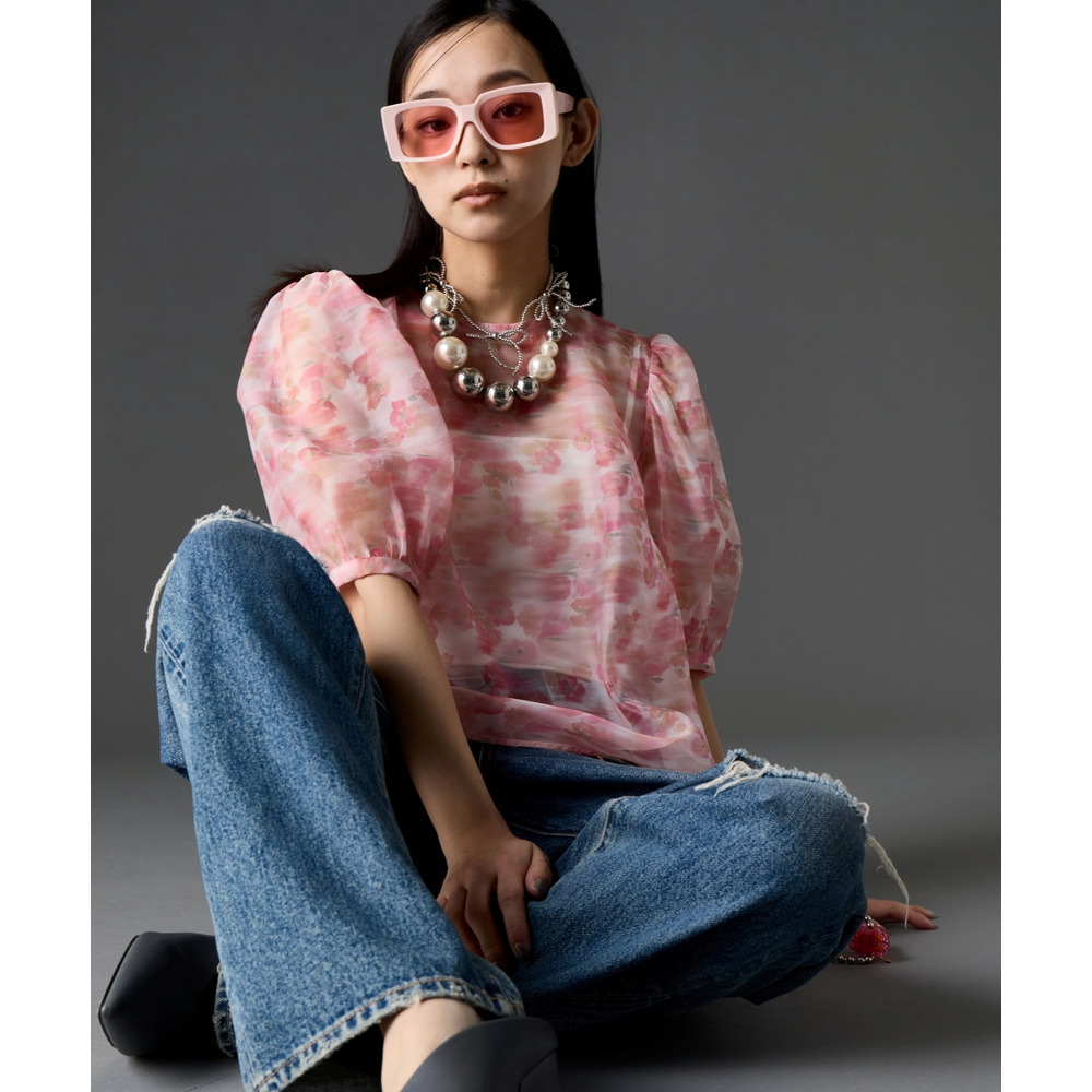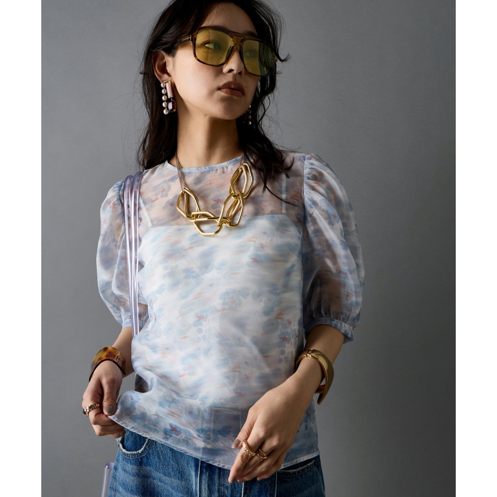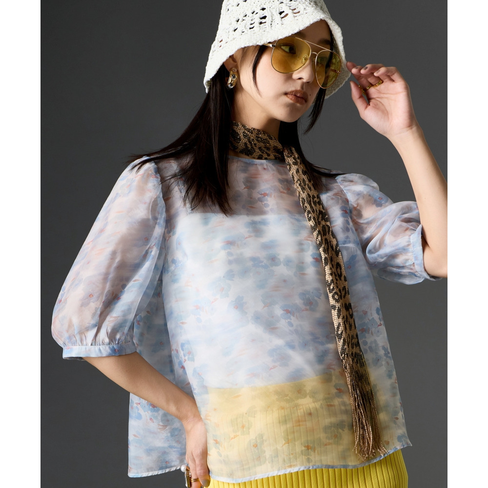"繊細なシアー素材に、滲むようなフラワープリントを乗せたブラウス。