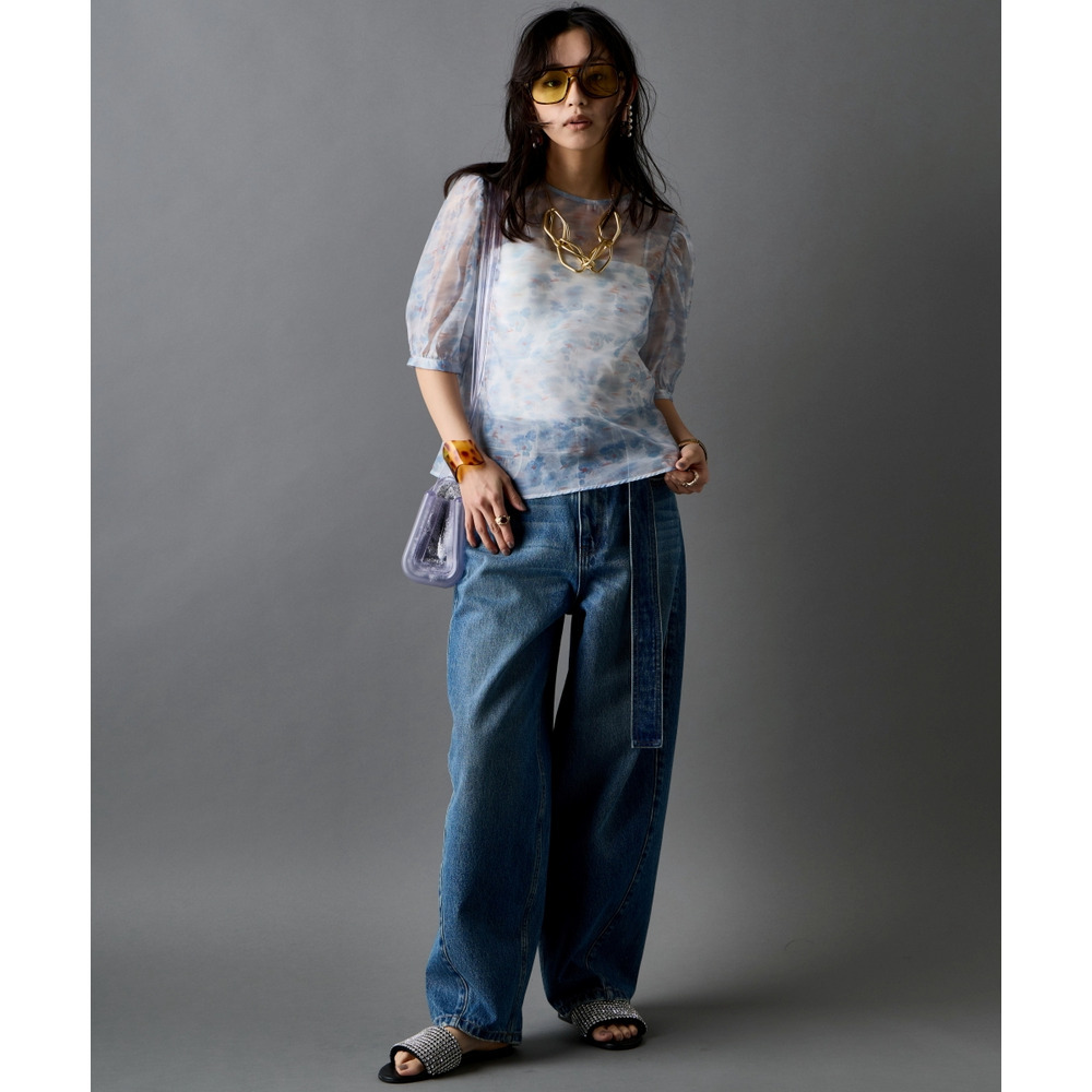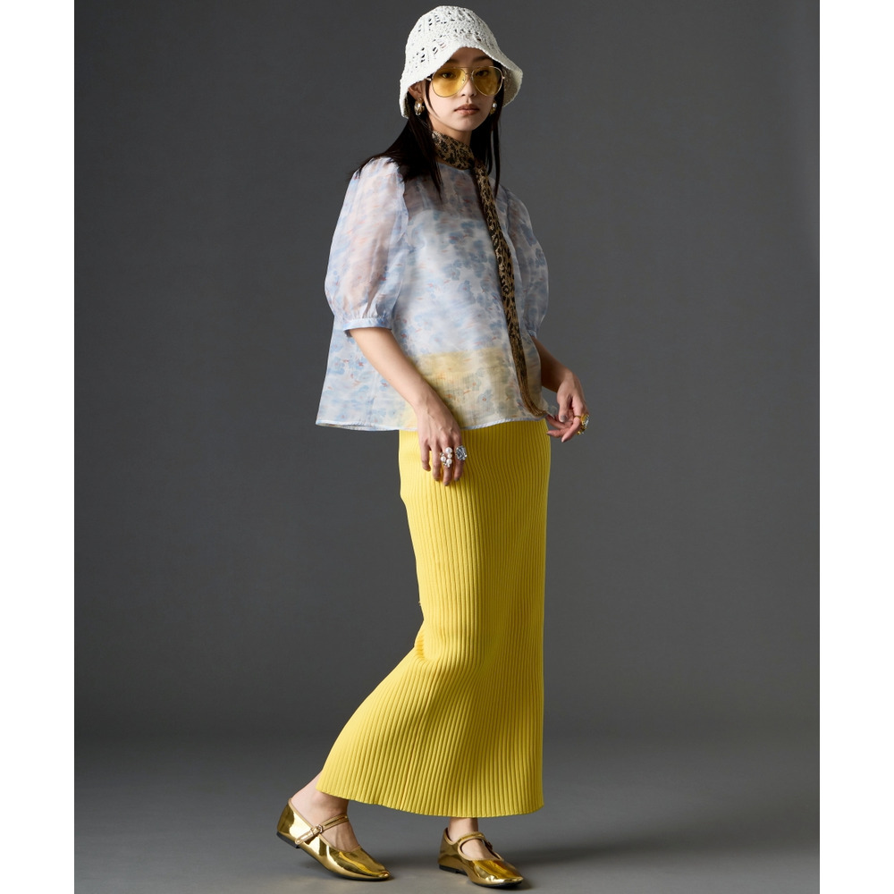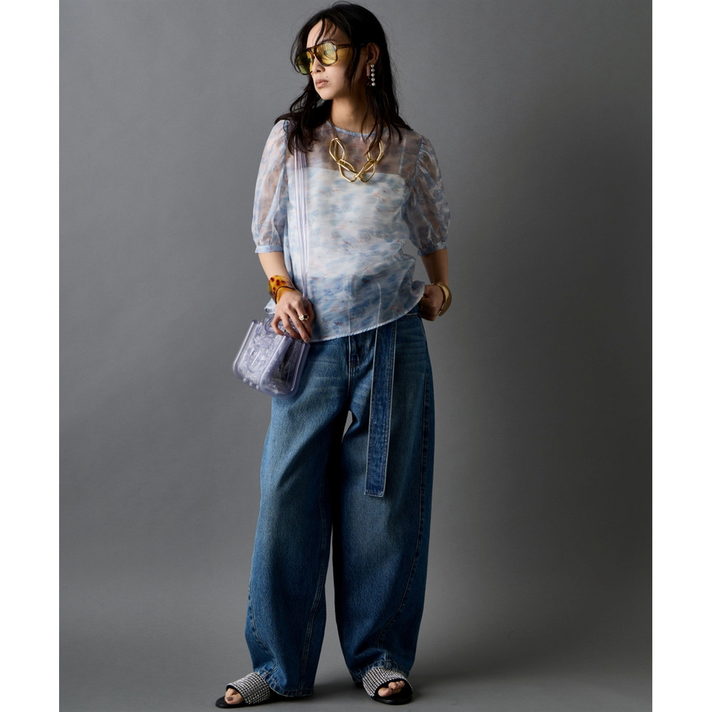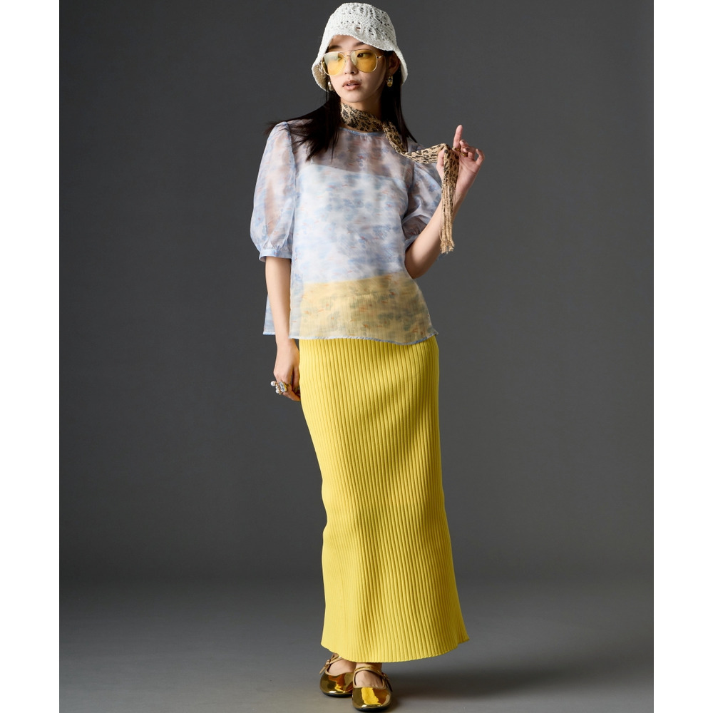 透け感のあるブラウスの下に、あえてボトムスのカラーを繋げることでグラフィカルなレイヤードが完成します。
