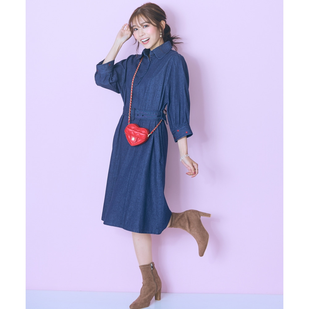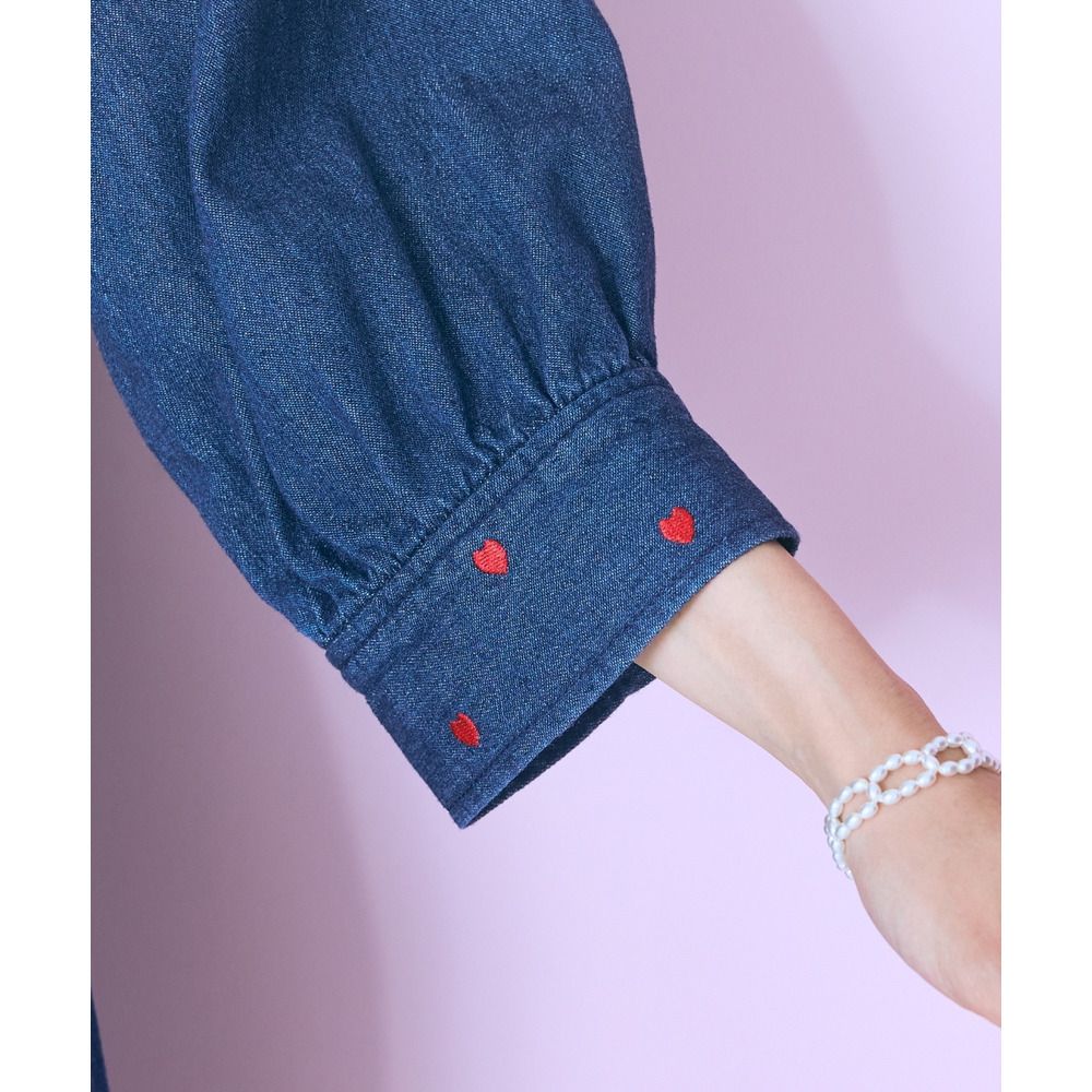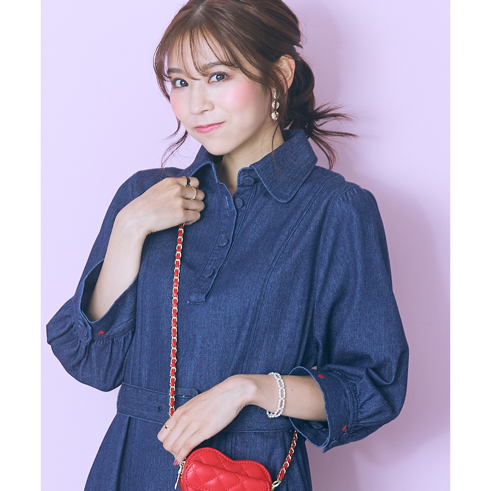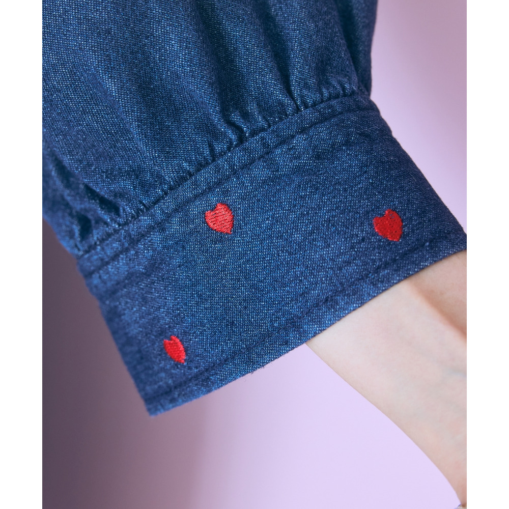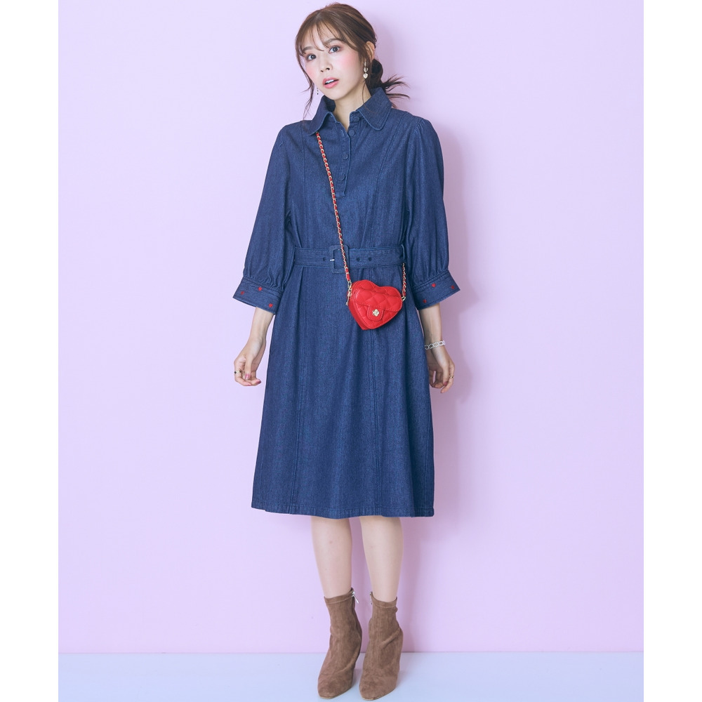 デニムのカジュアルさとハート刺しゅうの甘さが絶妙にマッチしたシャツワンピース。