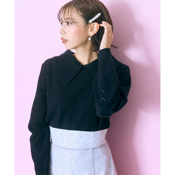 柄編みで存在感のあるビッグカラーが顔周りを華やかに彩り女性らしい柔らかな印象を与えます。