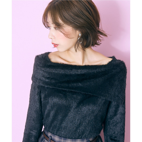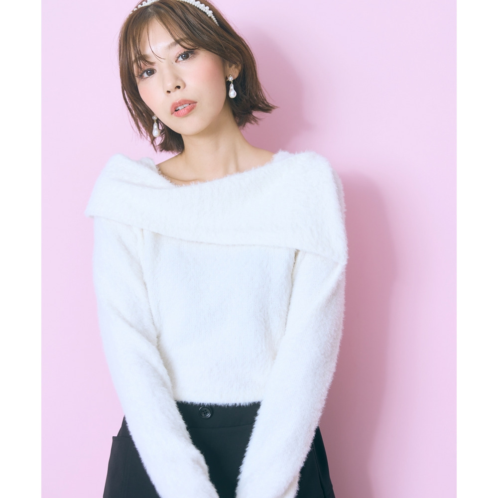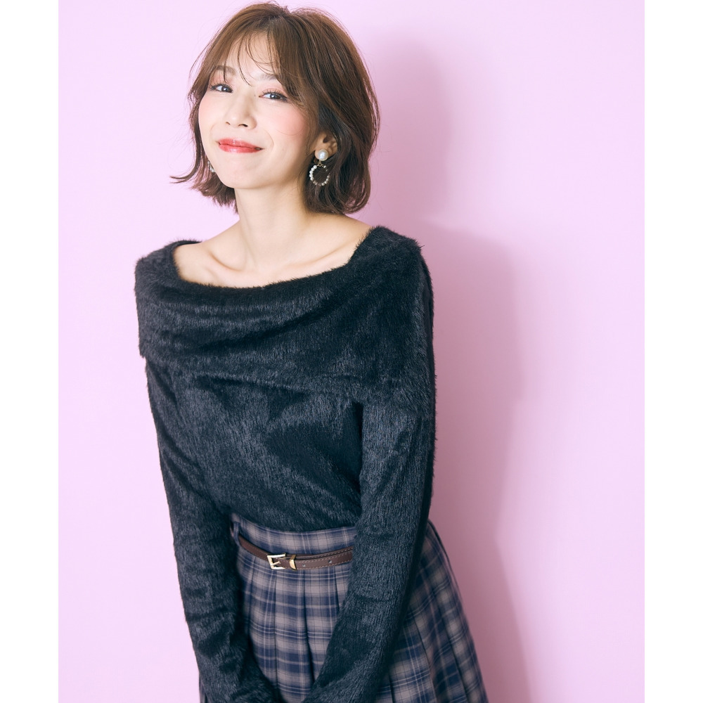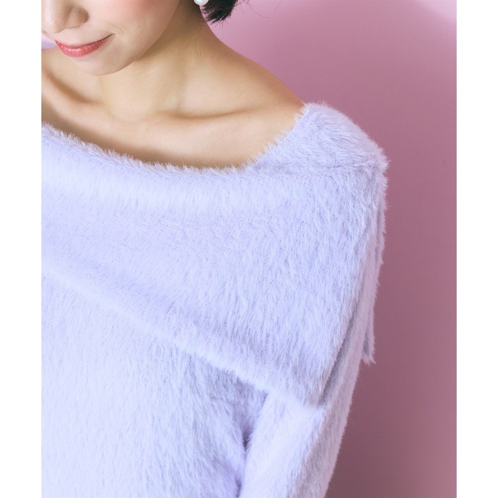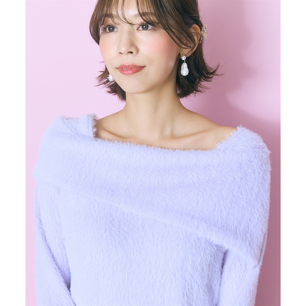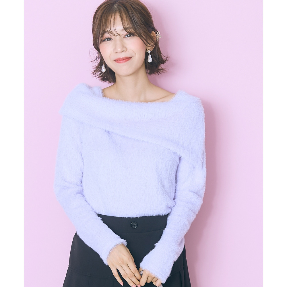 ふわふわシャギー素材が愛らしいオフショルダーニットソー!ニット調カットソー素材なので、着心地が楽で羽織りのインに着るのもおすすめです。