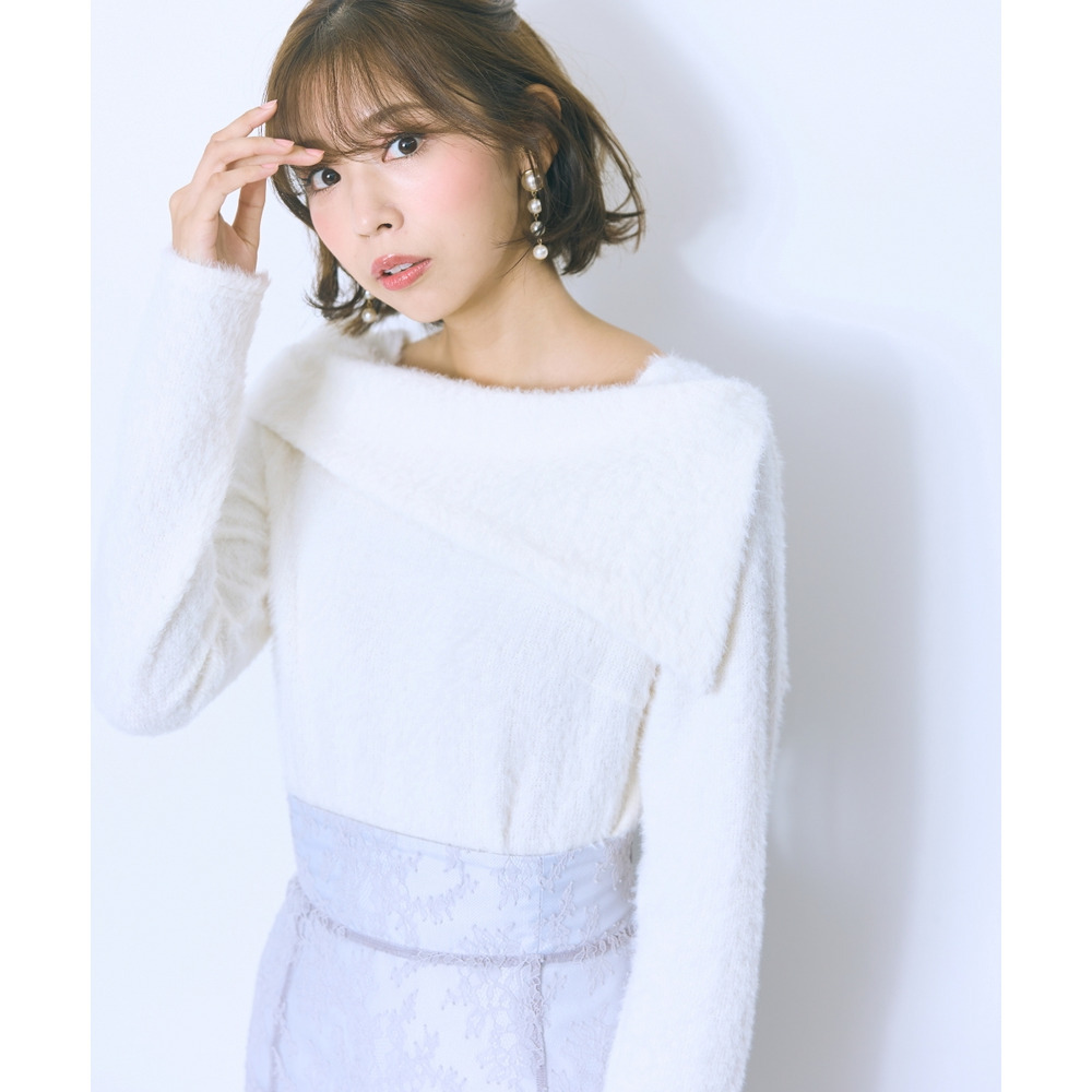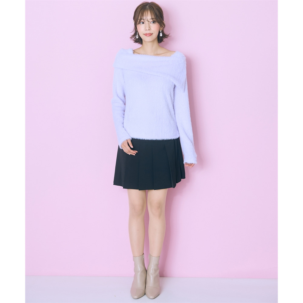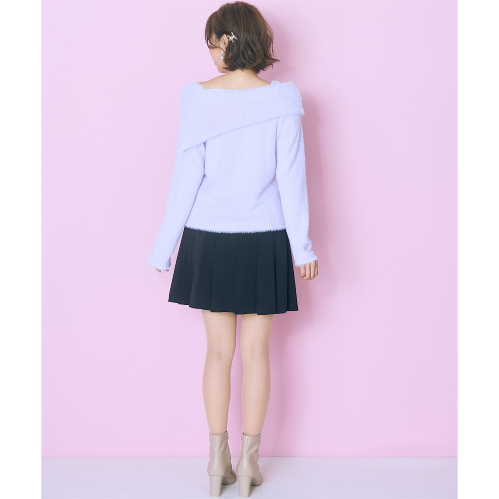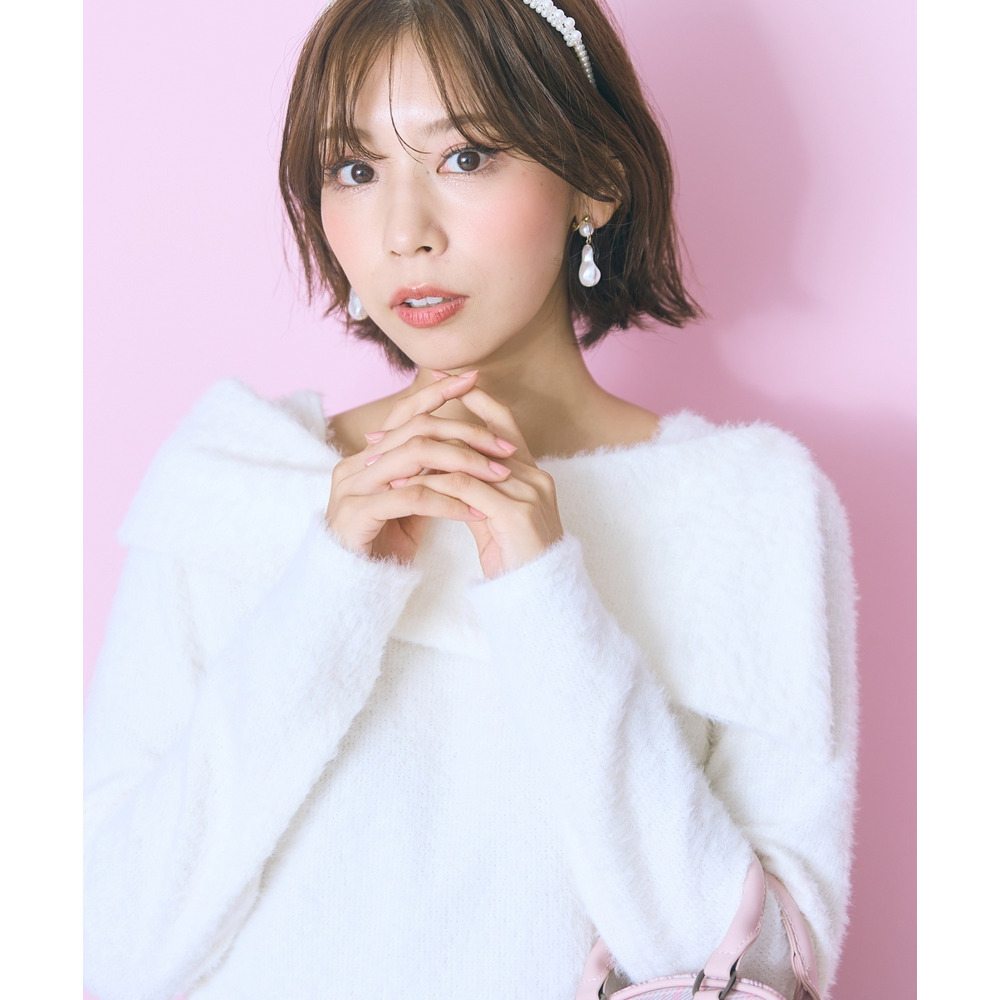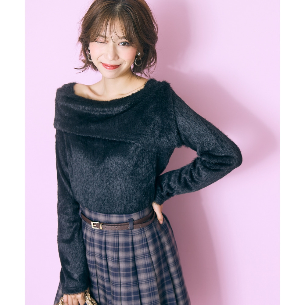 ふわふわシャギー素材が愛らしいオフショルダーニットソー!ニット調カットソー素材なので、着心地が楽で羽織りのインに着るのもおすすめです。