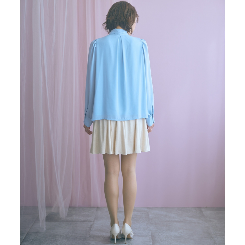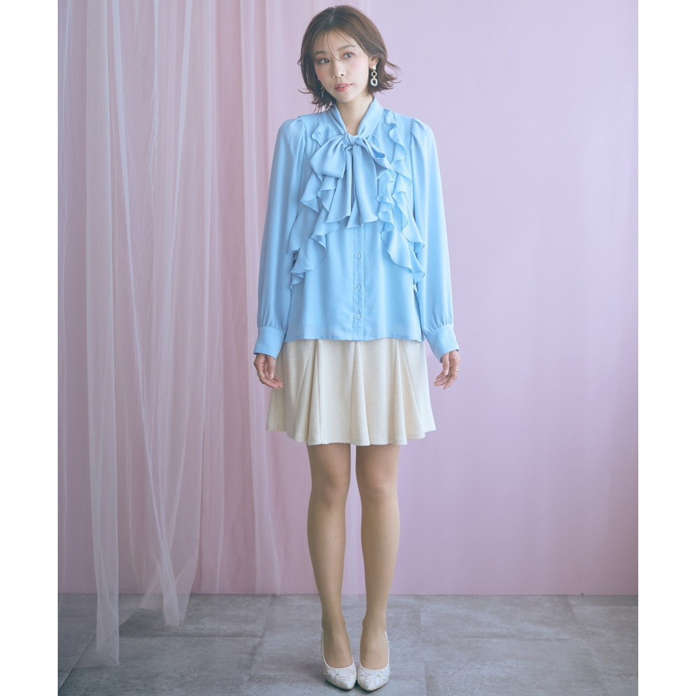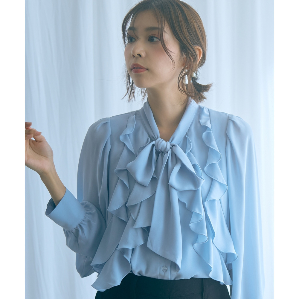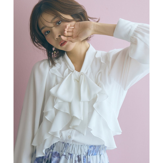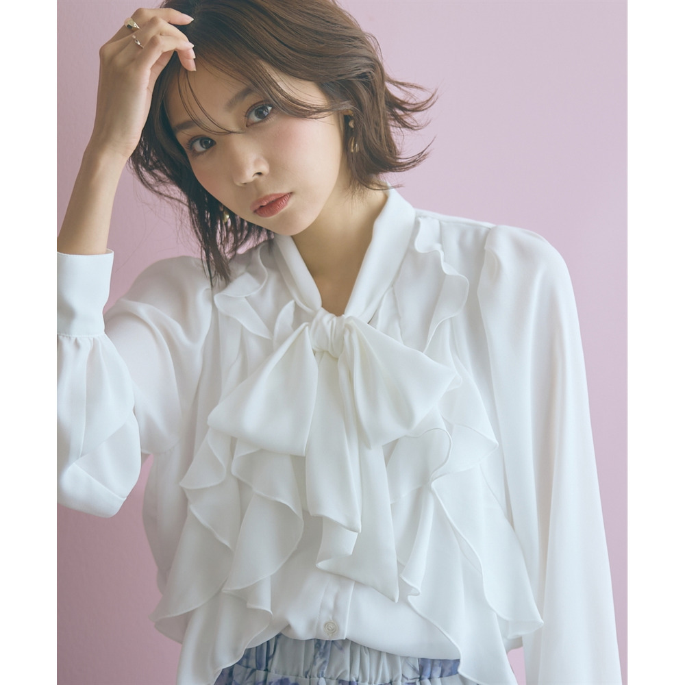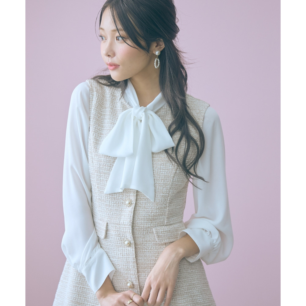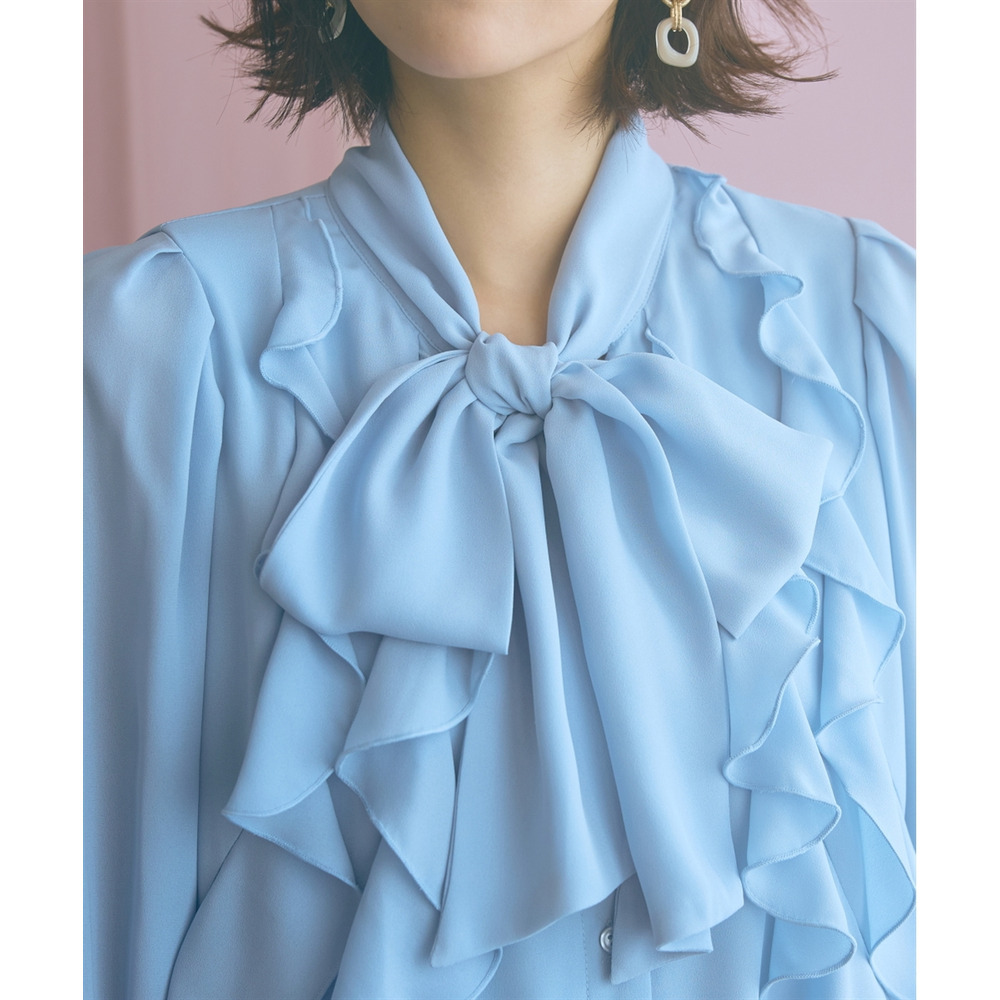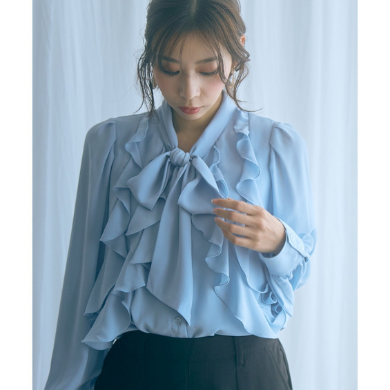顔周りを優しく彩るフリルと上品なボウタイが女性らしさを引き立てます。