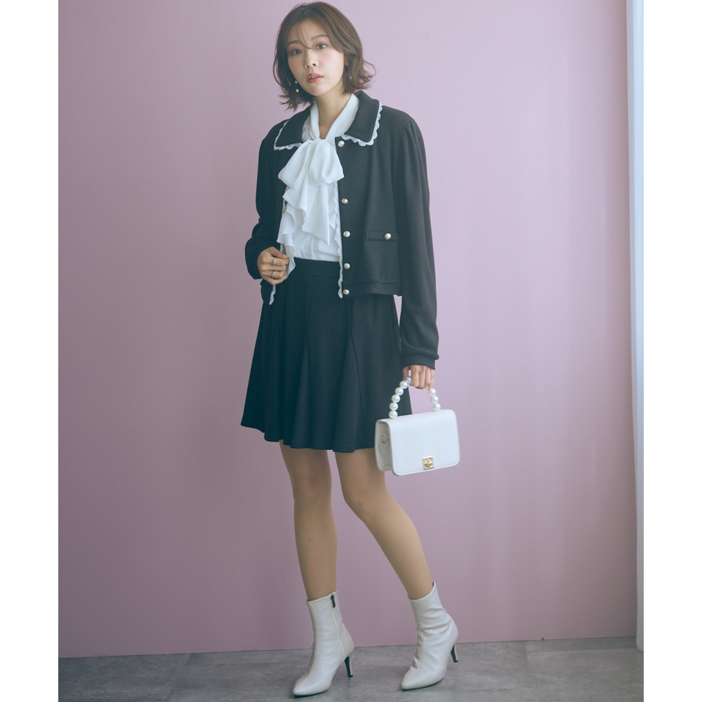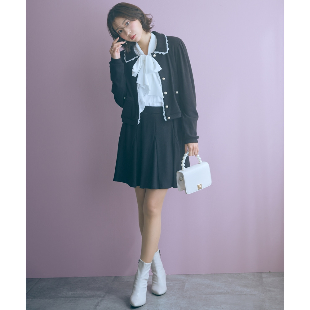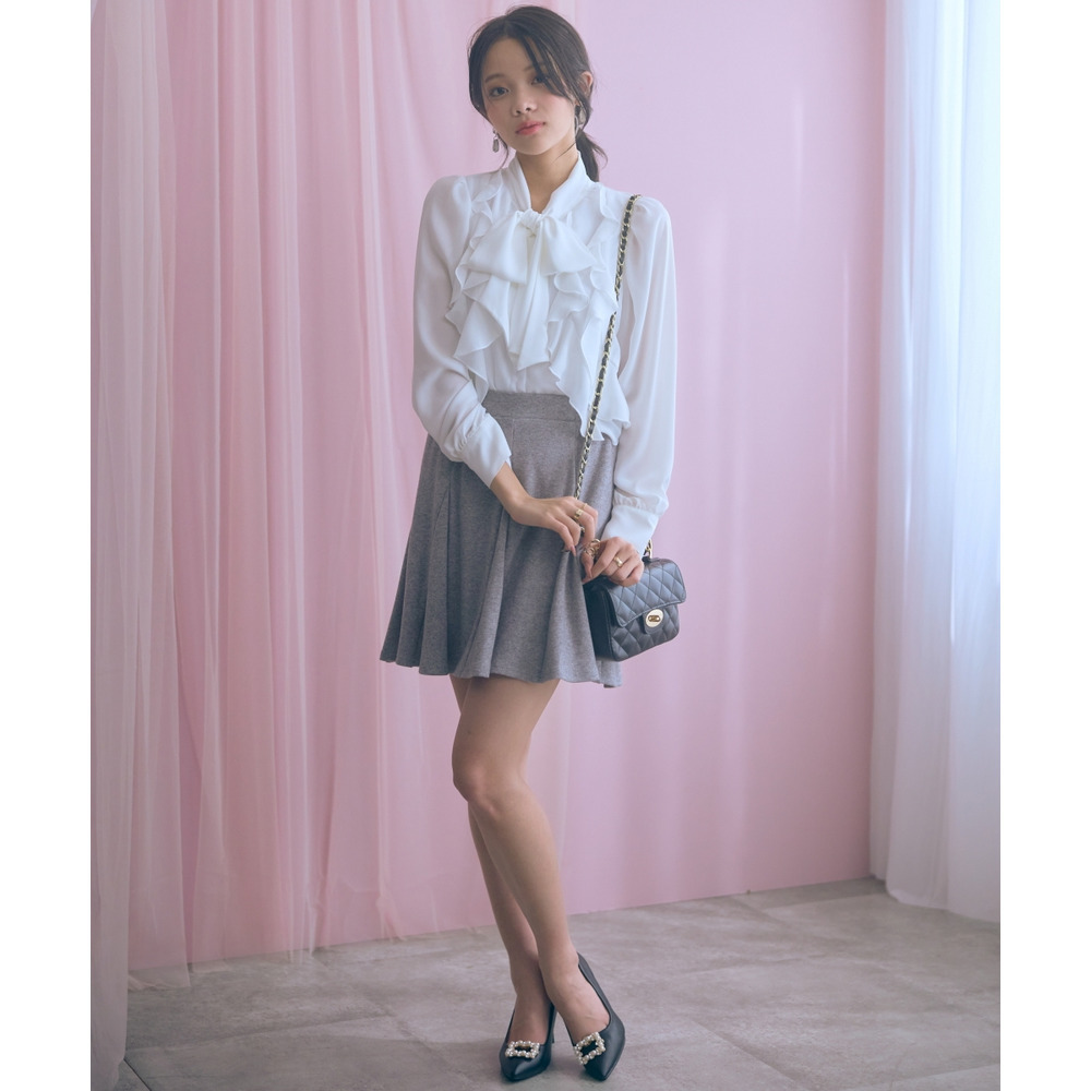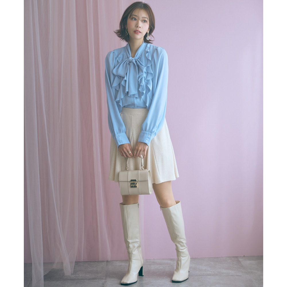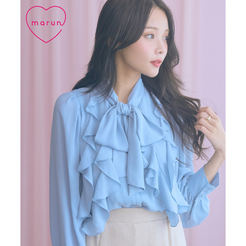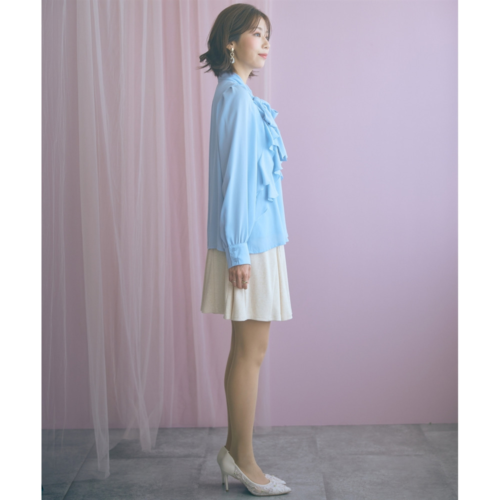 顔周りを優しく彩るフリルと上品なボウタイが女性らしさを引き立てます。