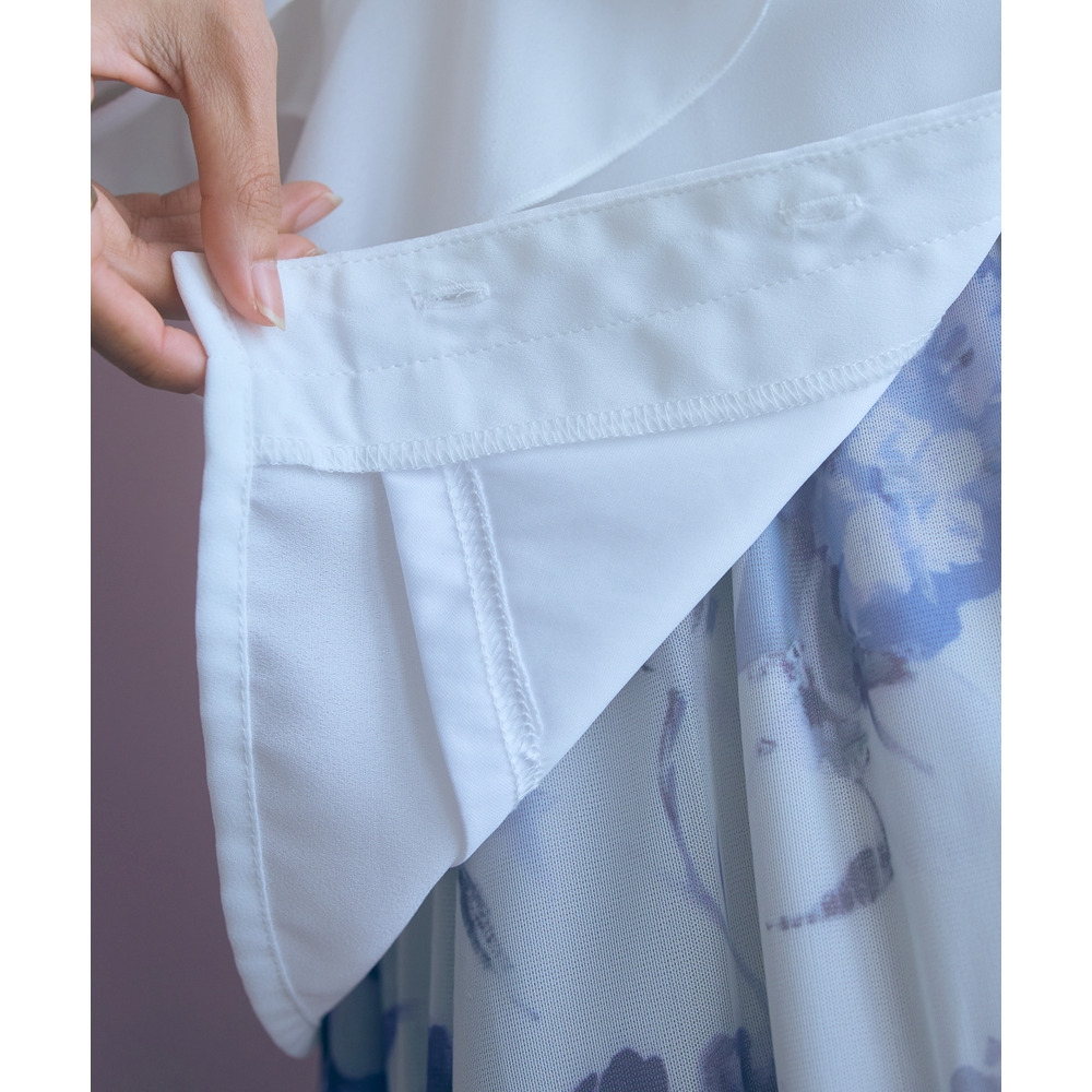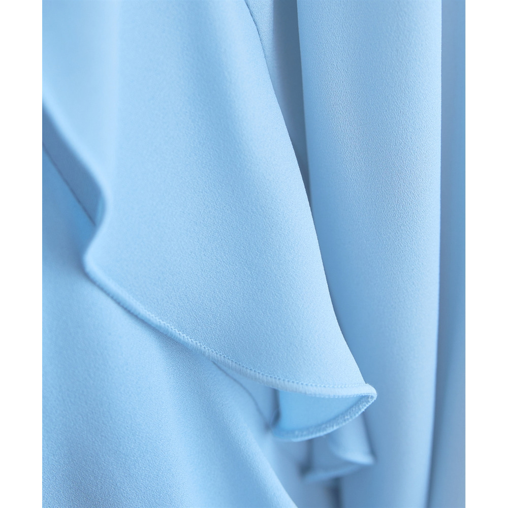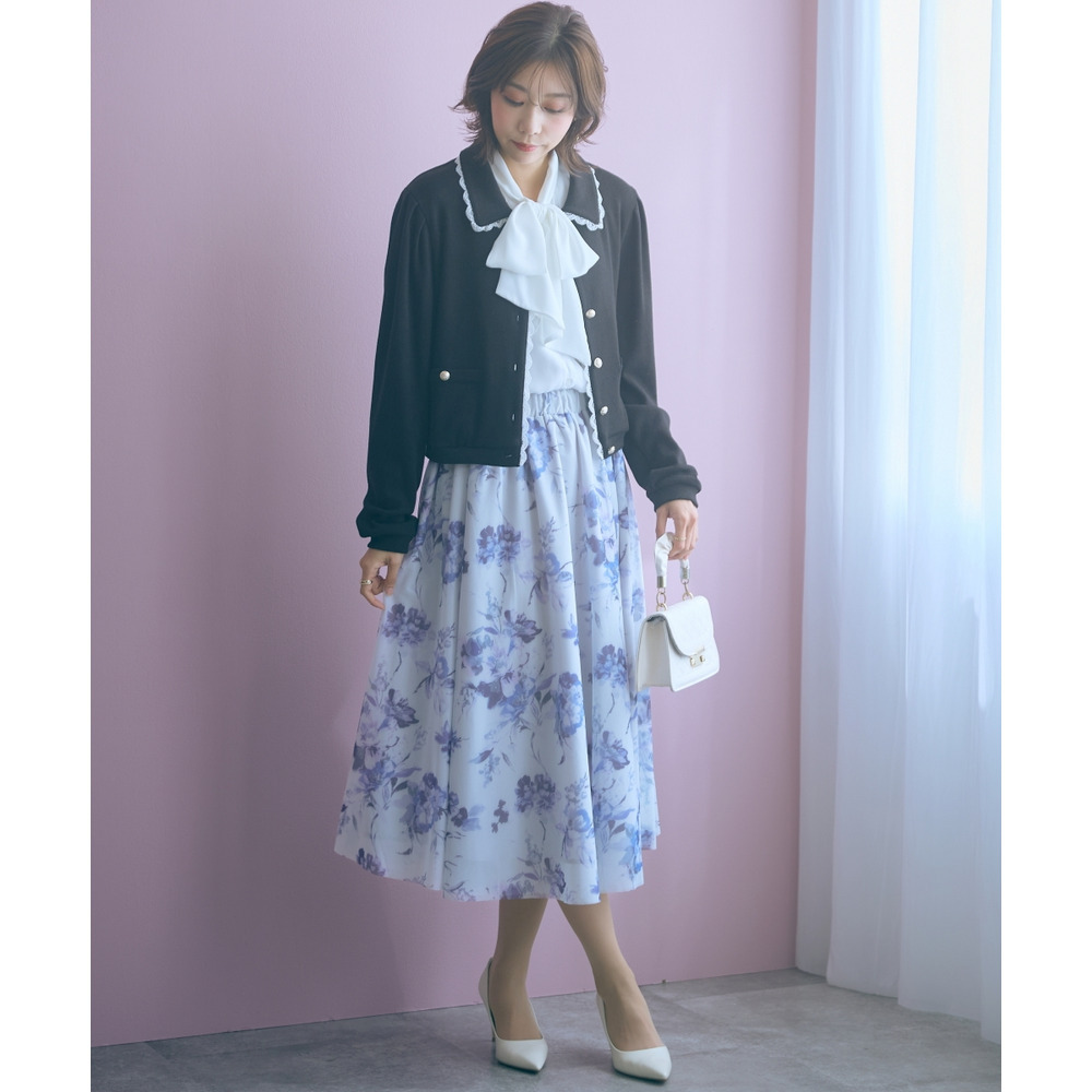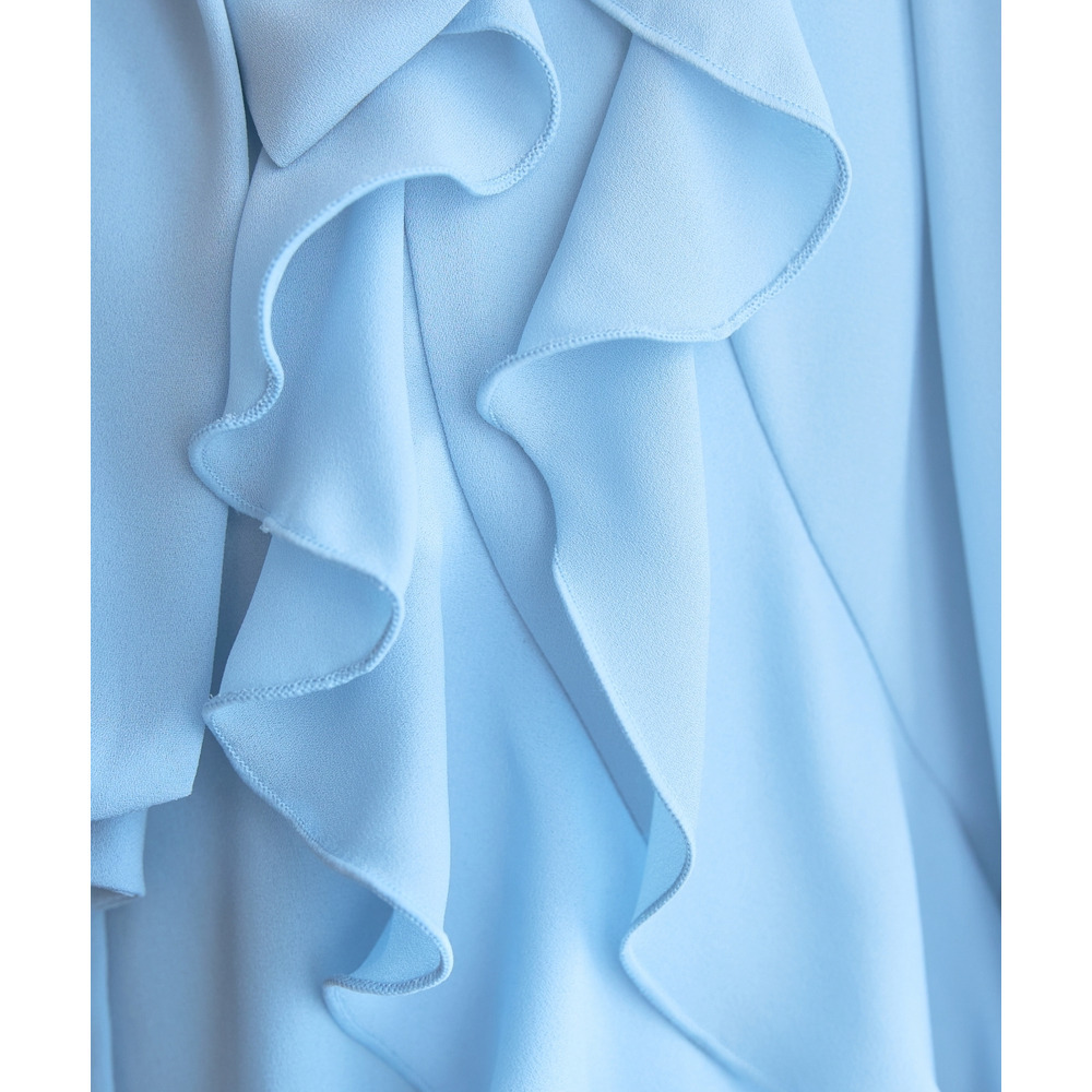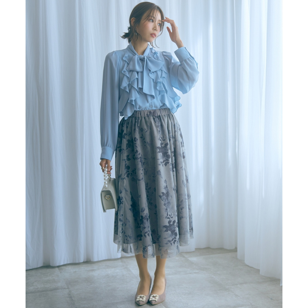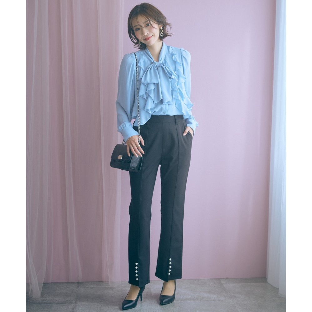 顔周りを優しく彩るフリルと上品なボウタイが女性らしさを引き立てます。