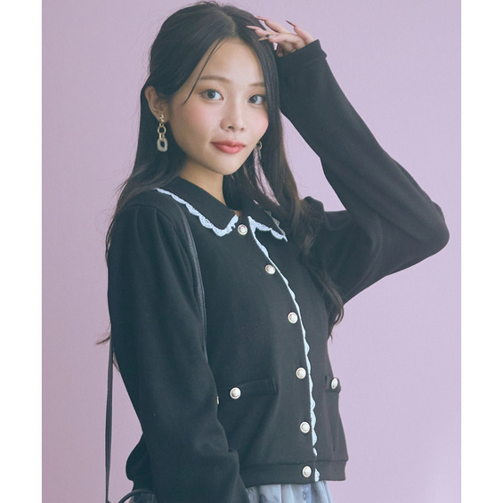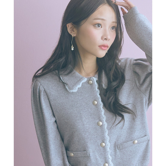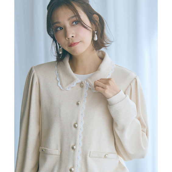 上品なレース使いが施された襟とパフスリーブが女性らしい魅力を引き立てる金ボタンショート丈カーディガン。