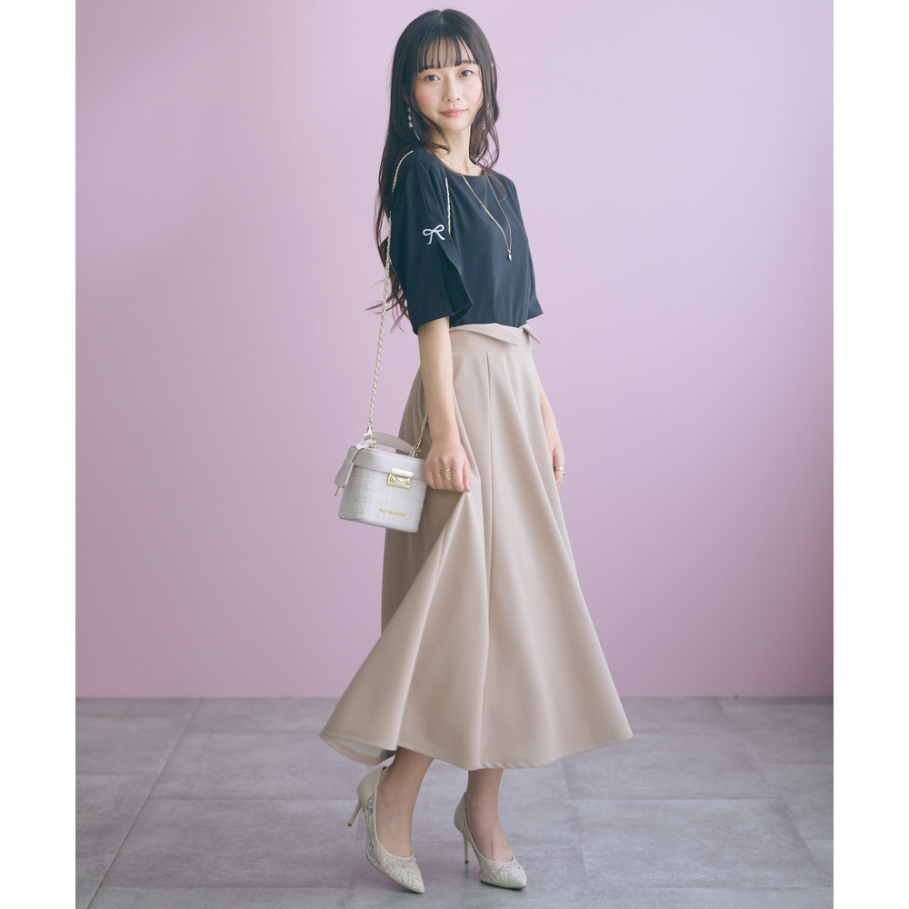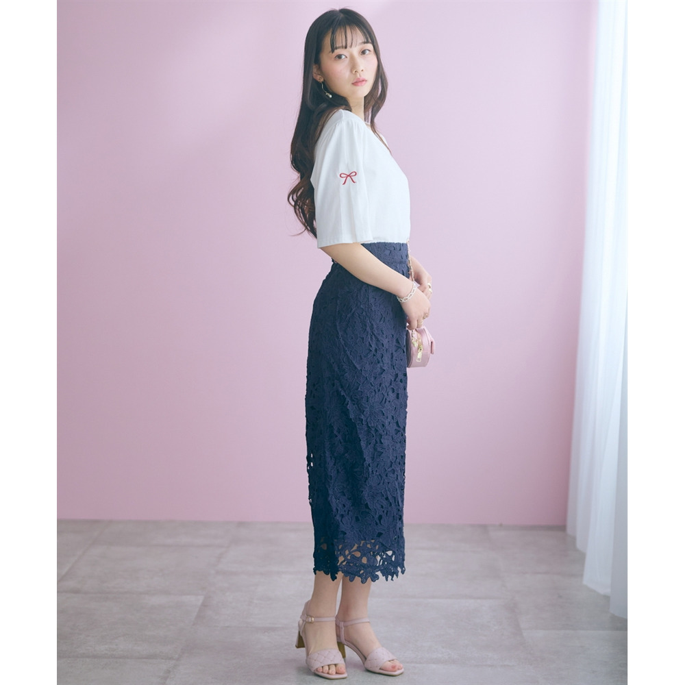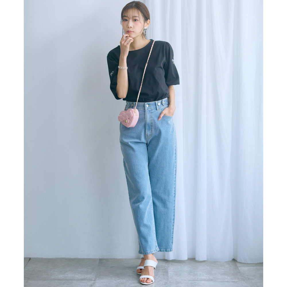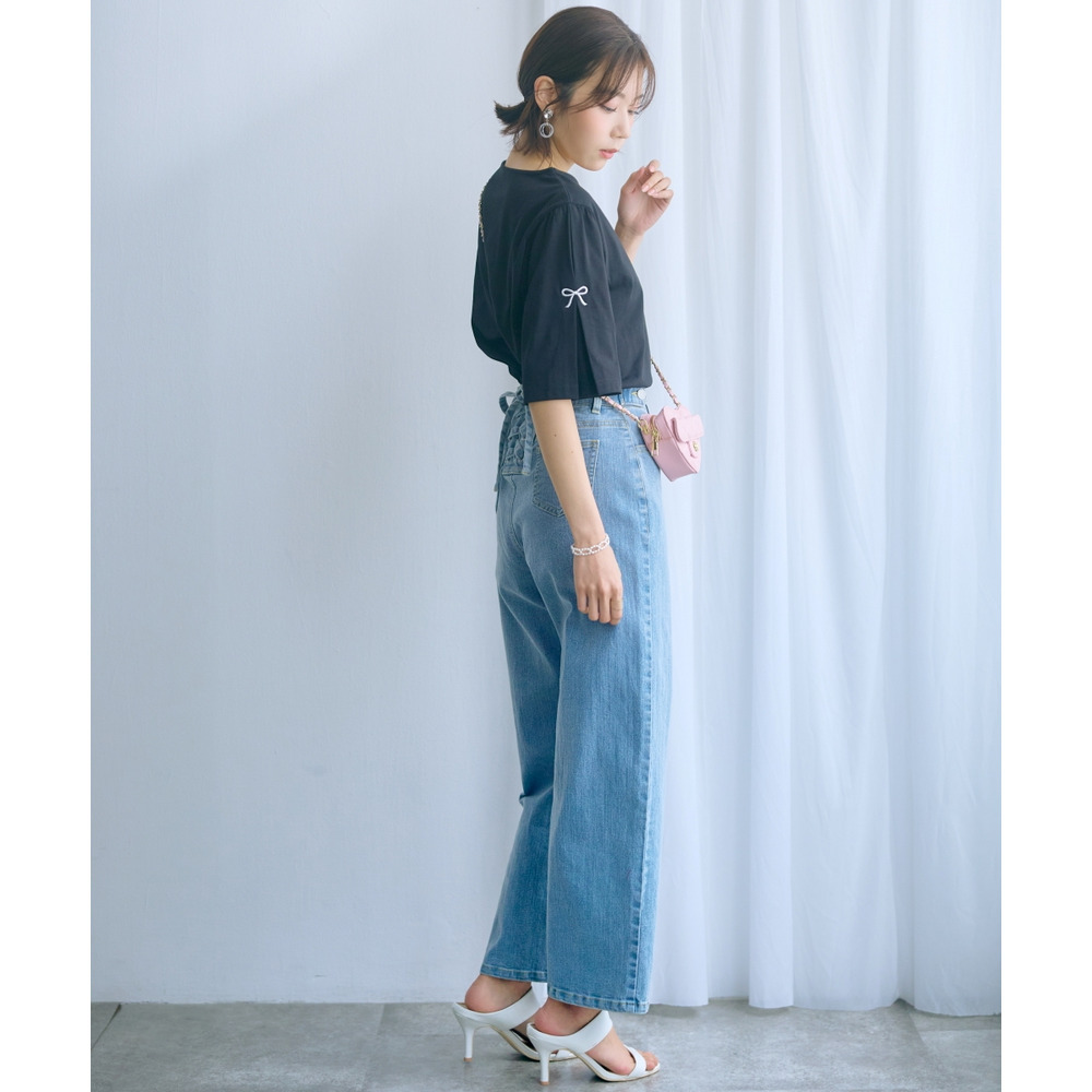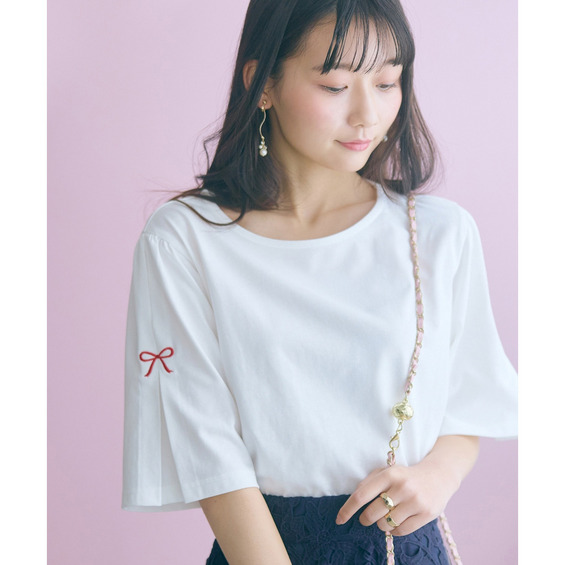 カジュアルになりがちなTシャツがこだわりのリボン刺しゅうで上品な一枚に格上げ♪ゆったりめのカーディガンのインナーにもオススメなので、シーズンレスで着回していただけます。
