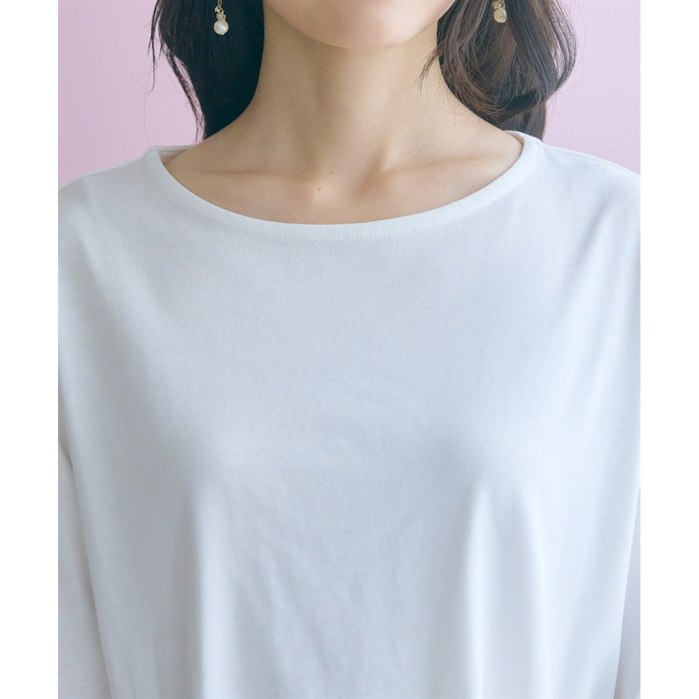 絶妙なクルーネックが顔周りをすっきりと明るく見せ、ネックレスなどのアクセサリーも美しく映えます。