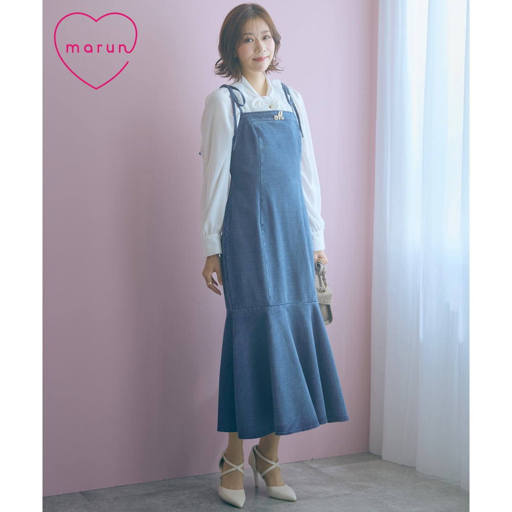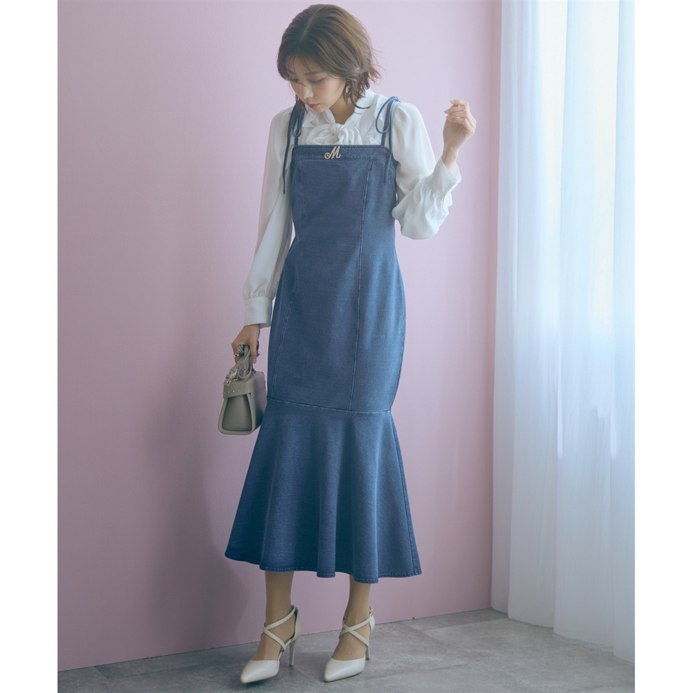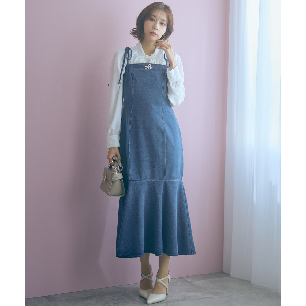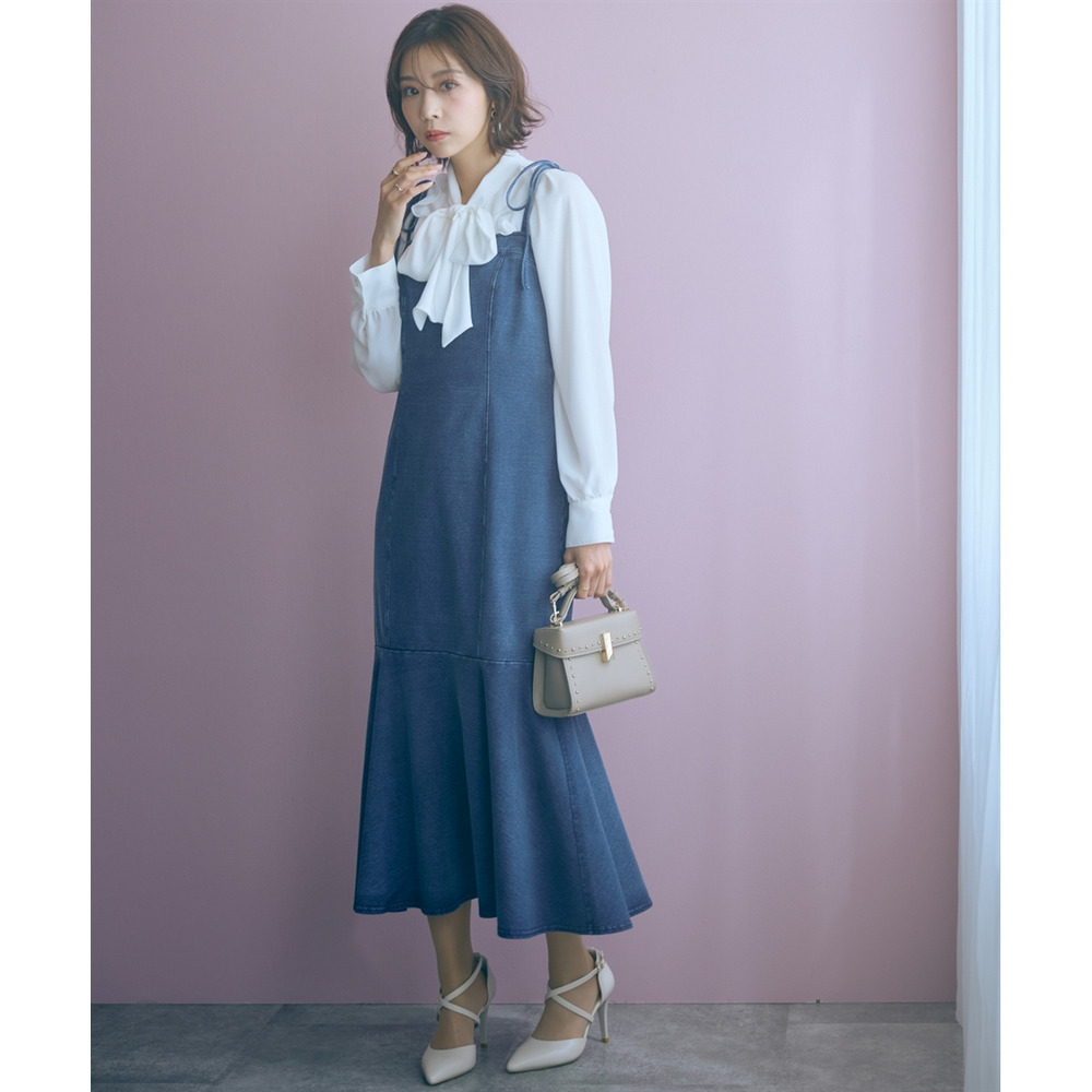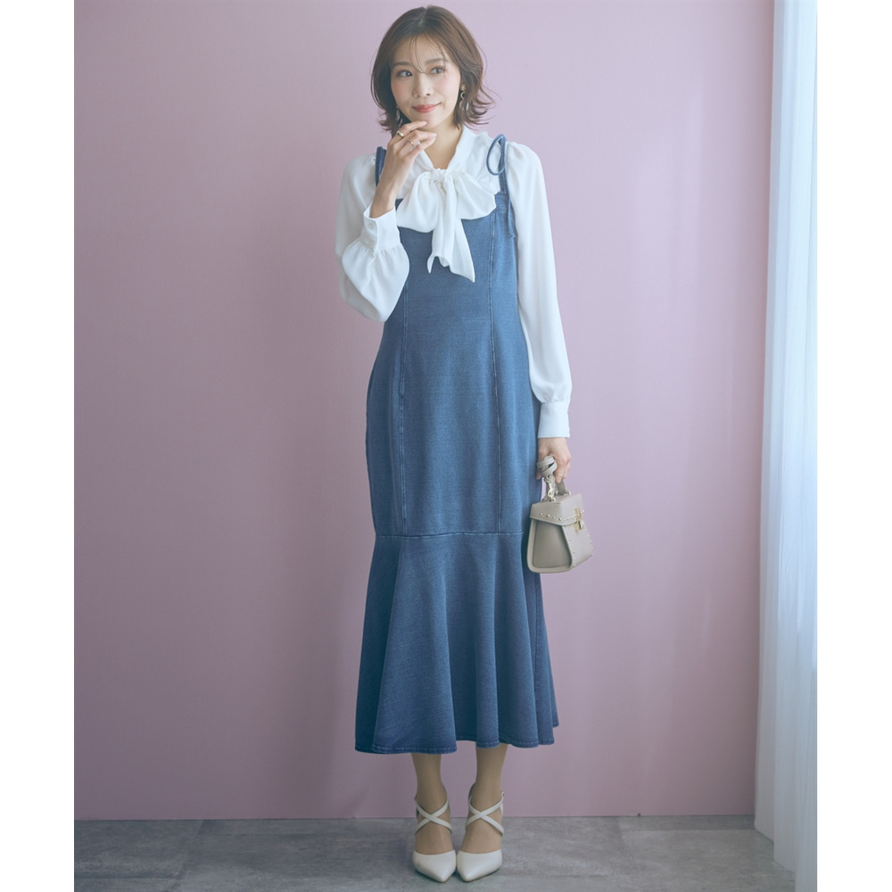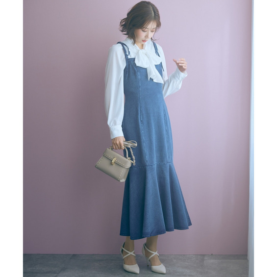柔らかいカットデニム素材+女性らしいマーメイドシルエットがカジュアルになりすぎない魅力を発信。