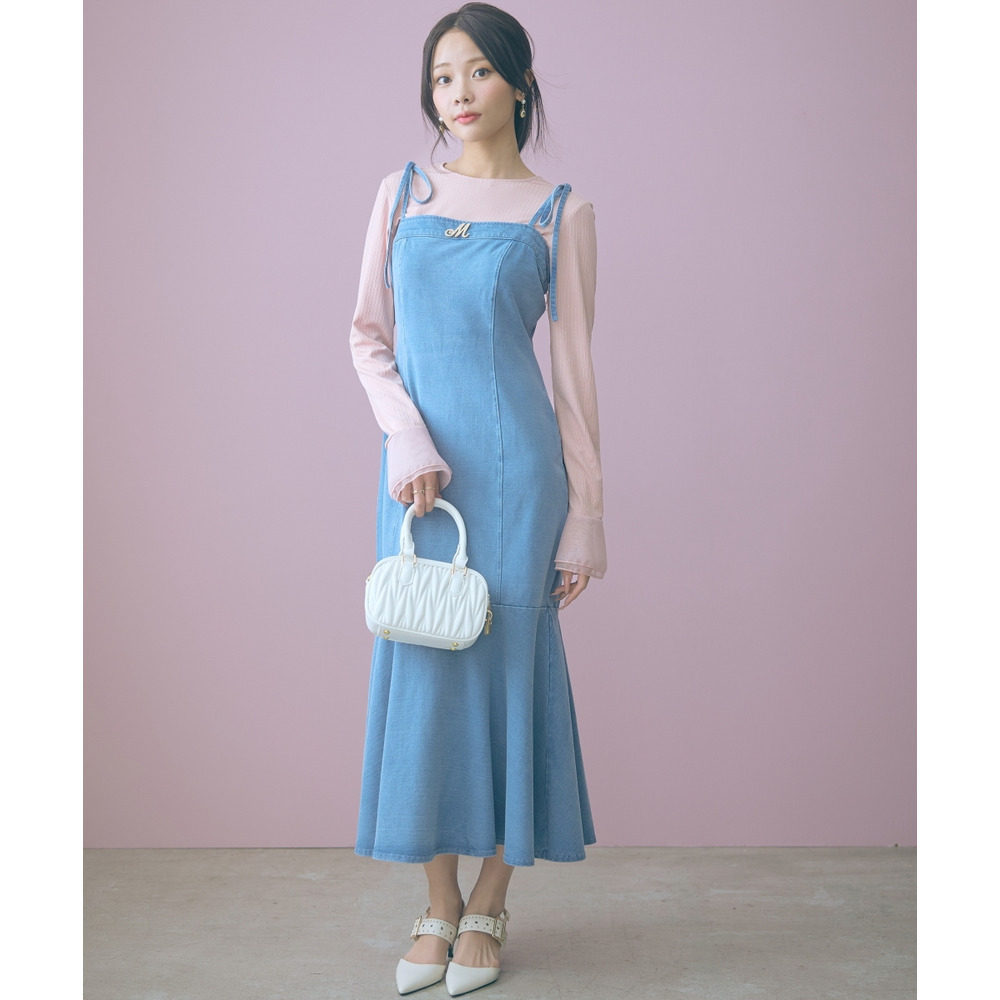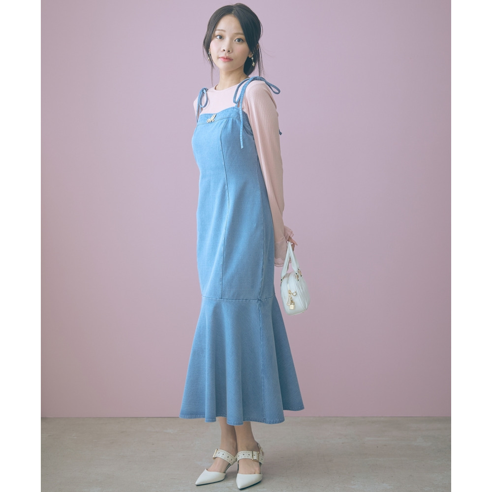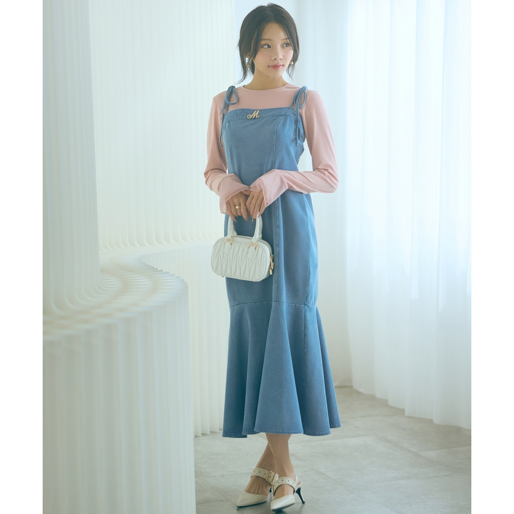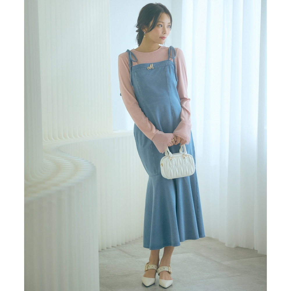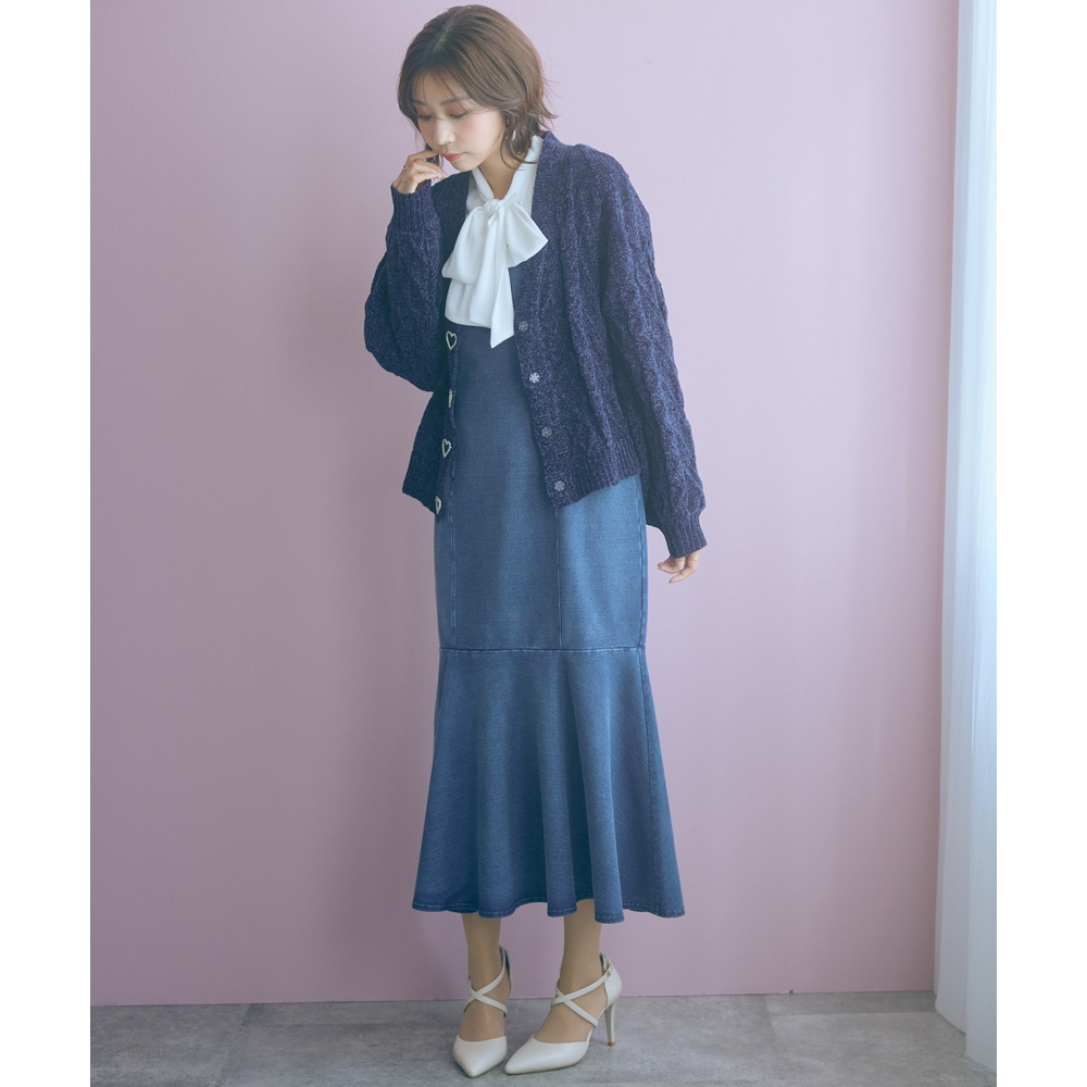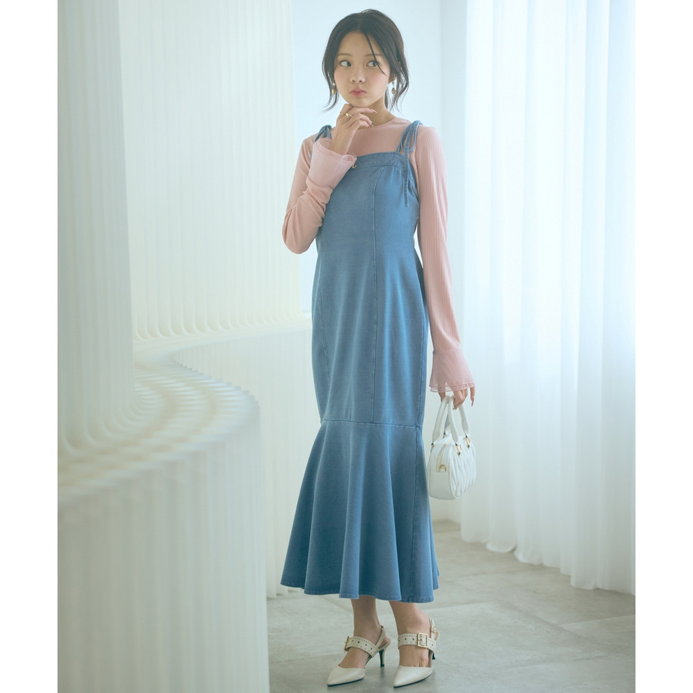 柔らかいカットデニム素材+女性らしいマーメイドシルエットがカジュアルになりすぎない魅力を発信。