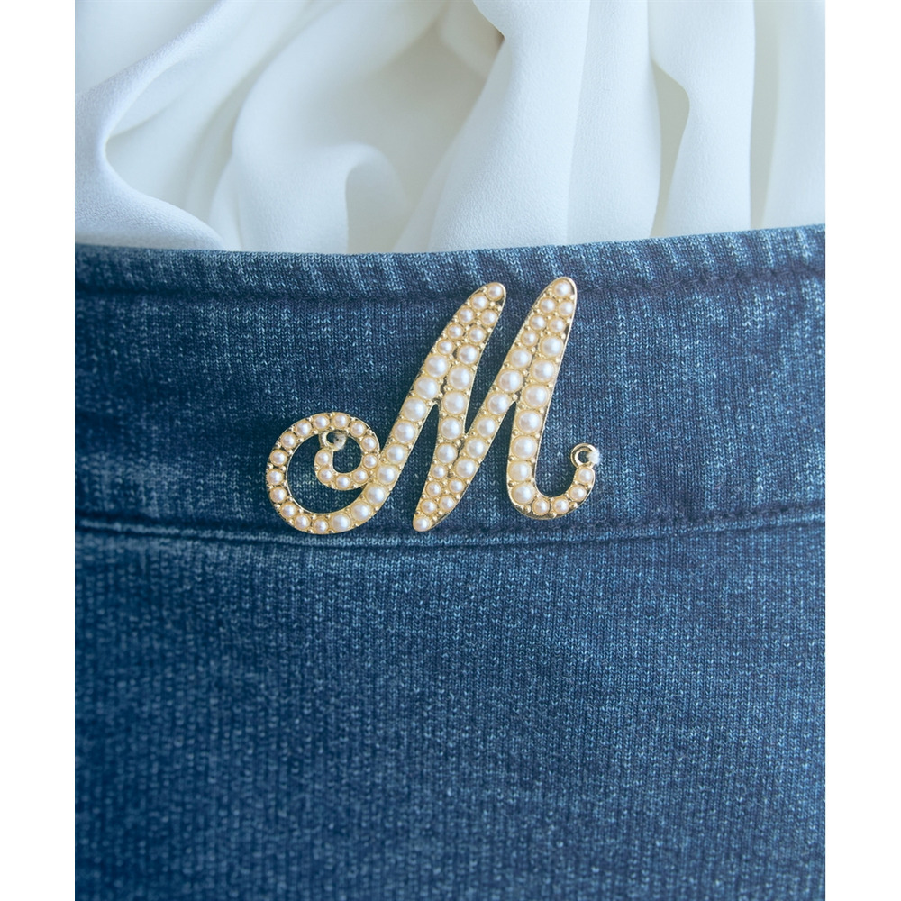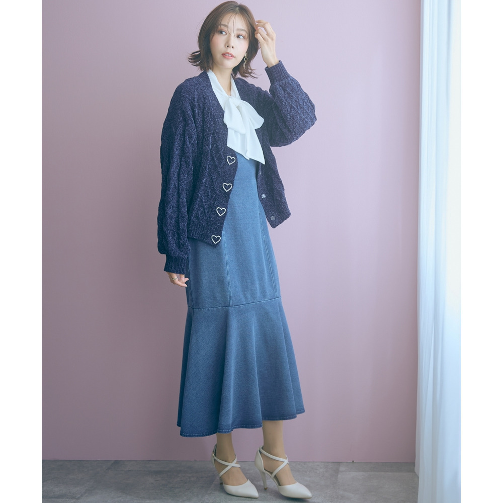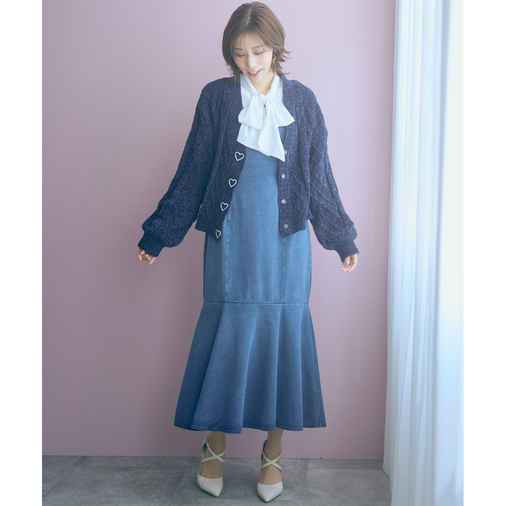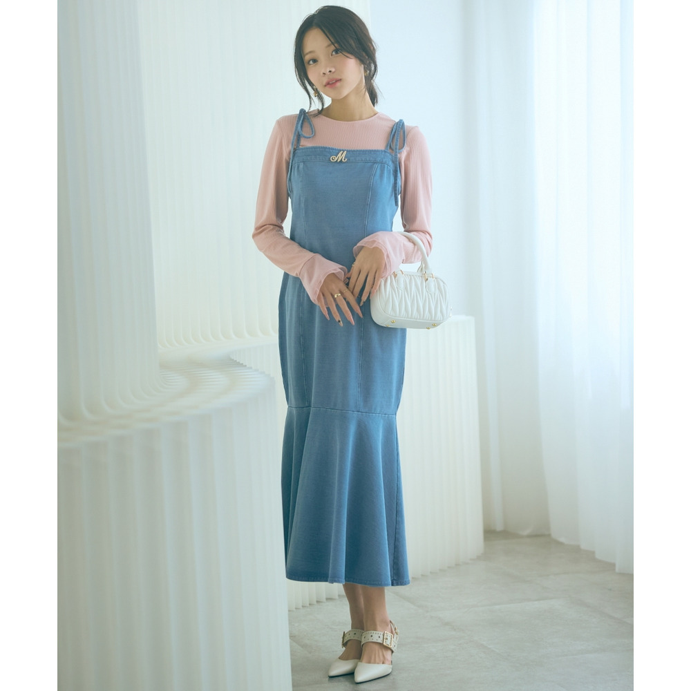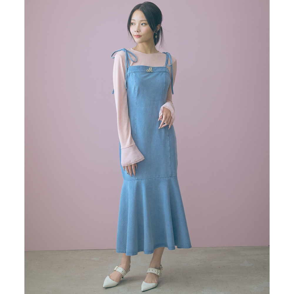 柔らかいカットデニム素材+女性らしいマーメイドシルエットがカジュアルになりすぎない魅力を発信。