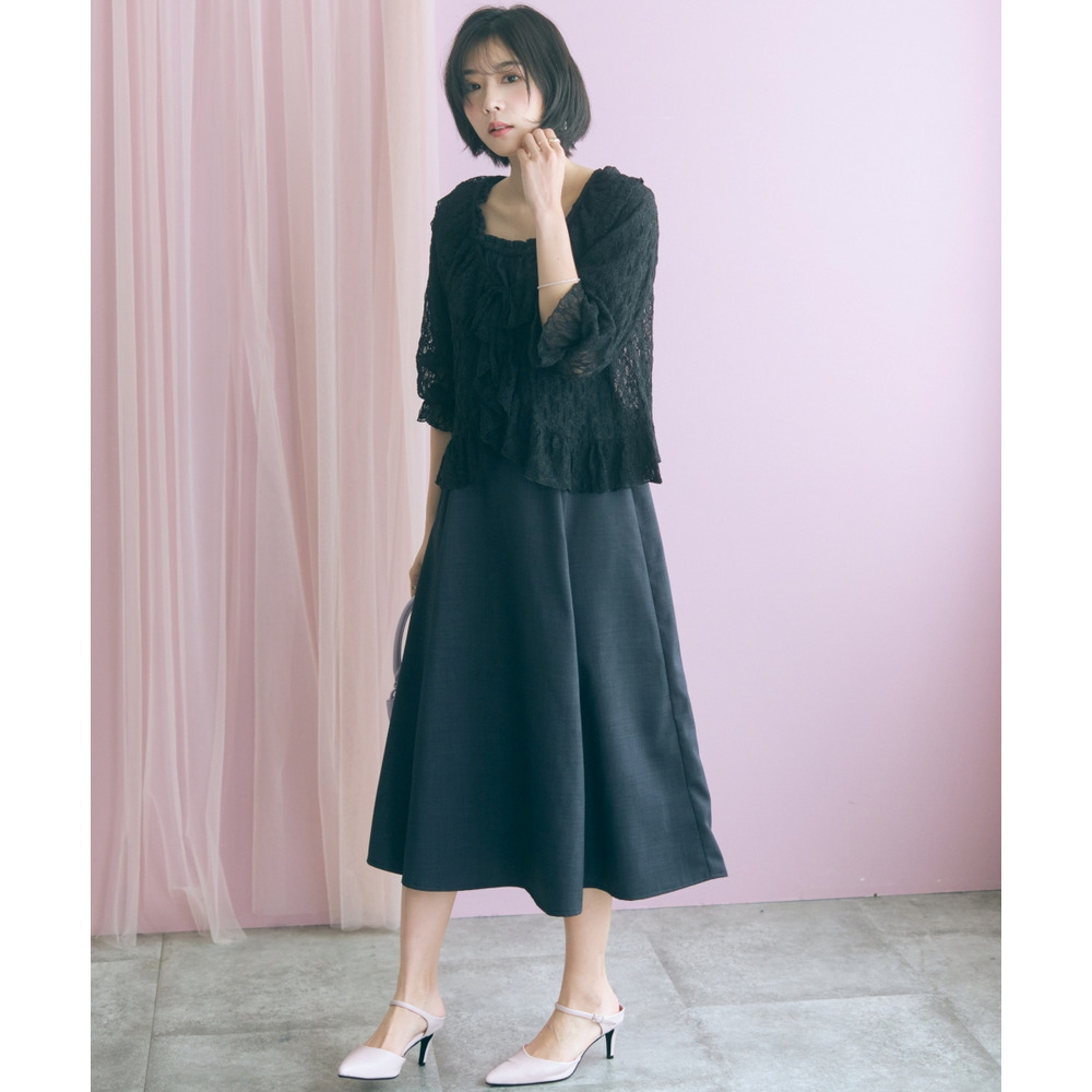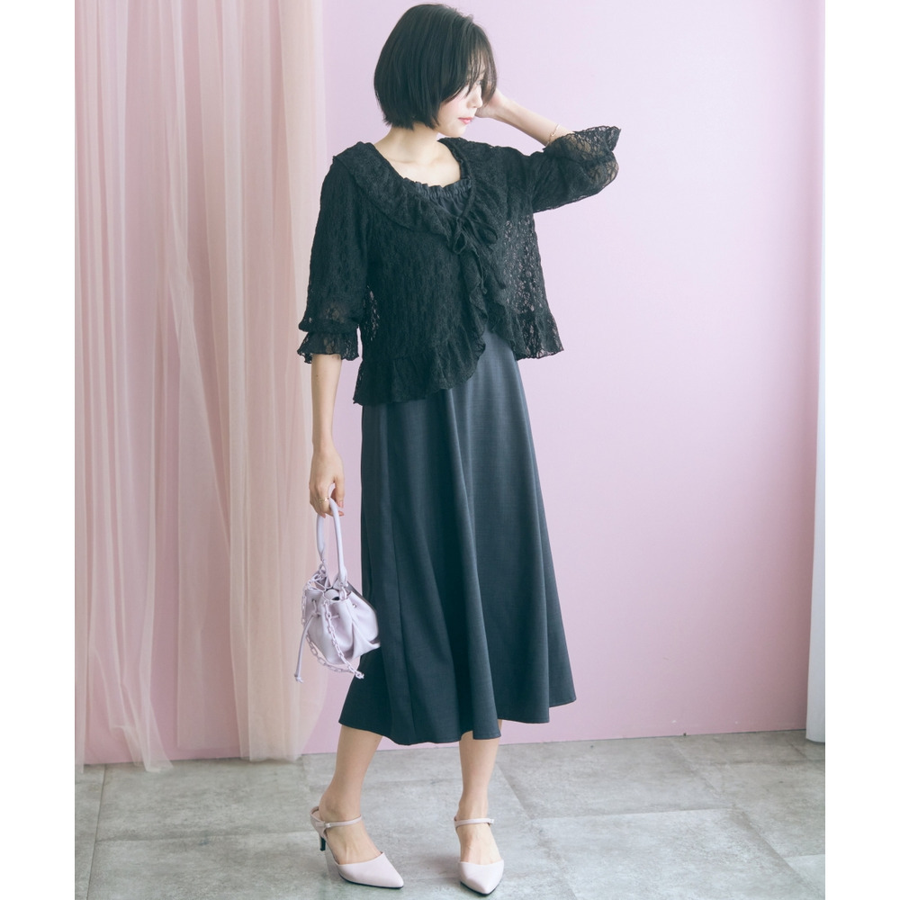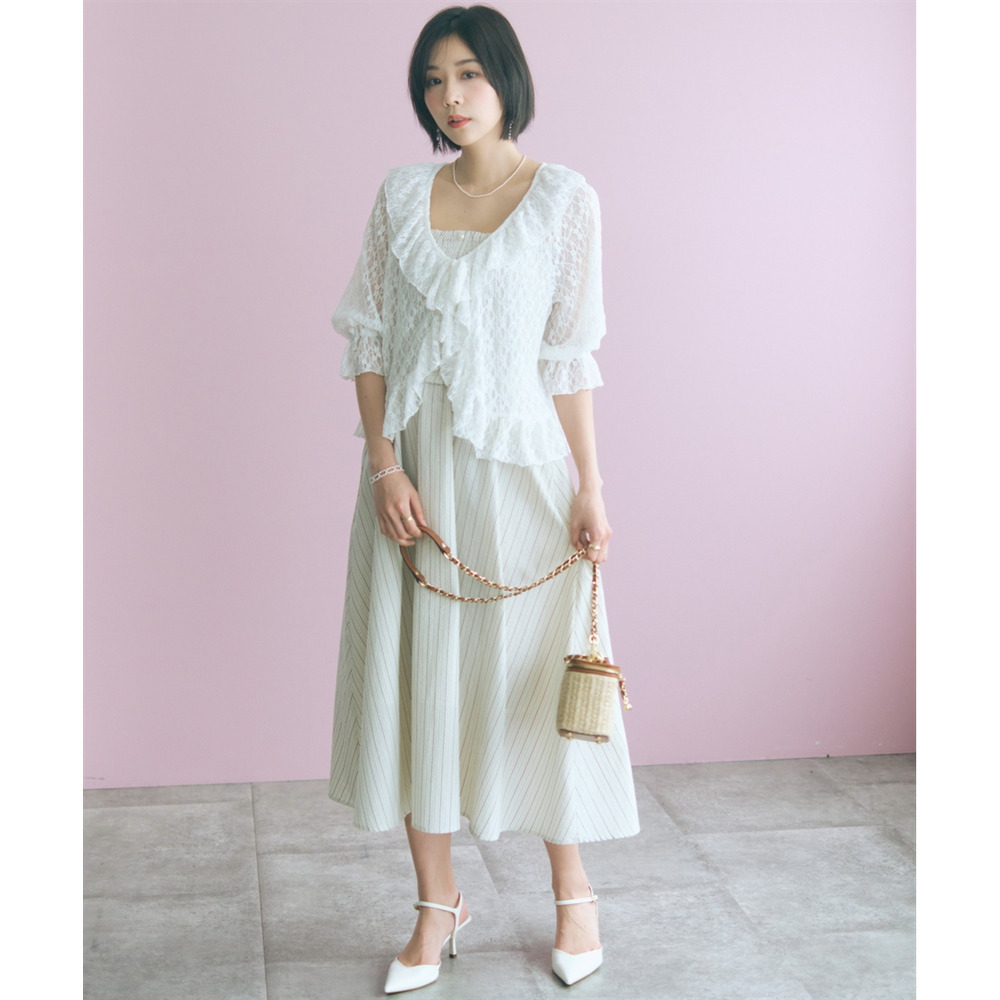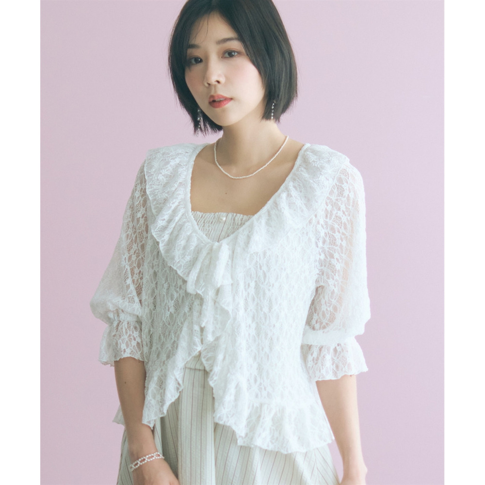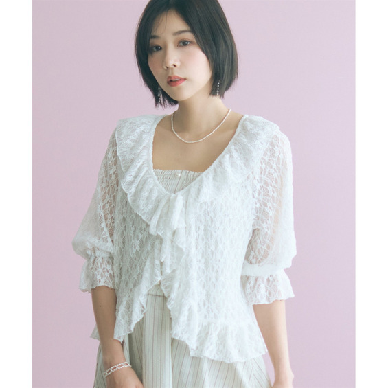 顔周りを華やかに縁取る大ぶりのボリューミーなフリルが、視線を上に集めて小顔効果を発揮。