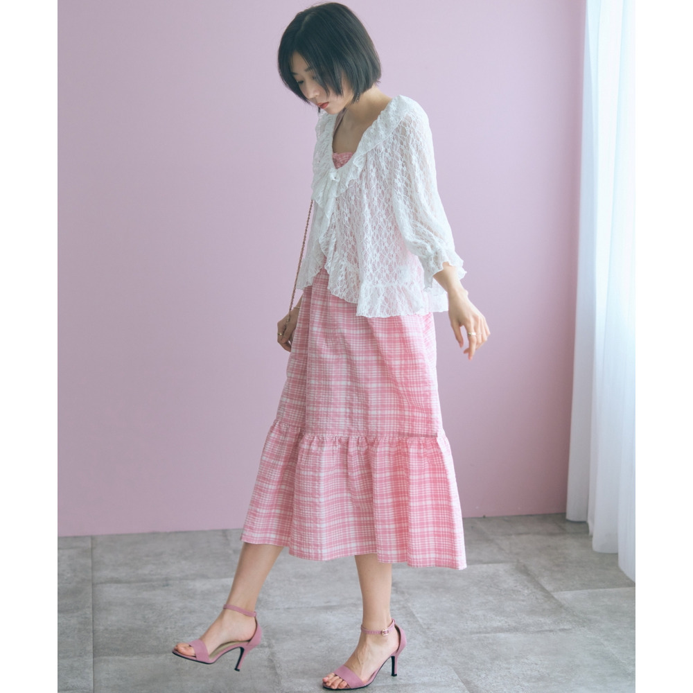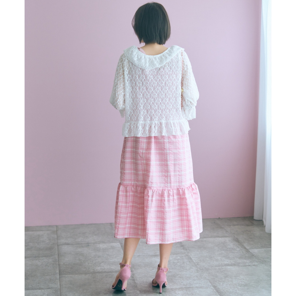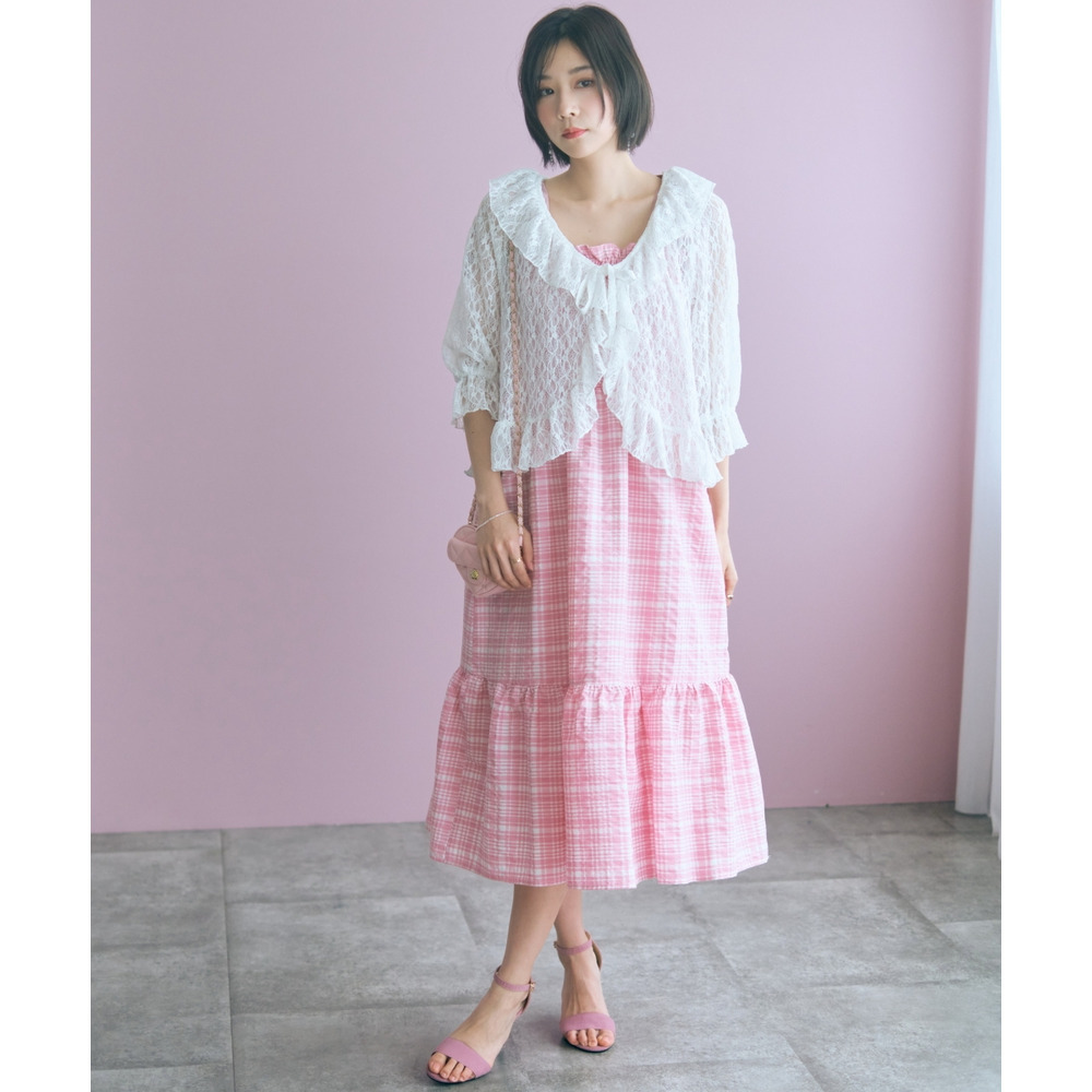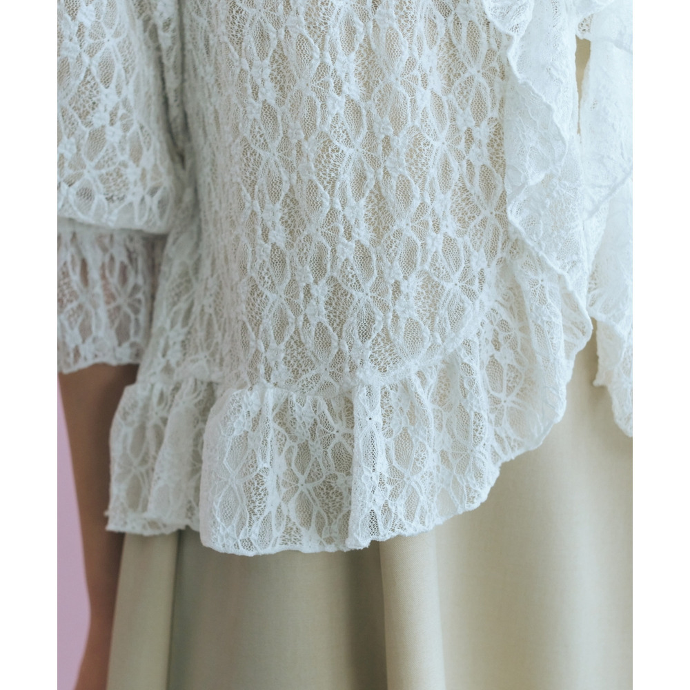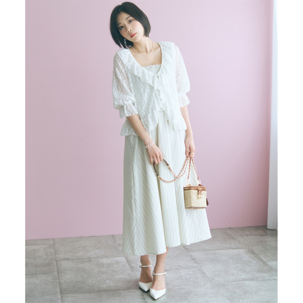 顔周りを華やかに縁取る大ぶりのボリューミーなフリルが、視線を上に集めて小顔効果を発揮。