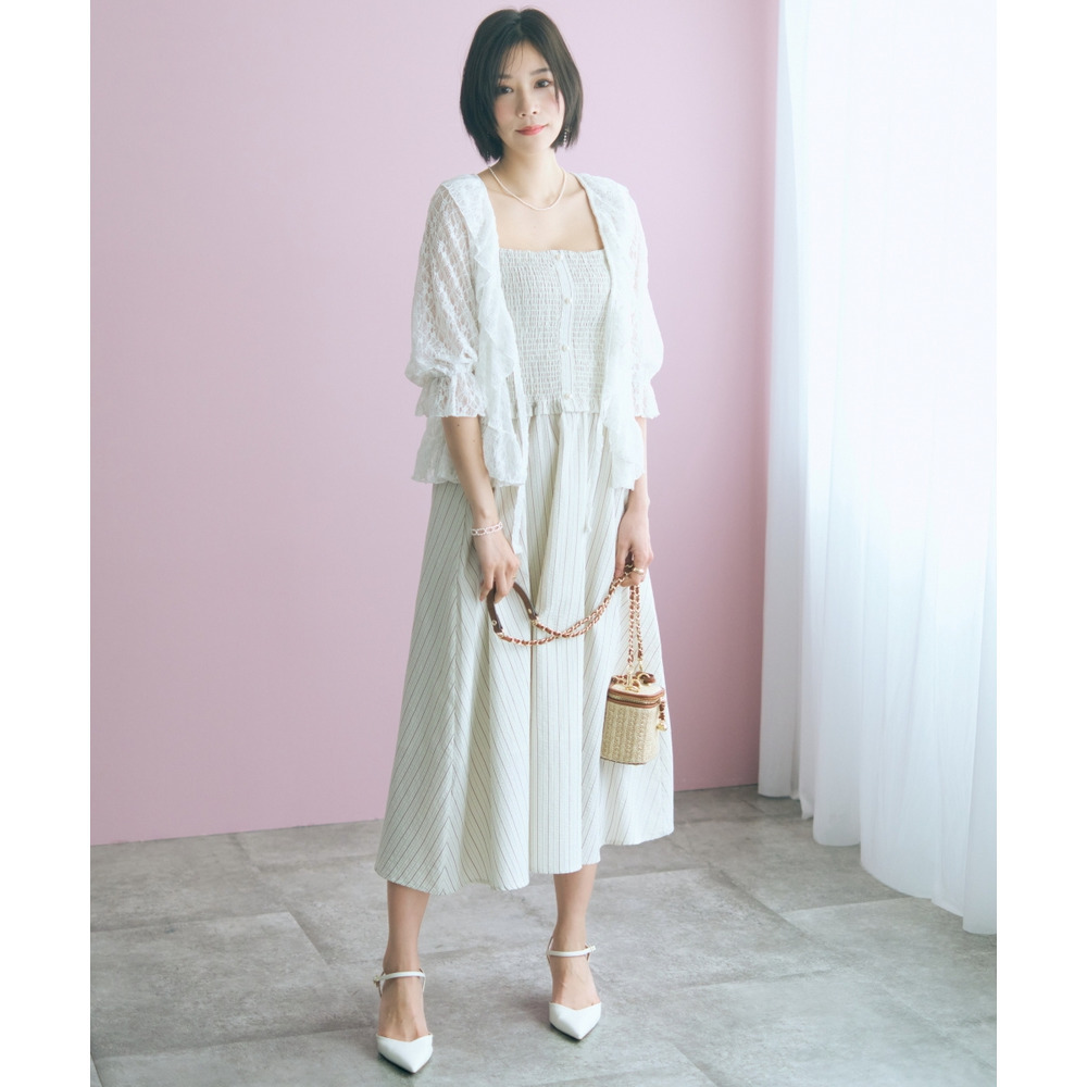 ノースリーブワンピースに重ねて上品な露出調整に。