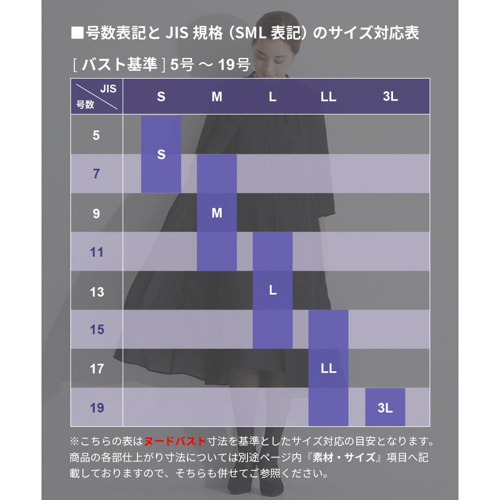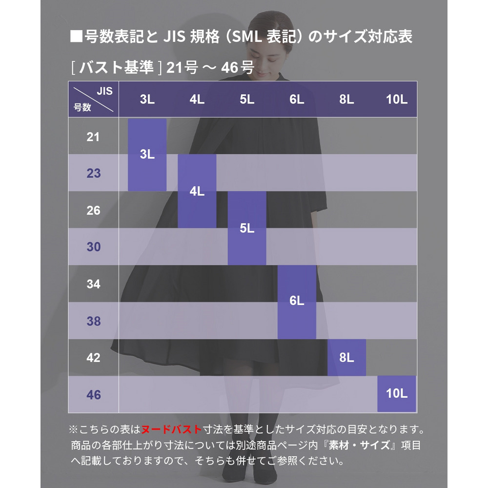 サイズ表記 L LL 3L 4L 5L 6L ワンピースバスト 133 144 152 158 164 174 ワンピース裄丈 74 75 76 77 78 79 ワンピース着丈 101 102 103 104 105 106 ワンピース裾廻り 109 120 128 134 104 150 ワンピース裾廻り(裏地) 110 122 130 136 142 152 パンツウエスト 78 84 90 96 102 112 パンツヒップ 106 113 119 125 131 141 パンツ股下 65 65 65 65 65 65 パンツ前股上 27 29 30 31 32 34 パンツ渡り幅 34 38 39 41 43 46 パンツ裾幅 17 18 19 19 20 21