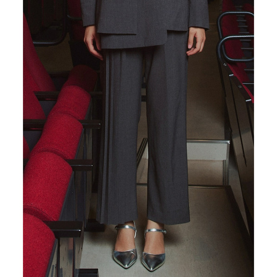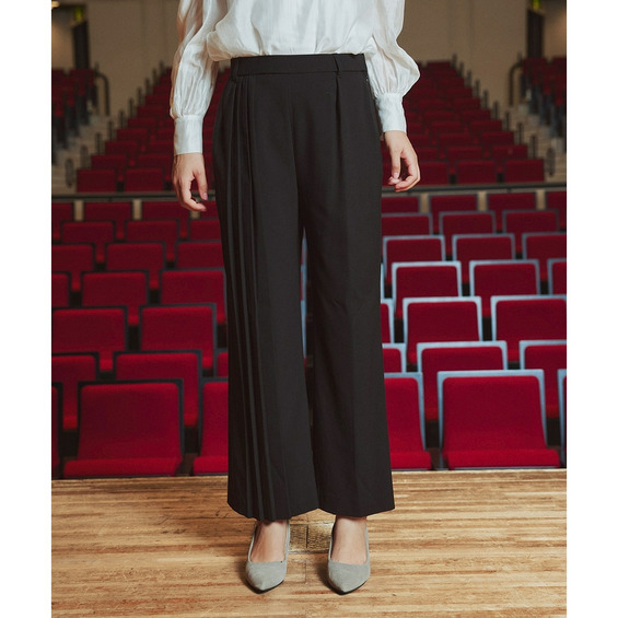 オケージョンシーンから普段使いまで、幅広く着まわせるアシメプリーツワイドパンツ
