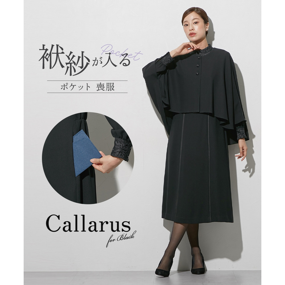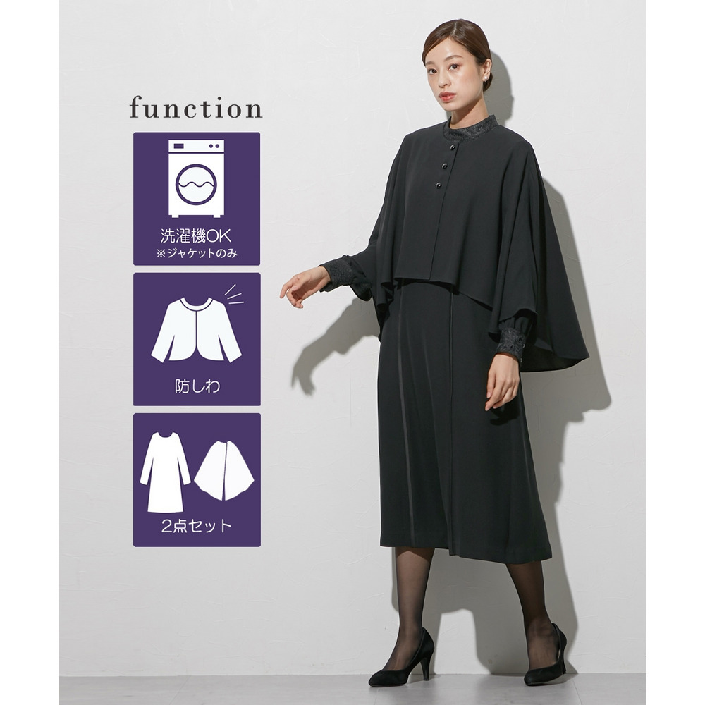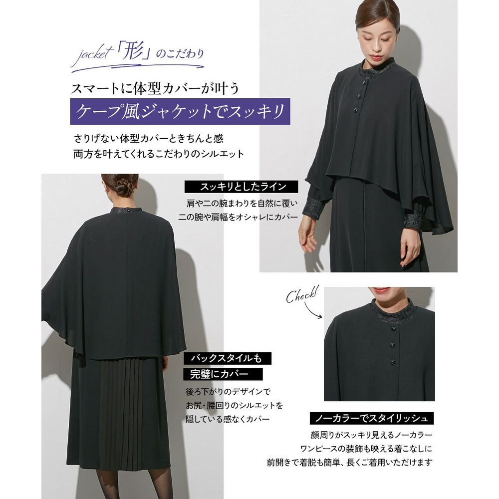 【喪服・礼服】袱紗も入るポケット仕様 防しわケープ風ジャケットバックプリーツデザインワンピースアンサンブル 大きいサイズ Callarus