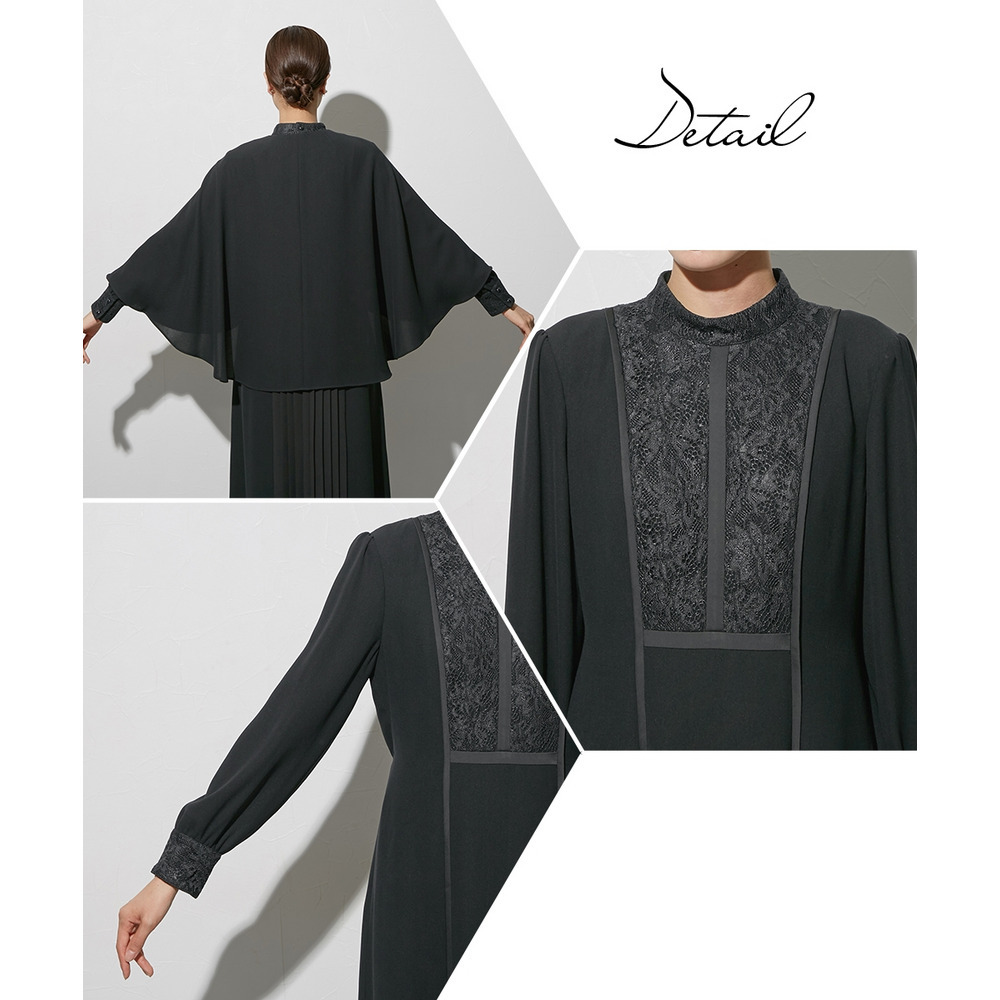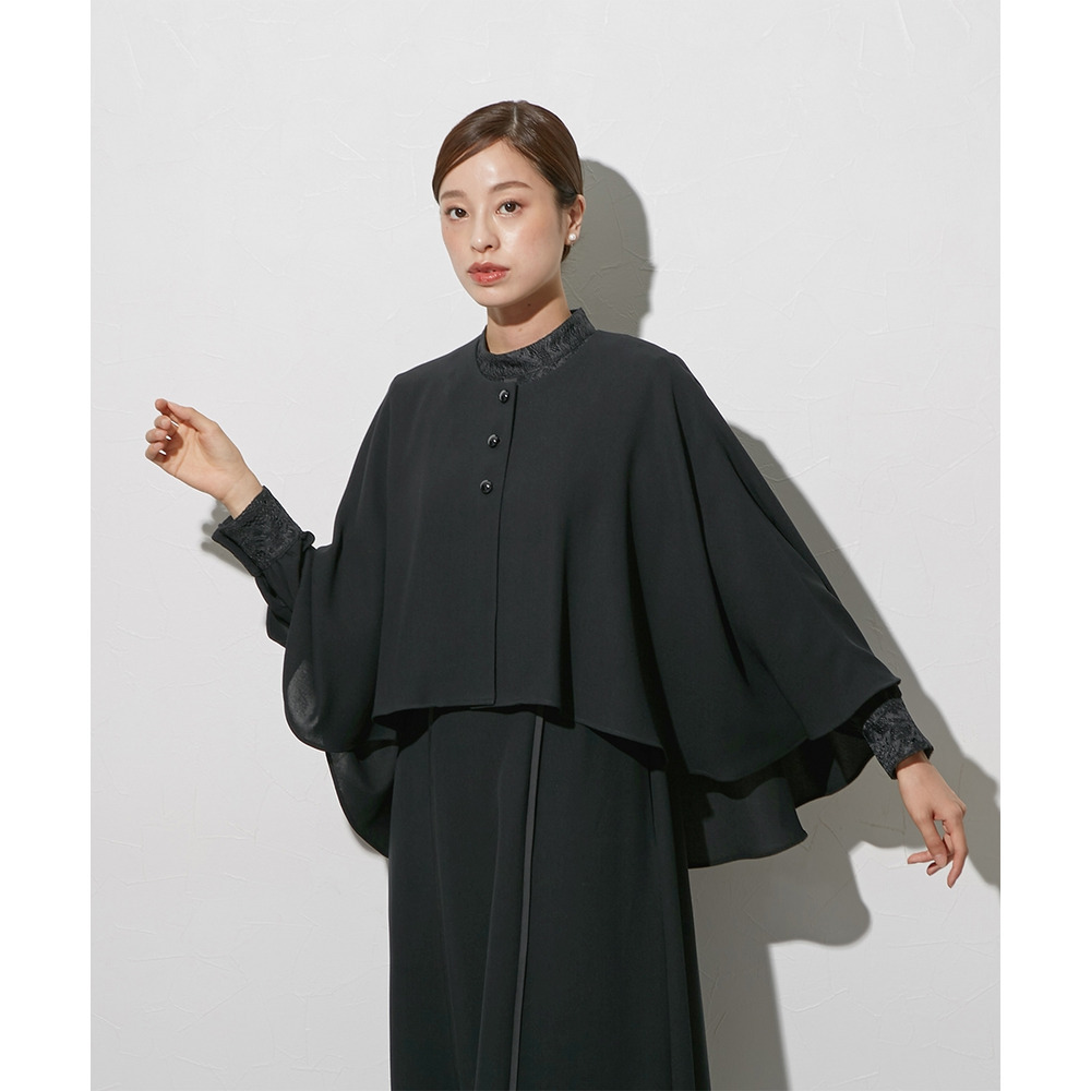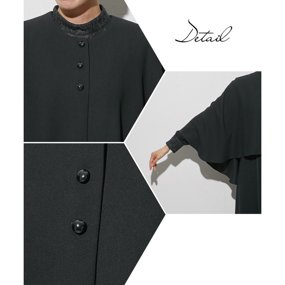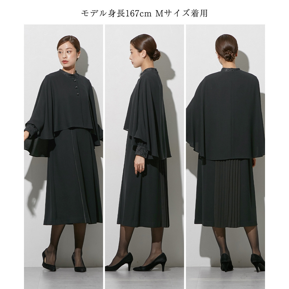 【喪服・礼服】袱紗も入るポケット仕様 防しわケープ風ジャケットバックプリーツデザインワンピースアンサンブル 大きいサイズ Callarus