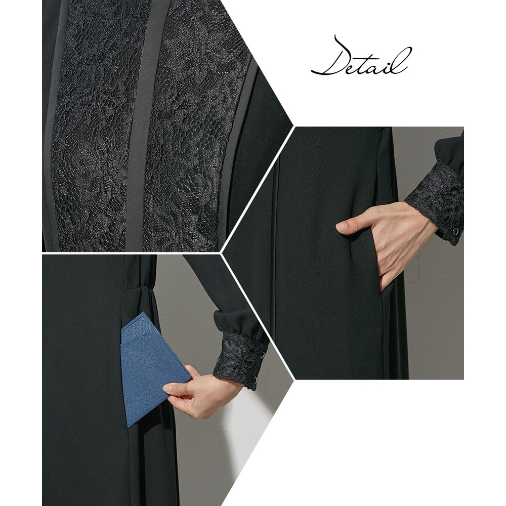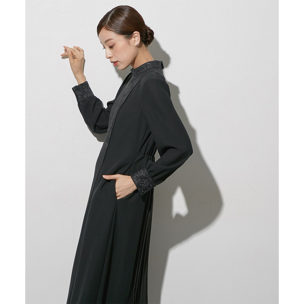 レースとサテン切替が、美しくてモードな雰囲気を演出<br>バックプリーツで、きれいな縦の流れを演出