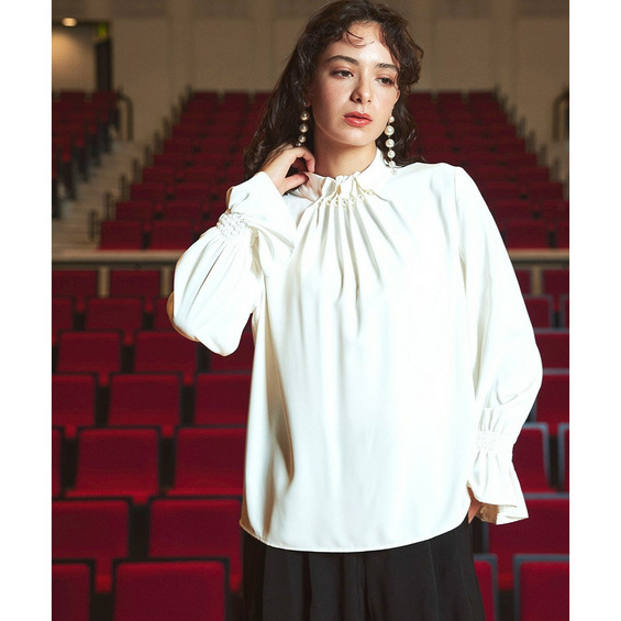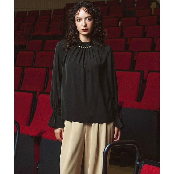 フロントタックデザインとパールの組み合わせが華やかな印象を演出してくれるデザインブラウス