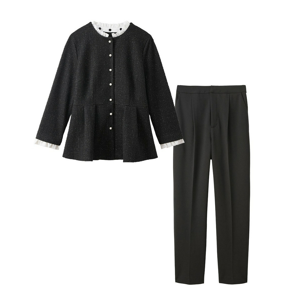 【入学式・卒業式・フォーマル】取り外せるフリル襟付カットツイードペプラムブラウス+ジャージーテーパードパンツセット 大きいサイズ Callarus