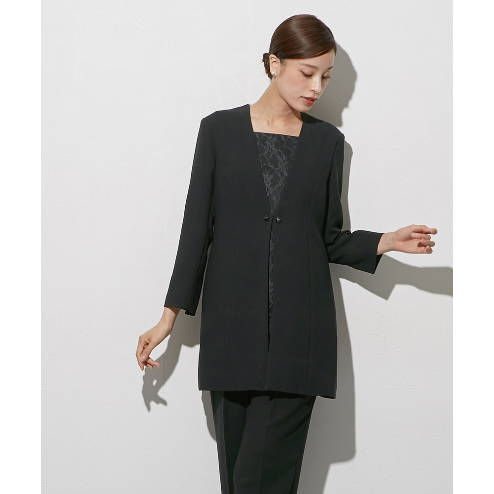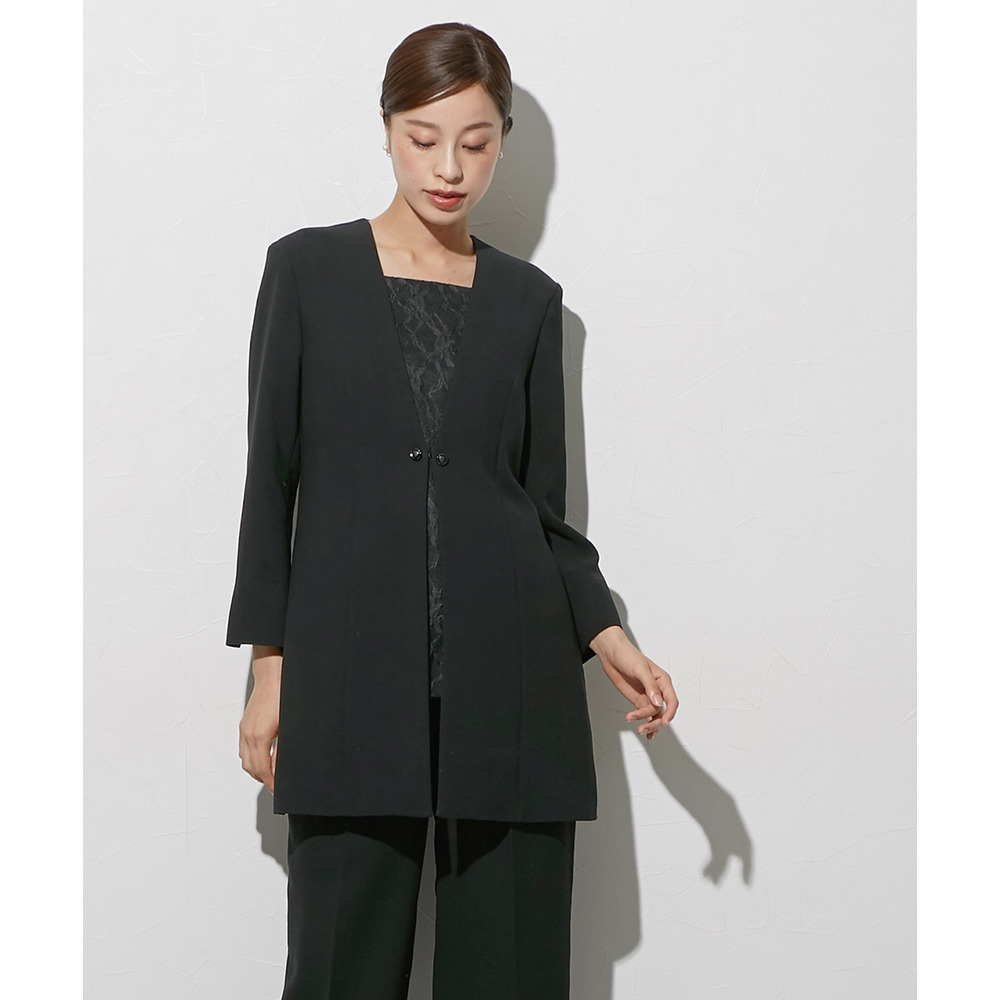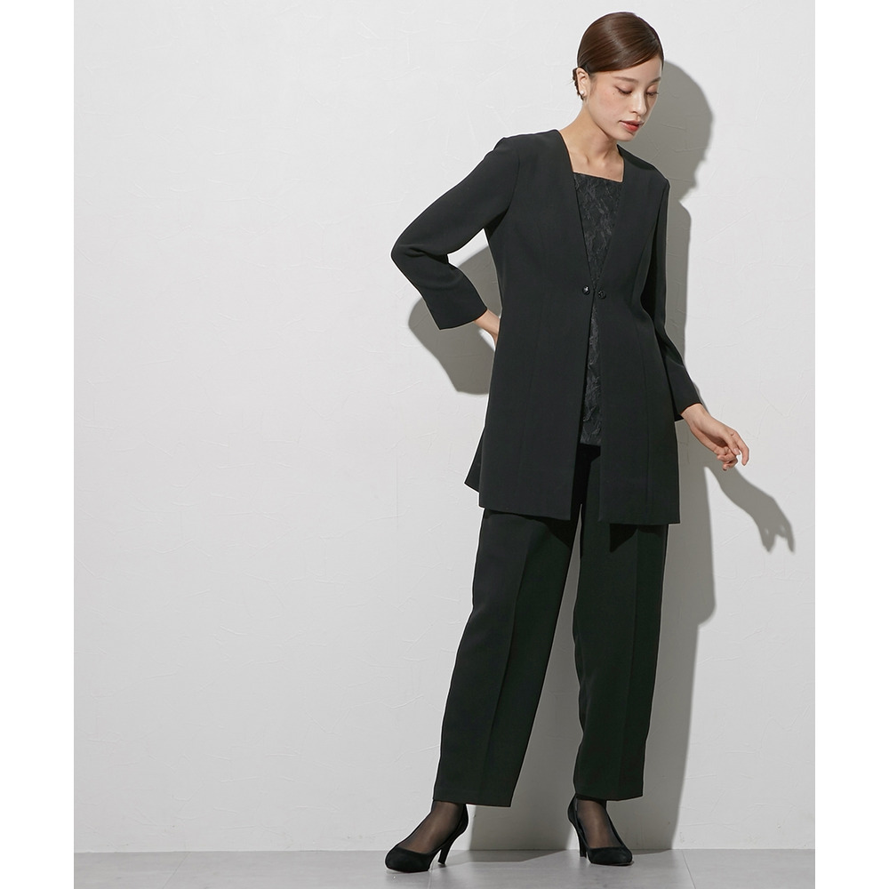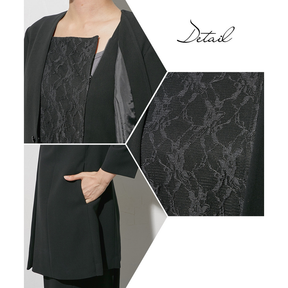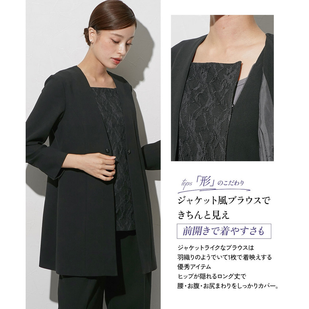 【喪服・礼服】袱紗も入る多ポケット仕様 日本製生地使用レースインナードッキングロングジャケット風ブラウス+パンツスーツセット 大きいサイズ Callarus