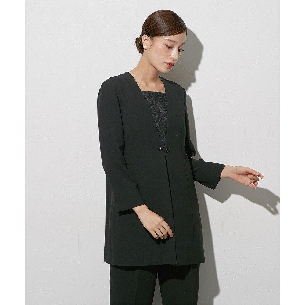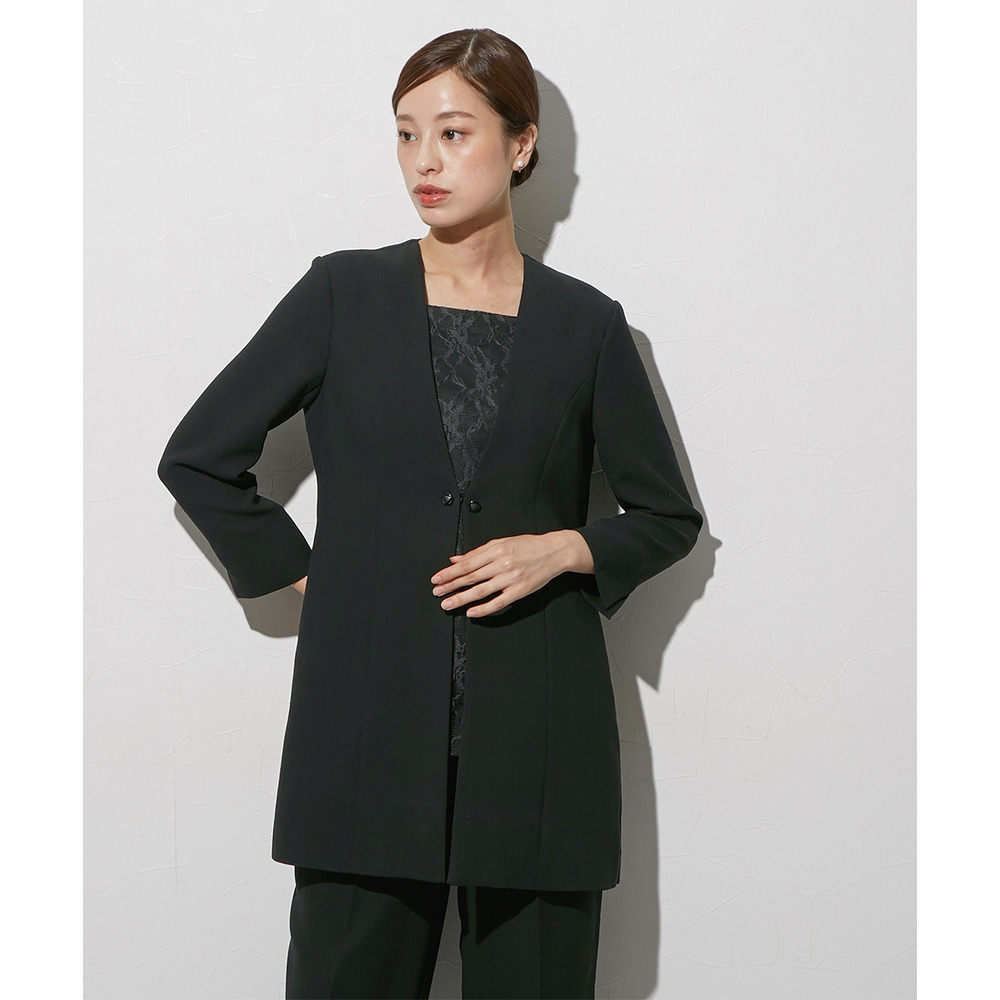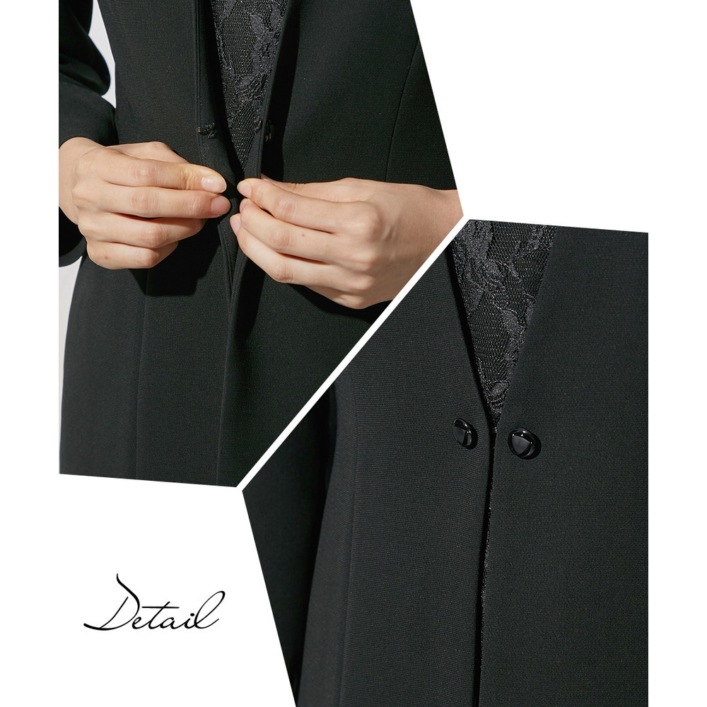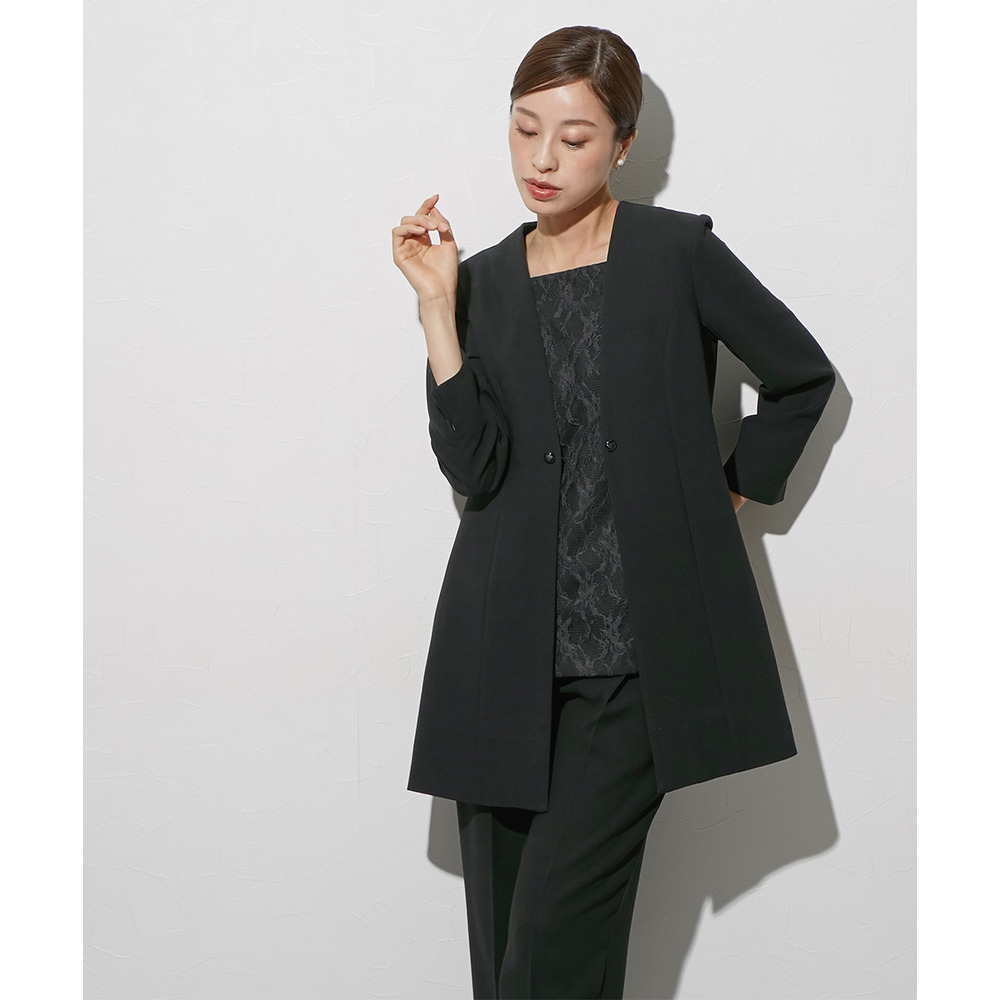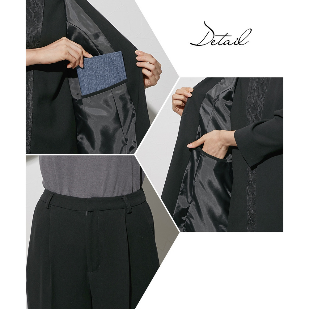【喪服・礼服】袱紗も入る多ポケット仕様 日本製生地使用レースインナードッキングロングジャケット風ブラウス+パンツスーツセット 大きいサイズ Callarus